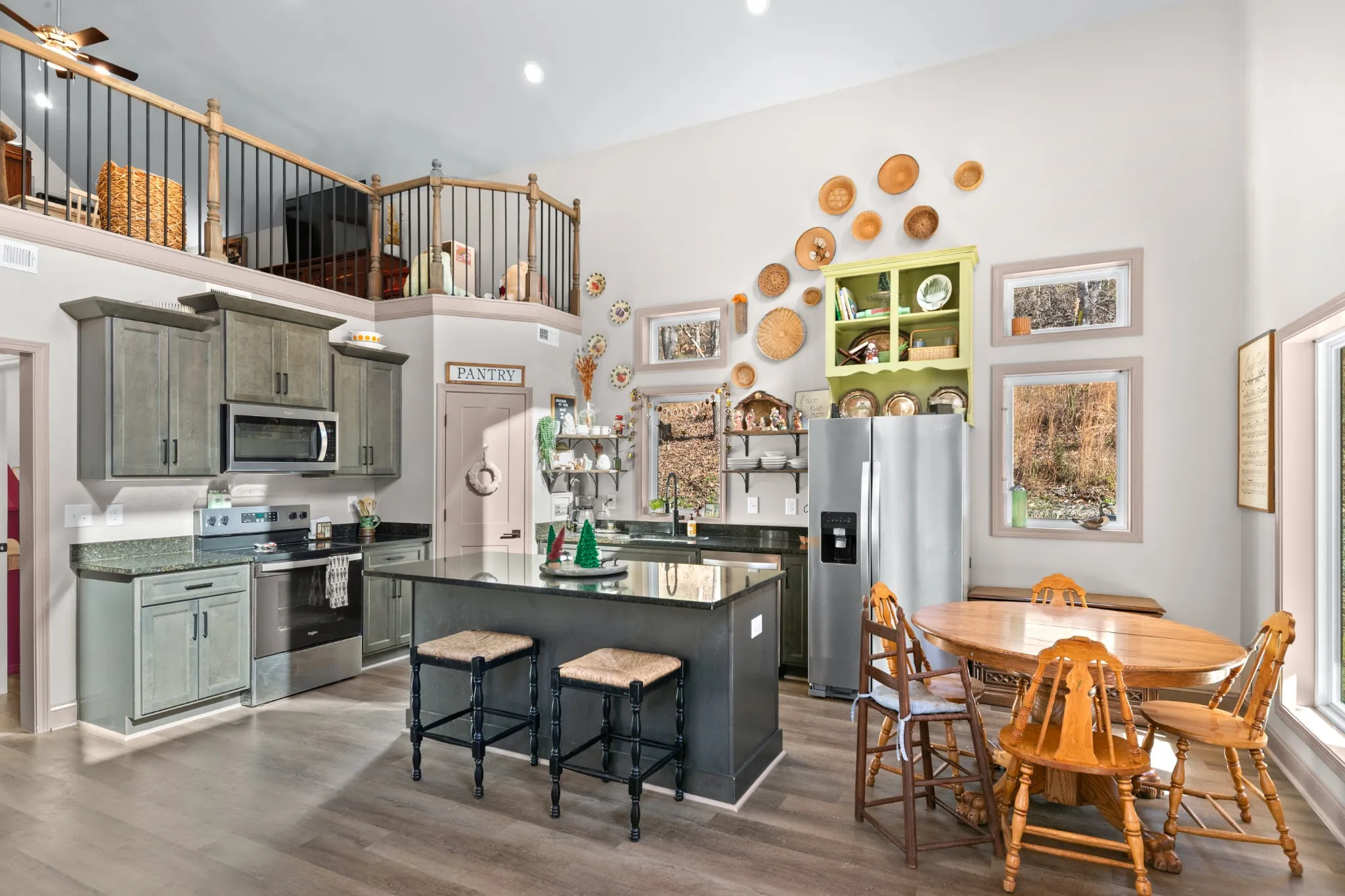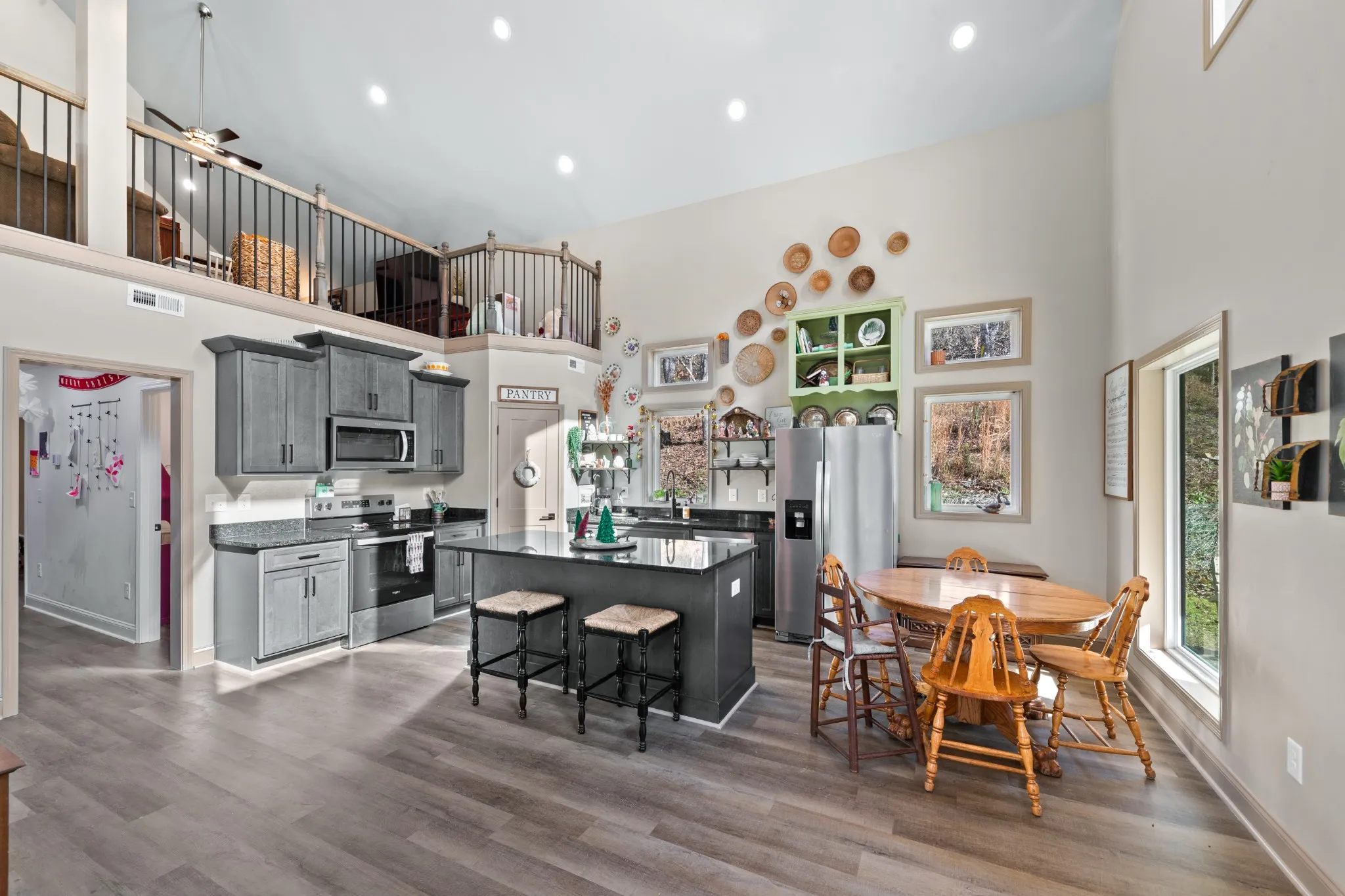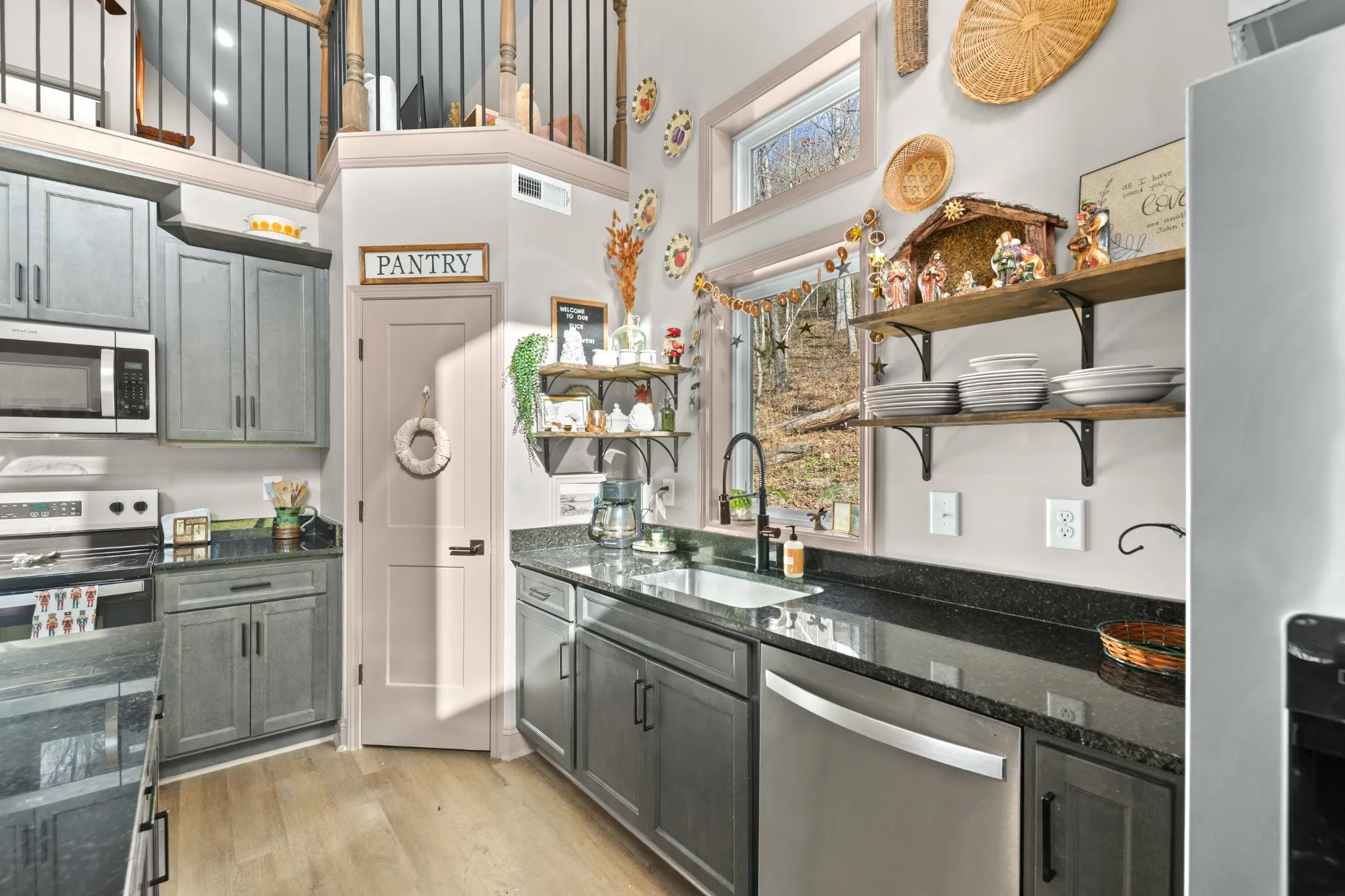 The kitchen checks every box with stainless steel appliances, dark cabinetry, gorgeous dark granite countertops, and a true walk-in pantry. The layout is equally functional with three bedrooms on the main level, each with crank-style windows, plus an upstairs loft and a full bath that make the perfect home office, media room, or guest retreat. One of the showstoppers is the staircase and loft railing, a beautiful mix of black iron and wood accents that gives the home a custom, high-end feel.