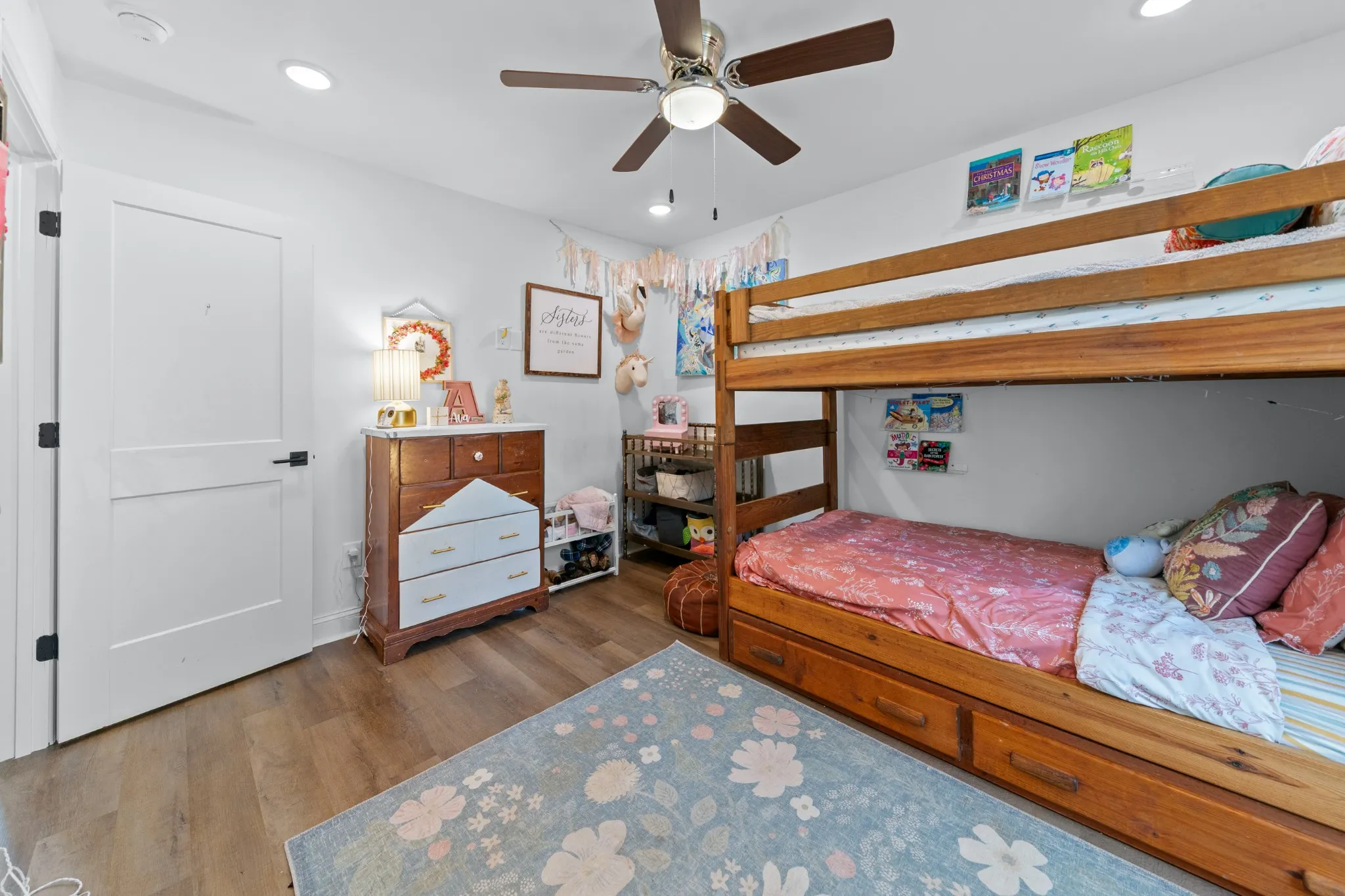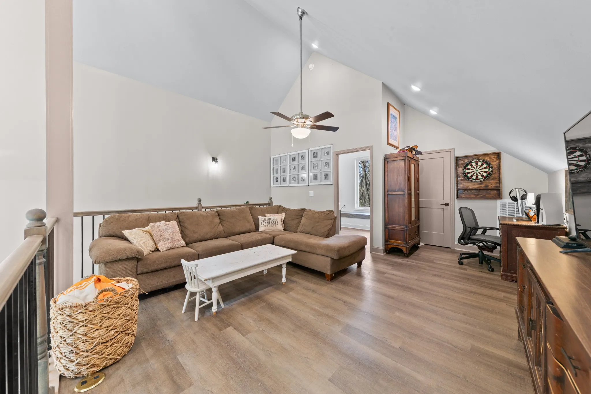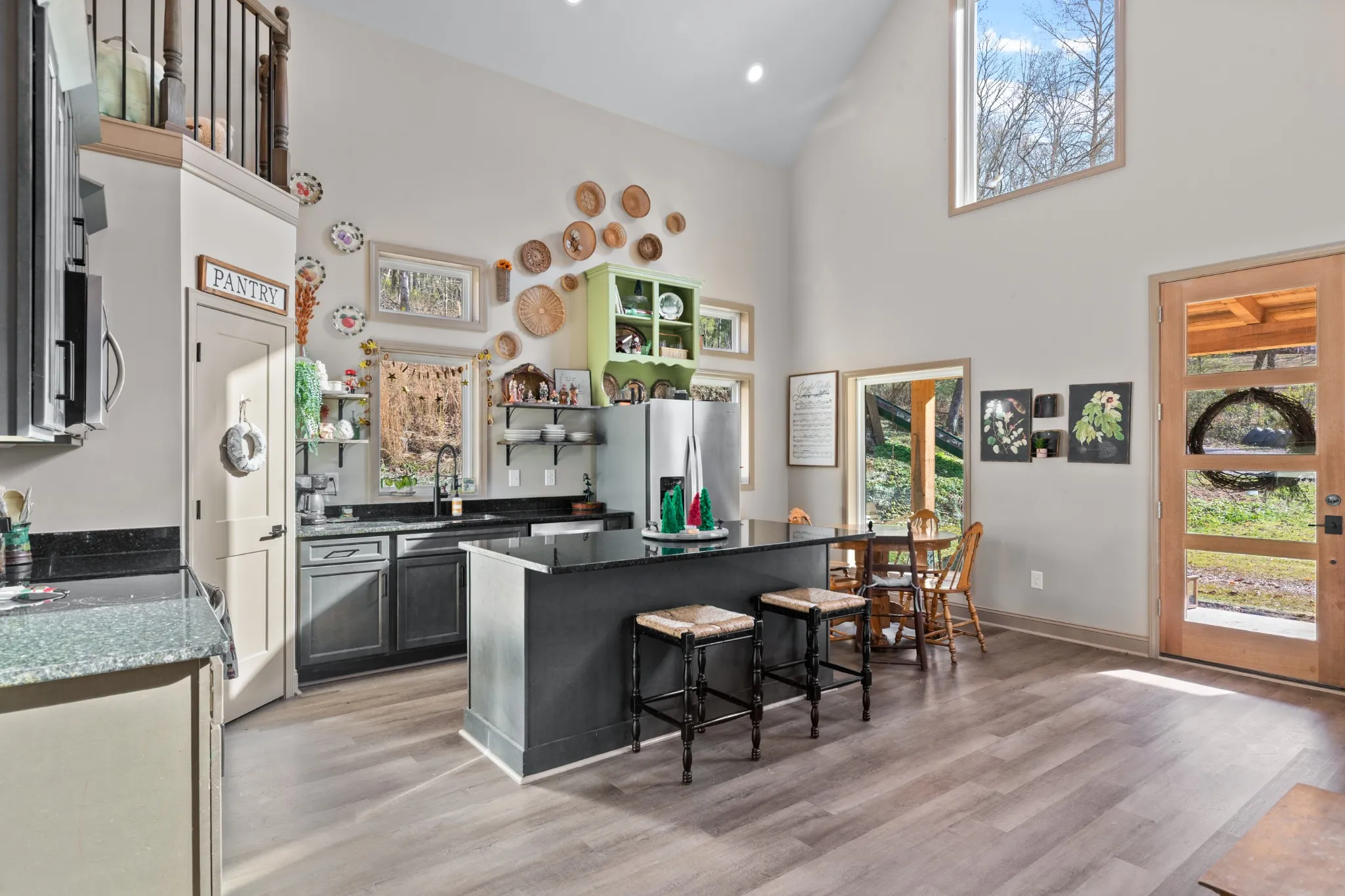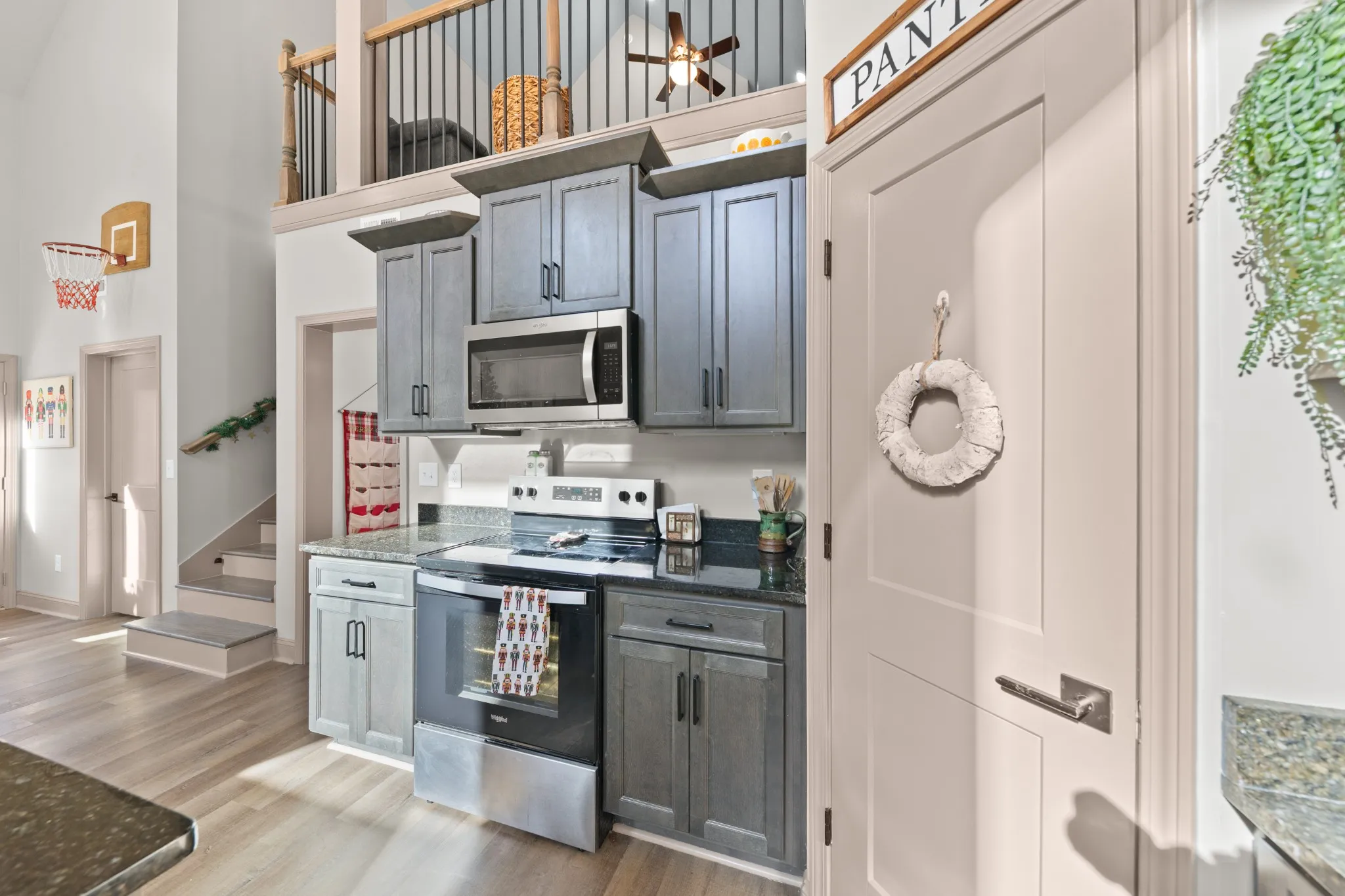 The kitchen checks every box with stainless steel appliances, dark cabinetry, gorgeous dark granite countertops, and a true walk-in pantry. The layout is equally functional with three bedrooms on the main level, each with crank-style windows, plus an upstairs loft and a full bath that make the perfect home office, media room, or guest retreat. One of the showstoppers is the staircase and loft railing, a beautiful mix of black iron and wood accents that gives the home a custom, high-end feel.