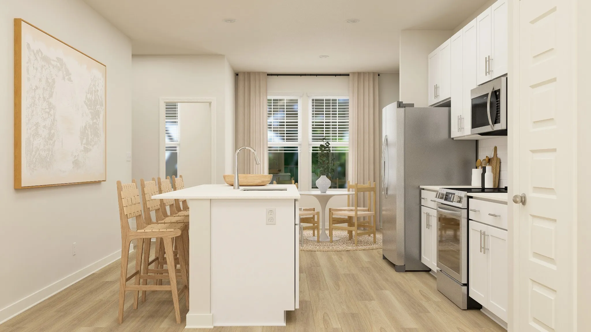 This Gatlinburg floorplan features a spacious great room, dining room, and kitchen for entertaining friends, with 2 bedrooms, 2 full baths, plus a half bath. The kitchen is designed with a huge island for seating, 42″ shaker style cabinetry, quartz tops, tile backsplash, and stainless steel kitchen appliances. A luxurious primary suite with ceramic tile floor, executive height cabinets, double vanity and quartz top, and oversized walk-in ceramic tile shower. Generously sized second bedroom with private bathroom. LVP flooring in main living areas, LVT in secondary baths and laundry. Luxurious features throughout! Ring doorbell, Schlage keyless entry, Honeywell WIFI thermostat, and more! 2″ faux wood blinds on operable windows and stainless steel refrigerator included!