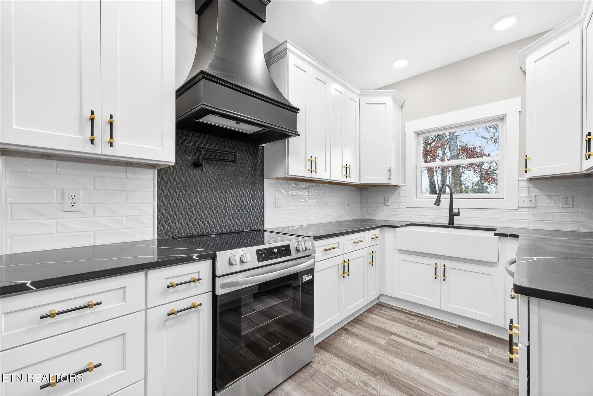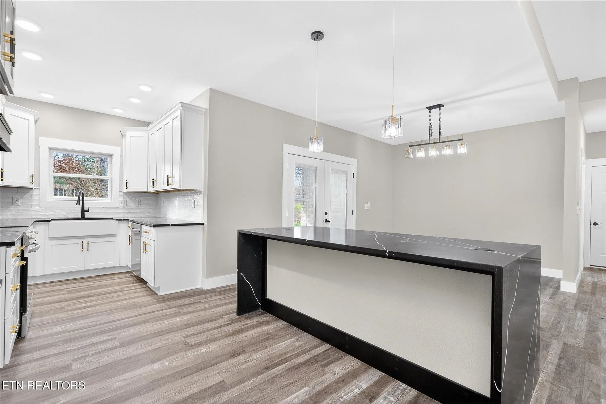 • Upscale kitchen with white & black shaker cabinetry, soft-close doors & drawers, quartz countertops, tile backsplash, pantry, pot filler, apron-front sink, stainless appliances, and a waterfall quartz island with counter seating\r\n
