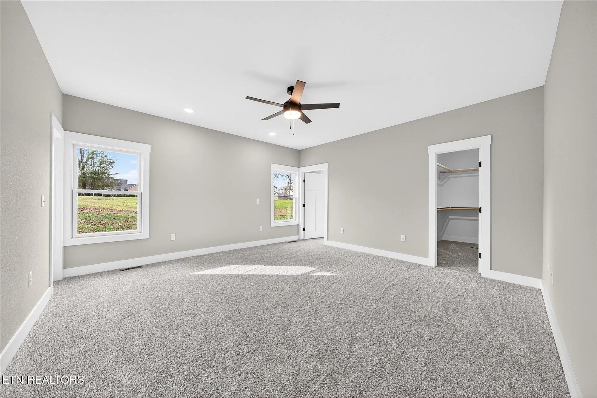 • Spacious primary suite with plush carpet, two walk-in closets, and spa-style bath featuring dual sink quartz vanity with lighted mirror, and tile walk-in shower with bench, niche, body sprayers, handheld, and glass surround\r\n