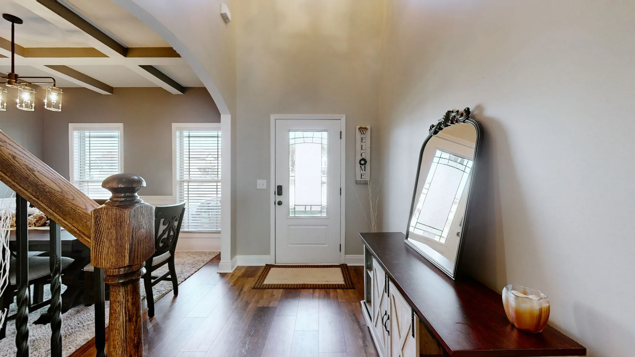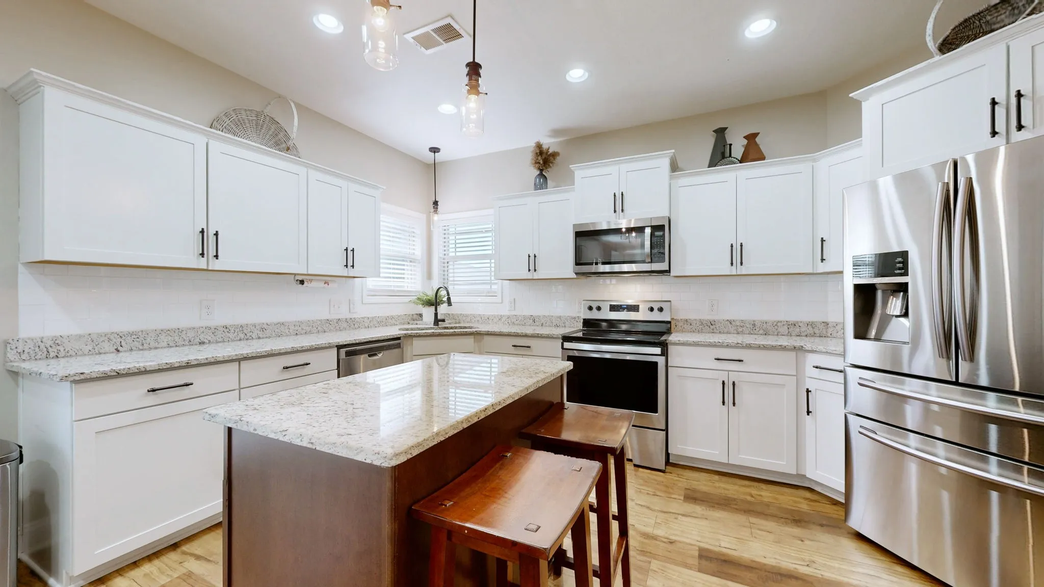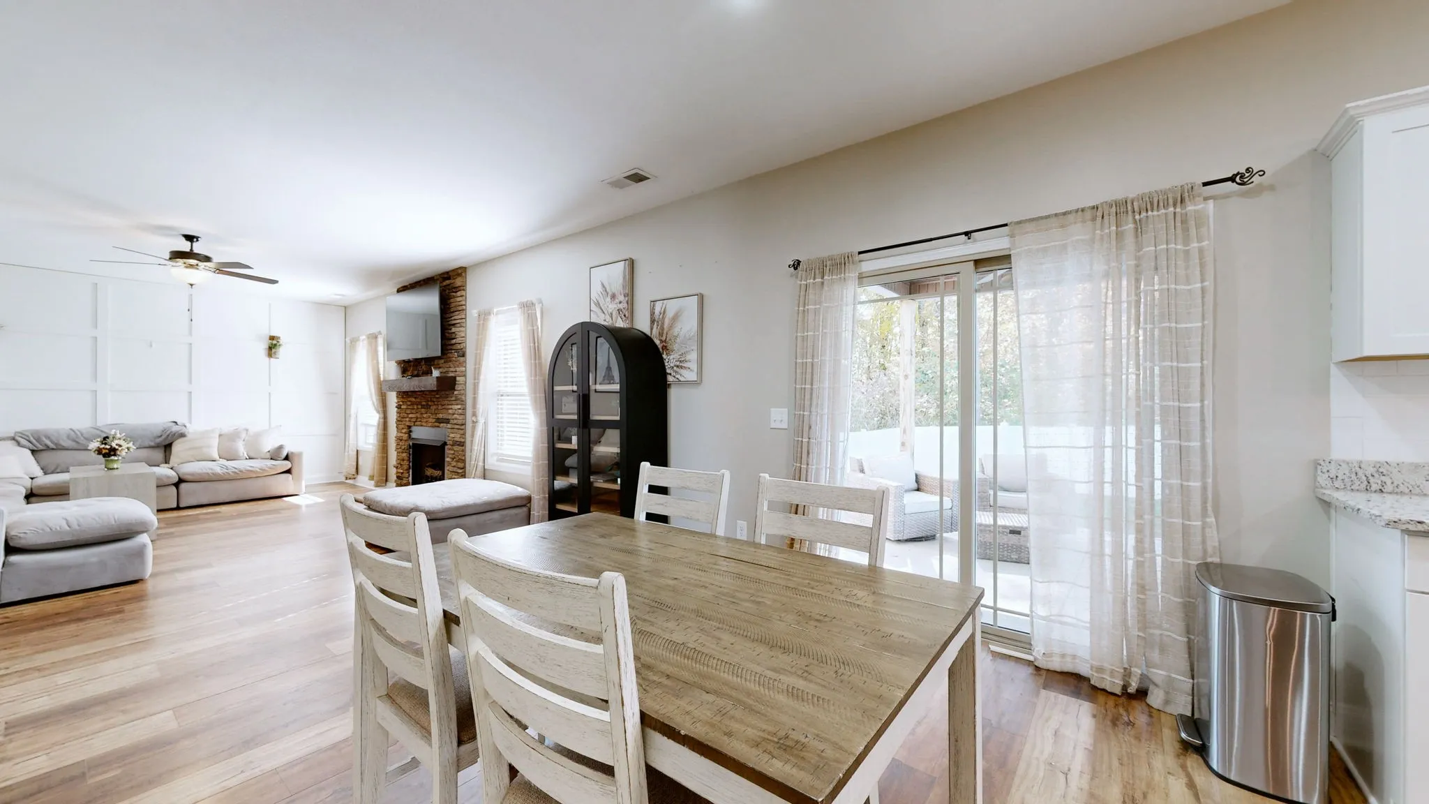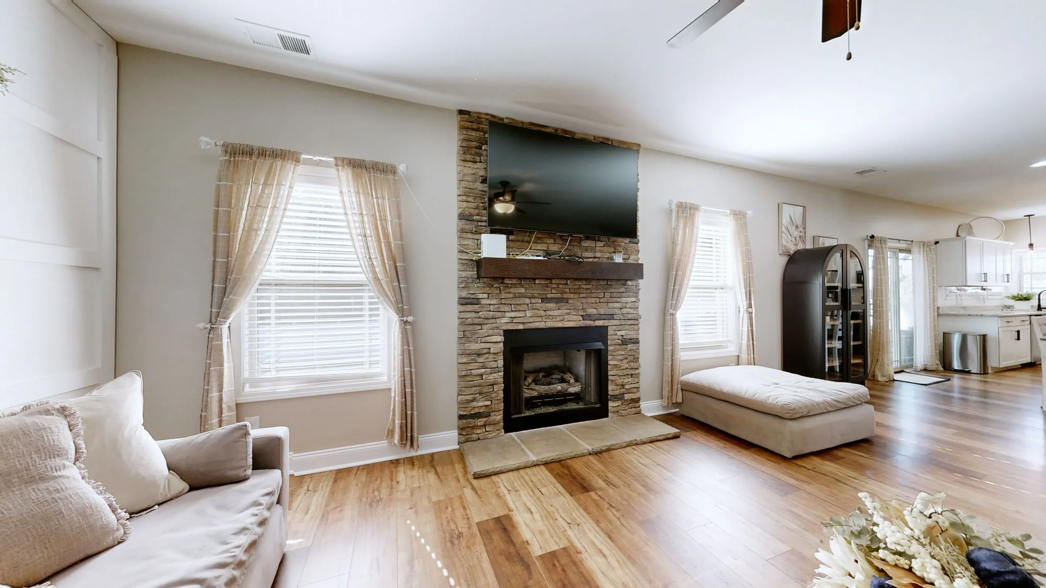 Modern elegance meets everyday comfort in this stunning 6-year-old home, perfectly situated in the heart of Sango on a quiet cul-de-sac. The open-concept layout flows effortlessly from the inviting living room—anchored by a beautiful stone gas fireplace—to the designer kitchen featuring granite countertops, a prep island, stainless steel appliances, and custom white cabinetry. The formal dining room makes a statement with elegant wainscoting and a striking accent ceiling.