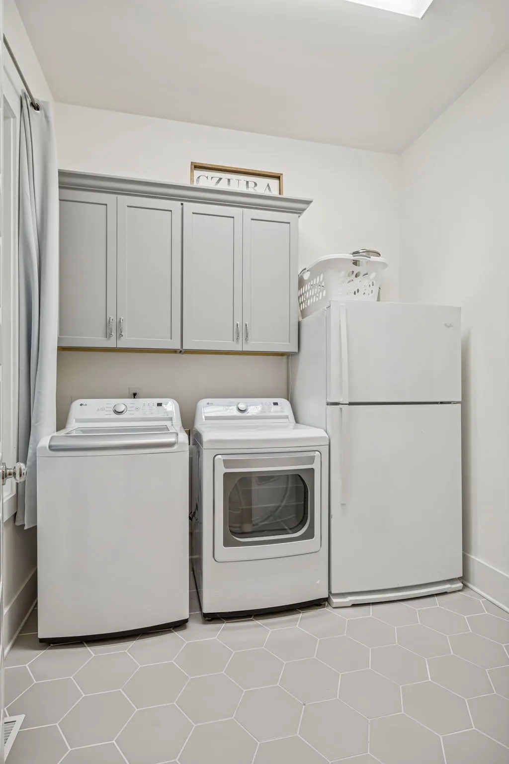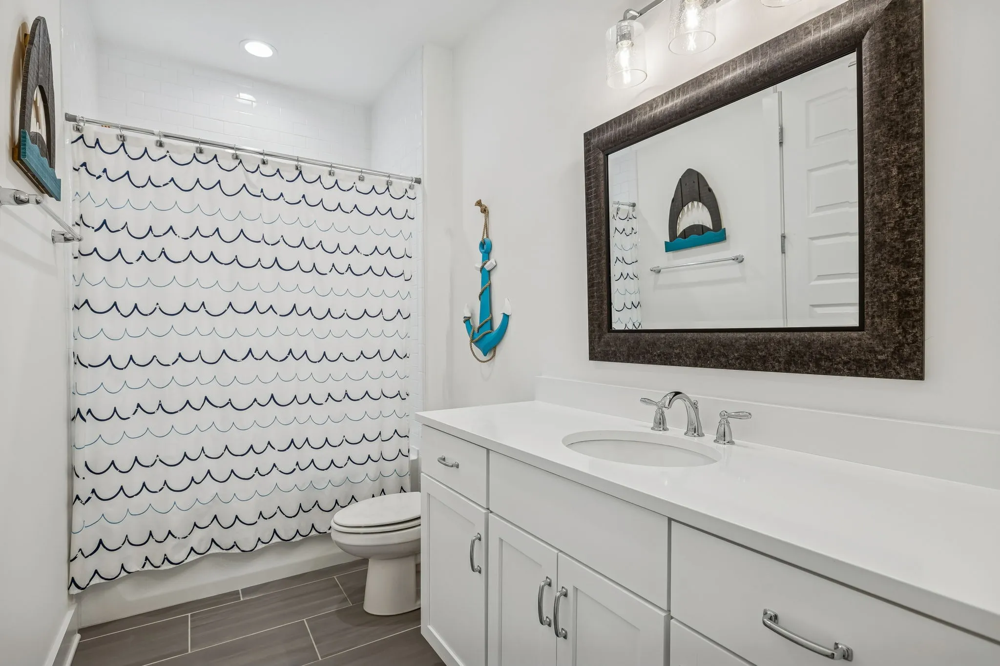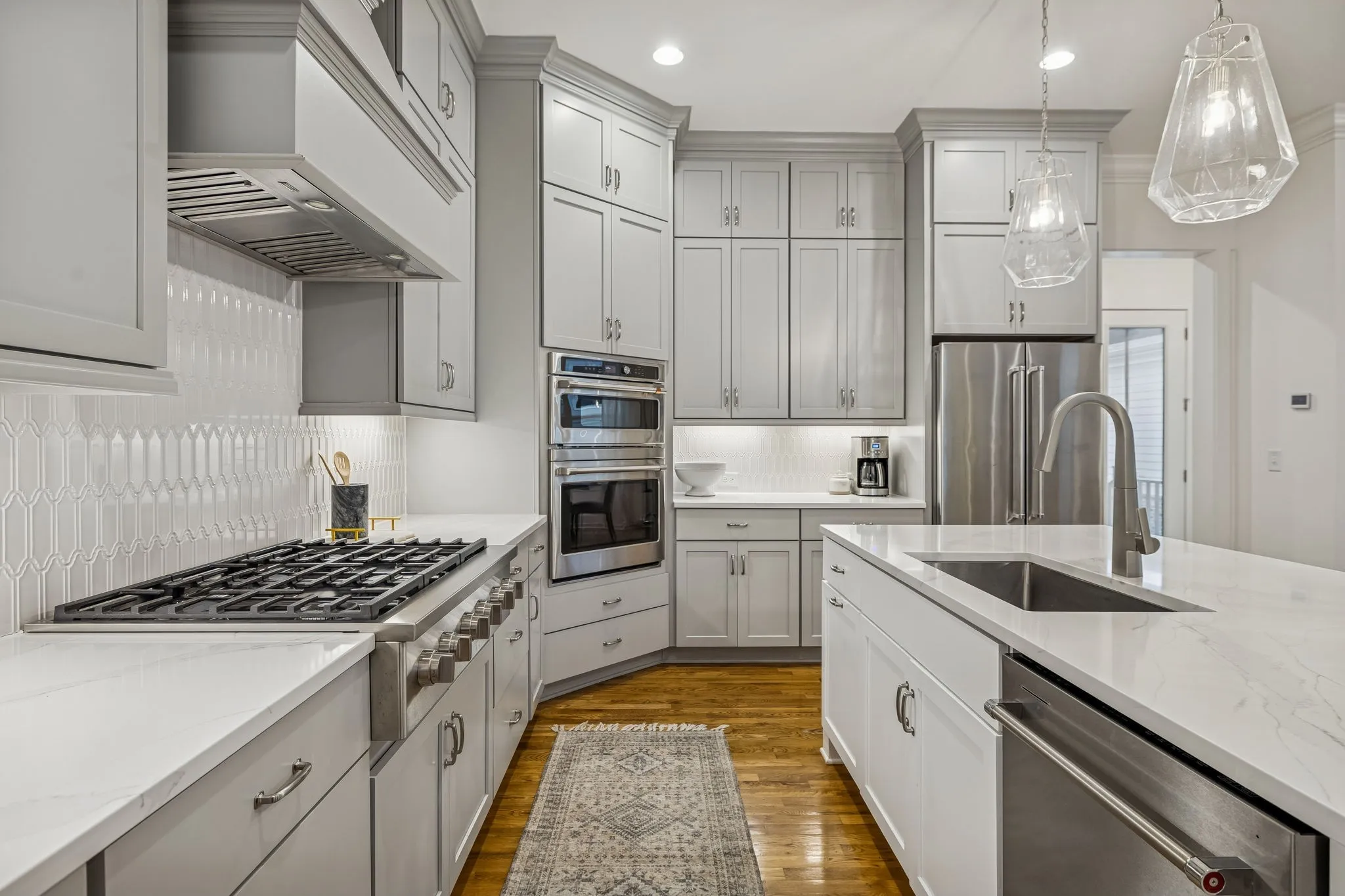 Step inside to discover a thoughtfully designed interior that features a spacious and airy layout. The heart of the home is the stylish kitchen, elegantly appointed with pristine pewter perimeter cabinets that beautifully contrast with the striking white island, creating an ideal space for culinary adventures and entertaining guests.\n
