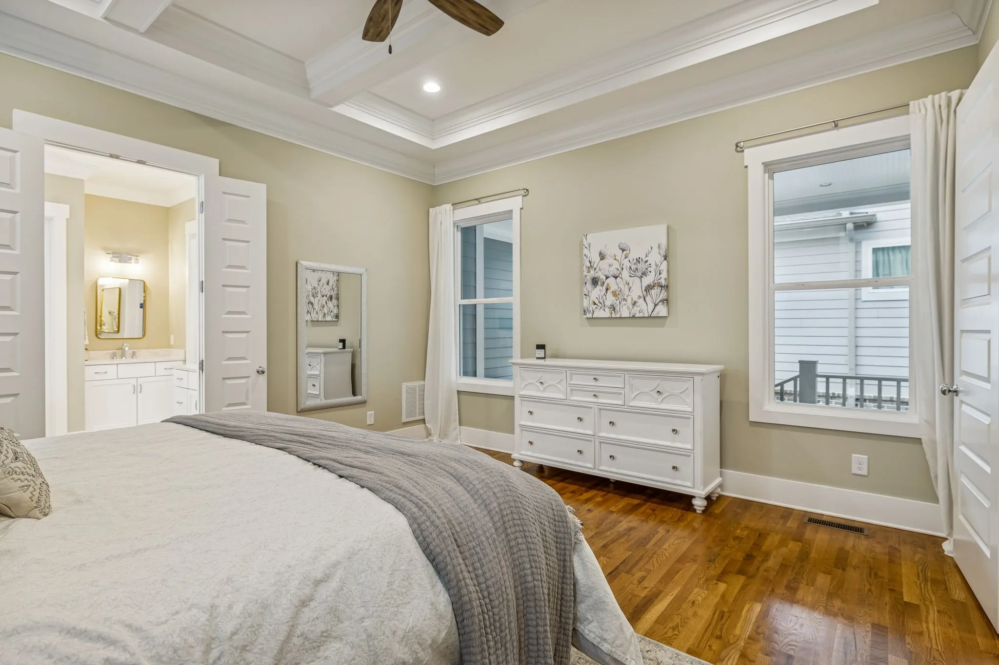The owner's suite, conveniently located on the main level, offers a private retreat with exquisite sanded and finished wood flooring, providing both warmth and sophistication. This serene space is designed for relaxation and comfort, ensuring a restful environment.\n