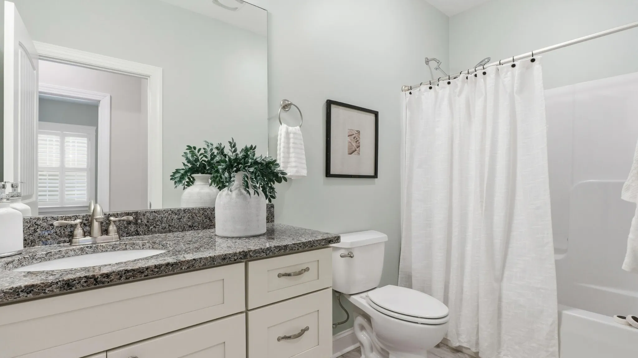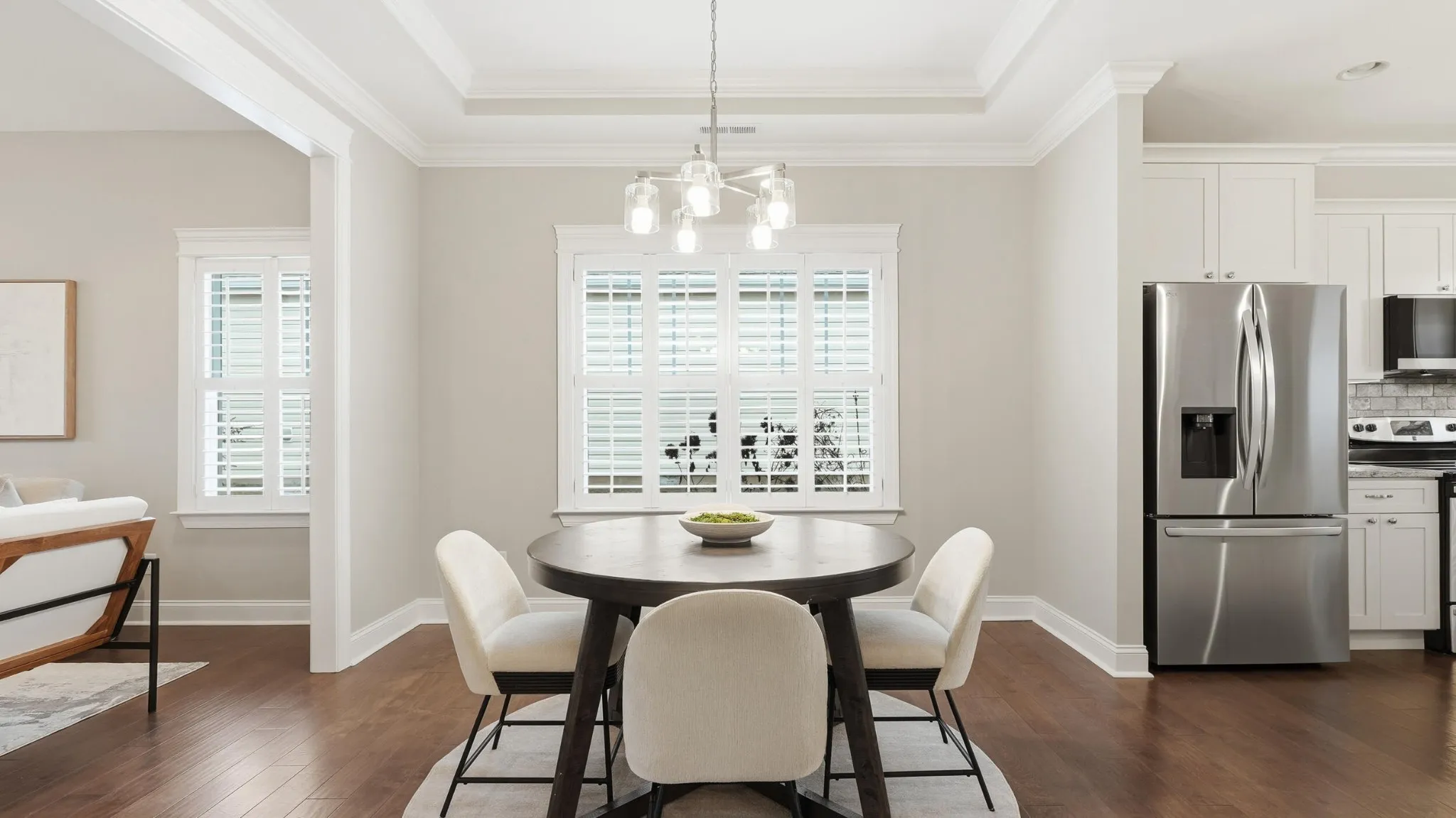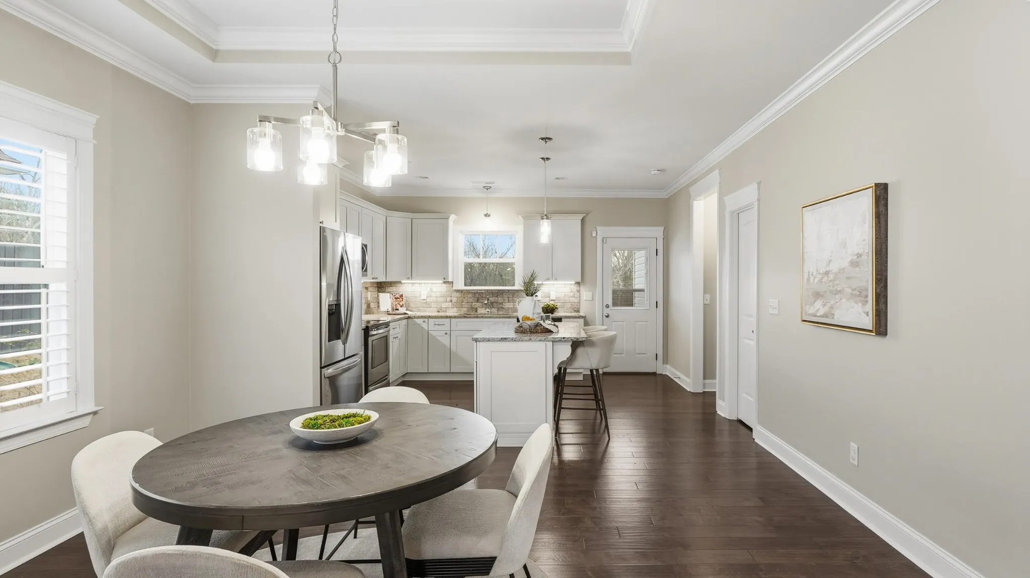 Inside, engineered hardwood floors anchor the main living spaces, complemented by ornate molding, plantation shutters, and a bright, open flow that feels both refined and comfortable. The kitchen features white cabinetry with granite countertops, offering timeless appeal and seamless connection to the living and dining areas—perfect for everyday living or entertaining guests.\r\n