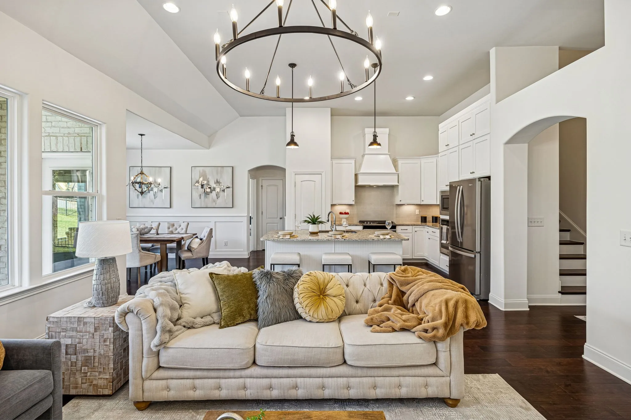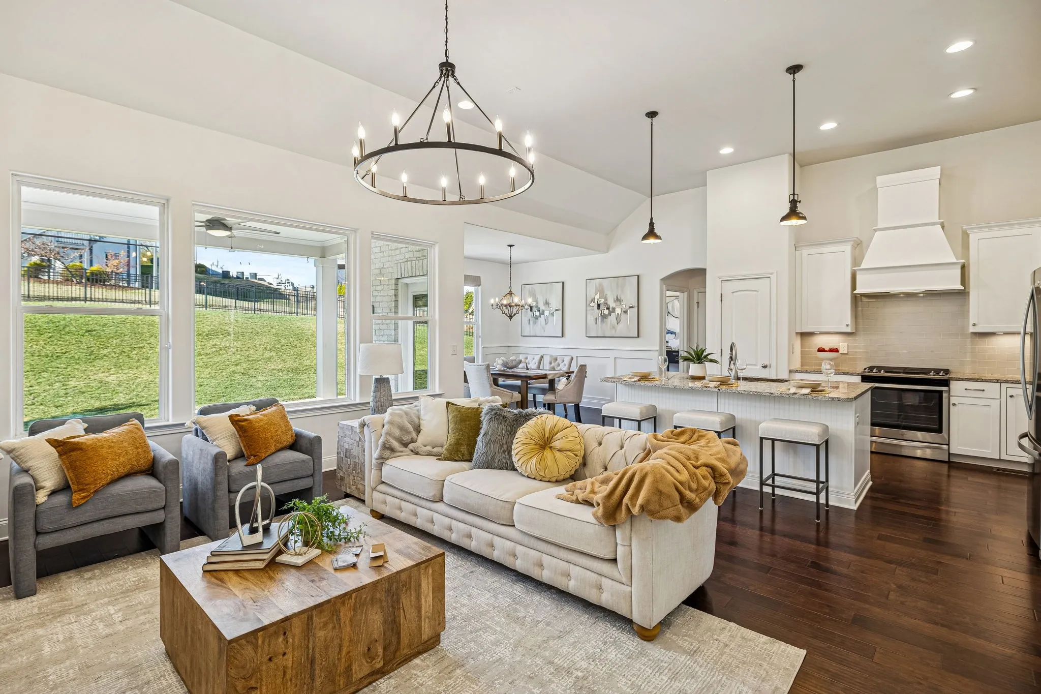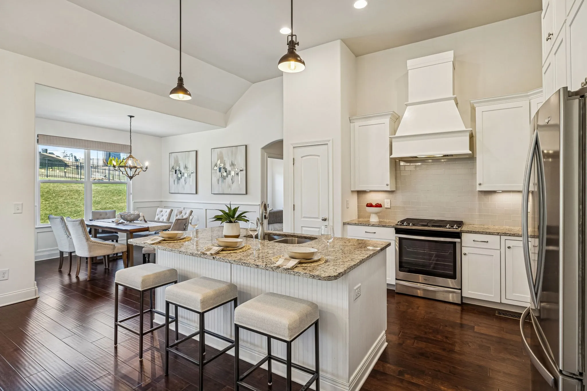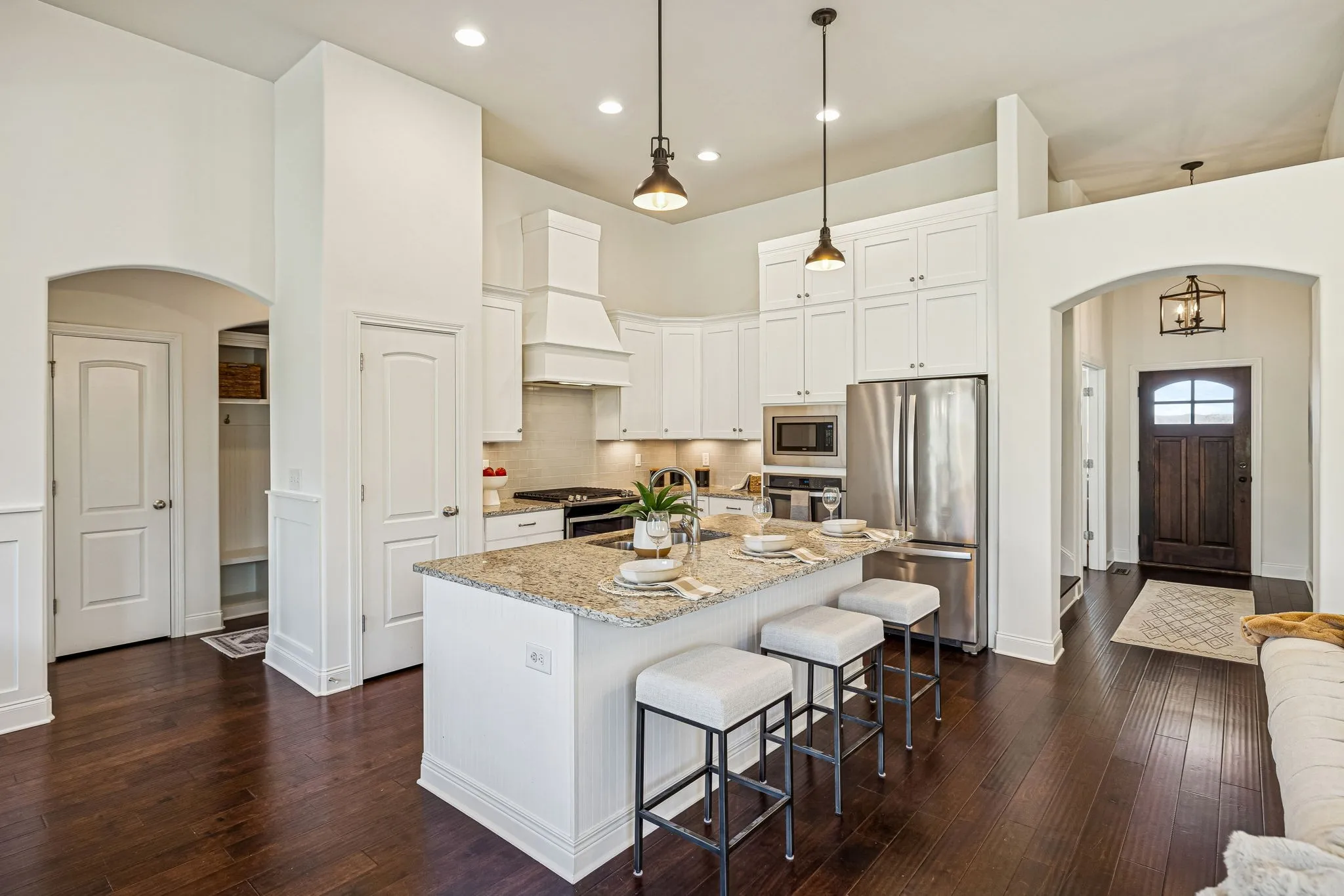 Experience elevated living in the highly-sought-after Canterbury community of Thompson’s Station. This refined residence offers 4 bedrooms and 3 full baths, with an elegant main-level living design featuring three bedrooms downstairs. The home’s soaring ceilings and open-concept living space flow seamlessly into a chef-caliber kitchen, creating an ideal setting for sophisticated entertaining. Its show-stopping primary suite boasts vaulted ceilings and a spa-inspired bath with a dramatic walk-in shower with dual heads, dual vanities, and a statement soaking tub worthy of a design magazine. Outdoors, enjoy a professionally maintained yard with an irrigation system and custom architectural lighting, a covered patio for alfresco dining, and an additional open-air patio perfect for a firepit and intimate gatherings. The builder also thoughtfully added a cozy, covered front porch to enjoy your morning coffee and the sunrise! Residents of Canterbury enjoy resort-style amenities, including expansive green spaces, two pools with cabanas, and direct access to the Thompson’s Station Greenway, connecting to the schools, parks and Tollgate Village. Ideally positioned near I-840 and I-65, with effortless access to downtown Franklin and Spring Hill, this home offers a rare blend of luxury, lifestyle, and location.