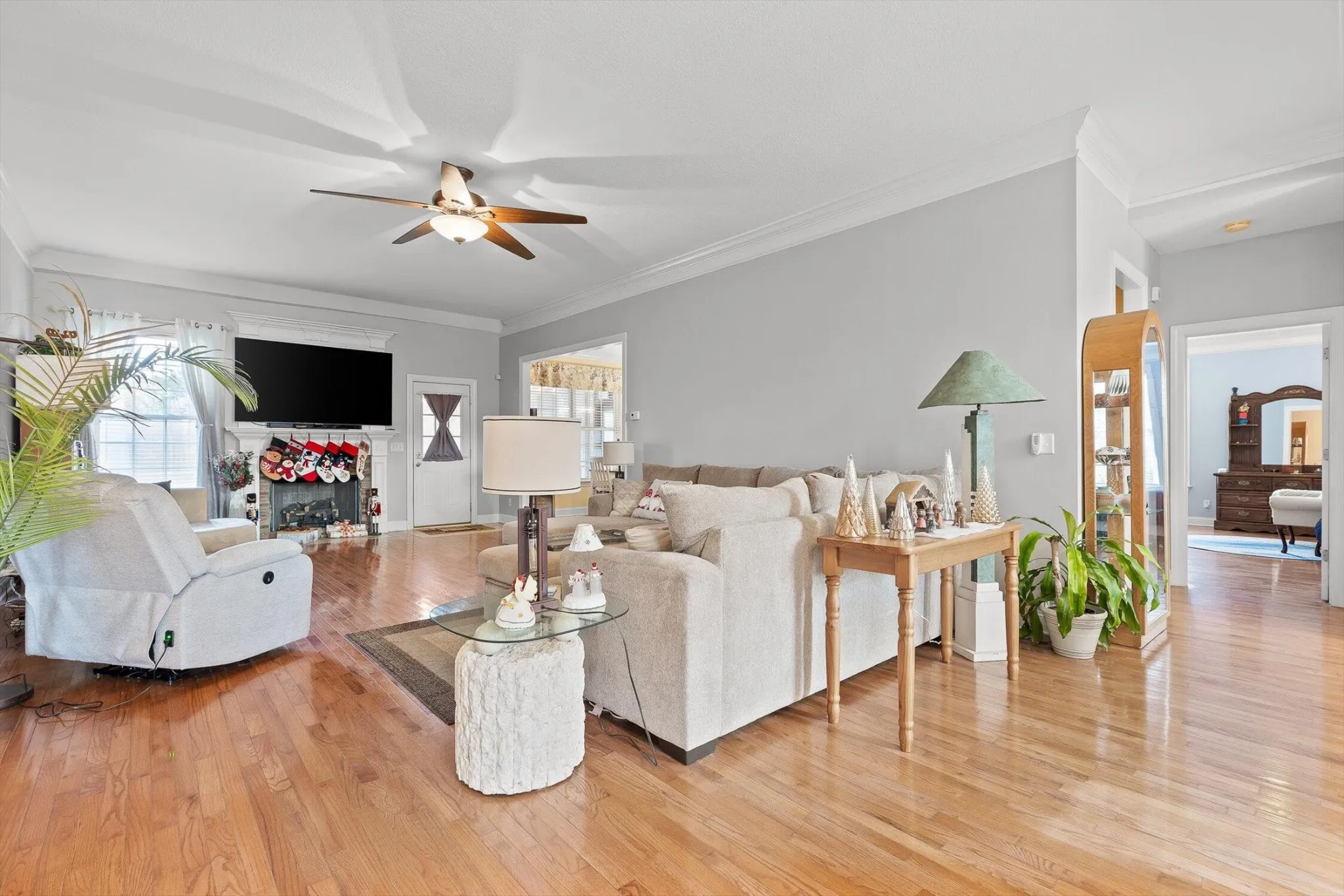 The layout features a spacious master bedroom on the main level, along with two additional bedrooms on the opposite side of the home, providing privacy for families if needed. The spacious living room creates a cozy space for watching movies, games, or opening presents on Christmas morning. The gas fireplace will keep the home toasty during the cold winter nights. (The propane tank remains with the home).
