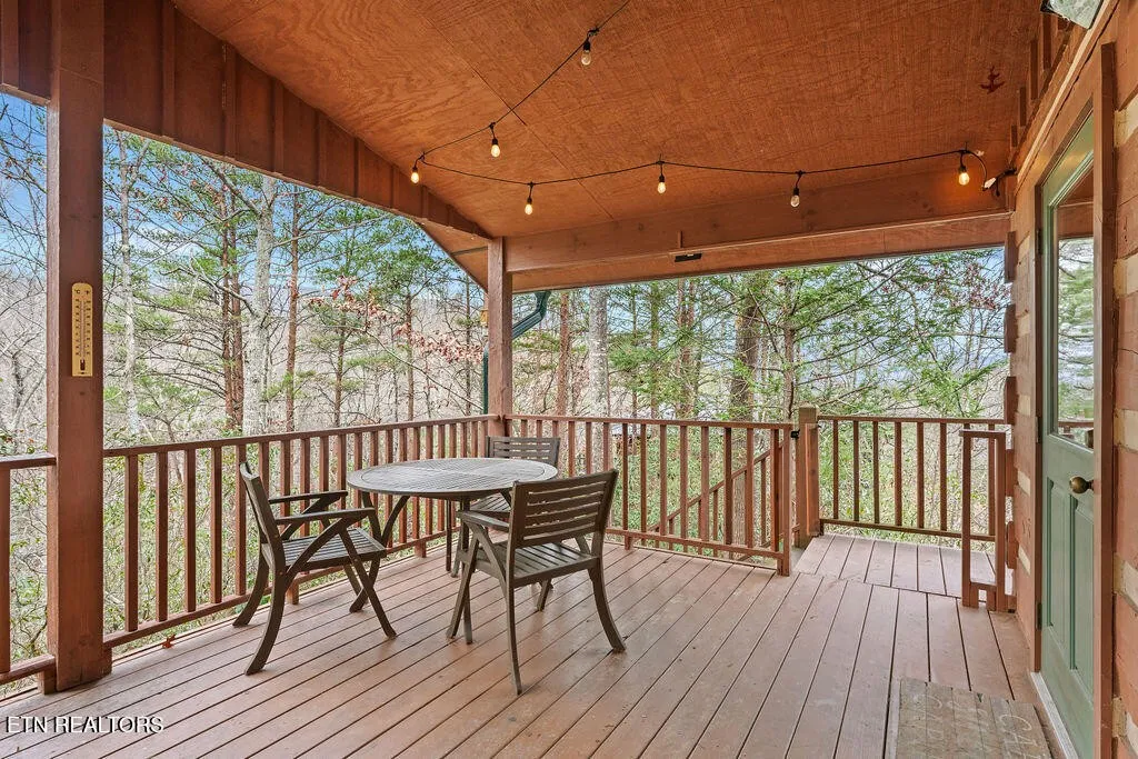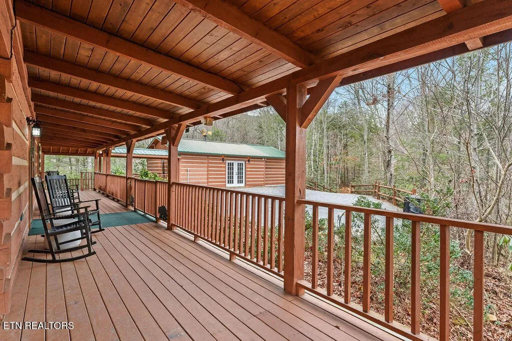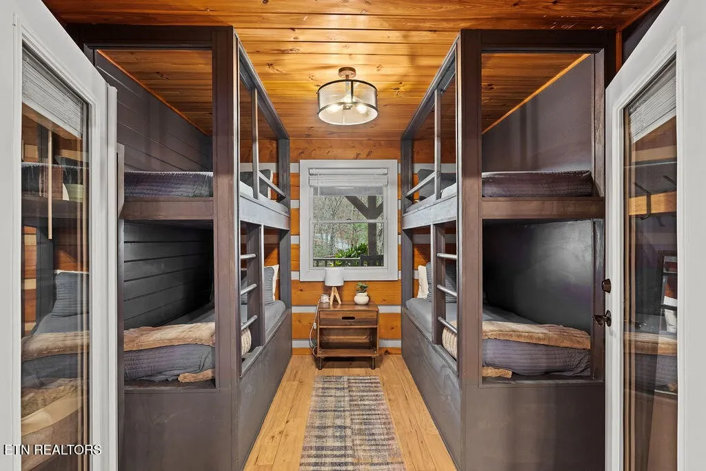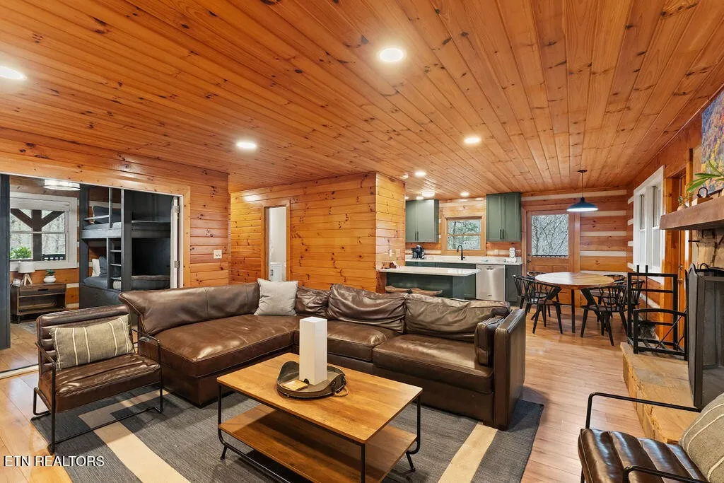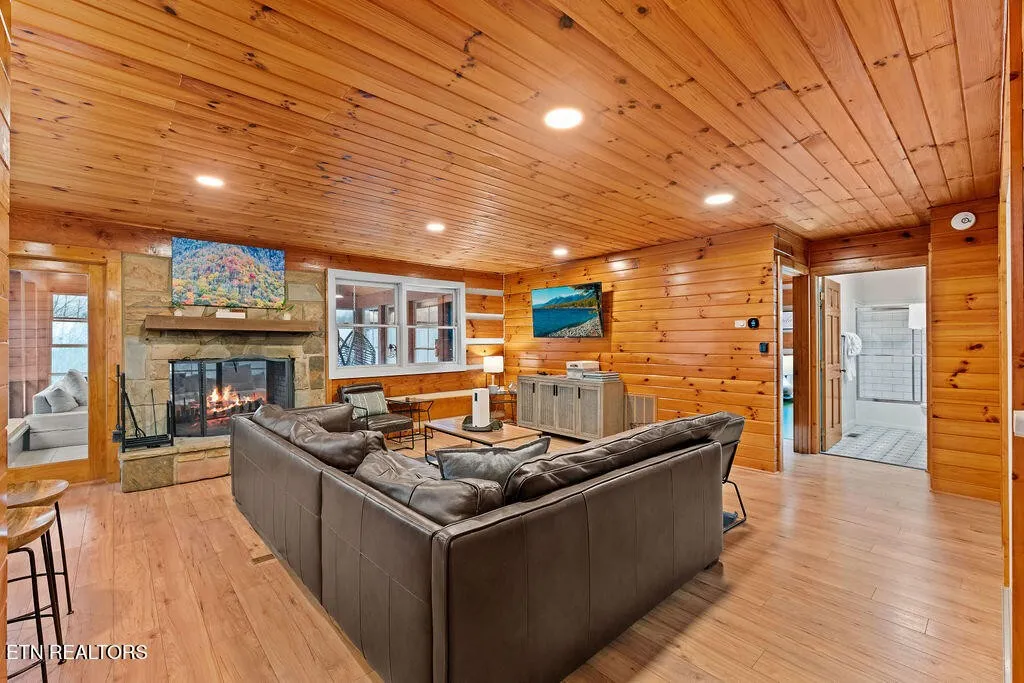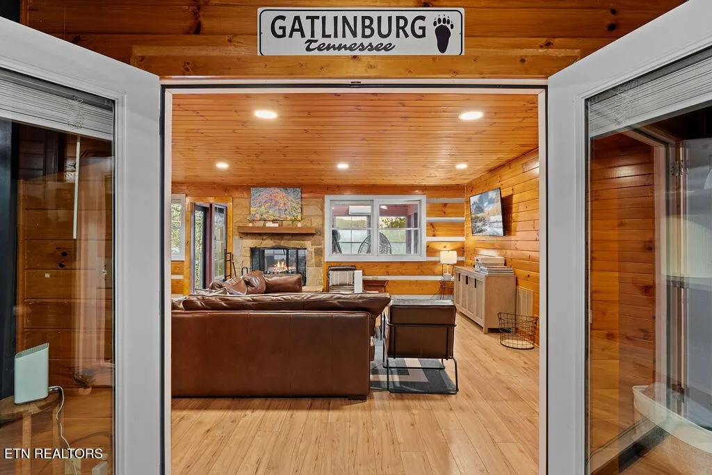 Designed for both comfort and entertainment, the cabin includes multiple gathering spaces such as a living room, sunroom, game room, and private theater, allowing room for everyone to spread out and unwind. The sunroom is a standout feature, complete with heated floors and year-round heating and cooling, ideal for enjoying the tranquil mountain setting in any season. This beautifully appointed retreat features classic pine tongue-and-groove interiors, a fully updated kitchen, and a striking two-sided stone wood-burning fireplace that anchors the main living spaces.\r\n