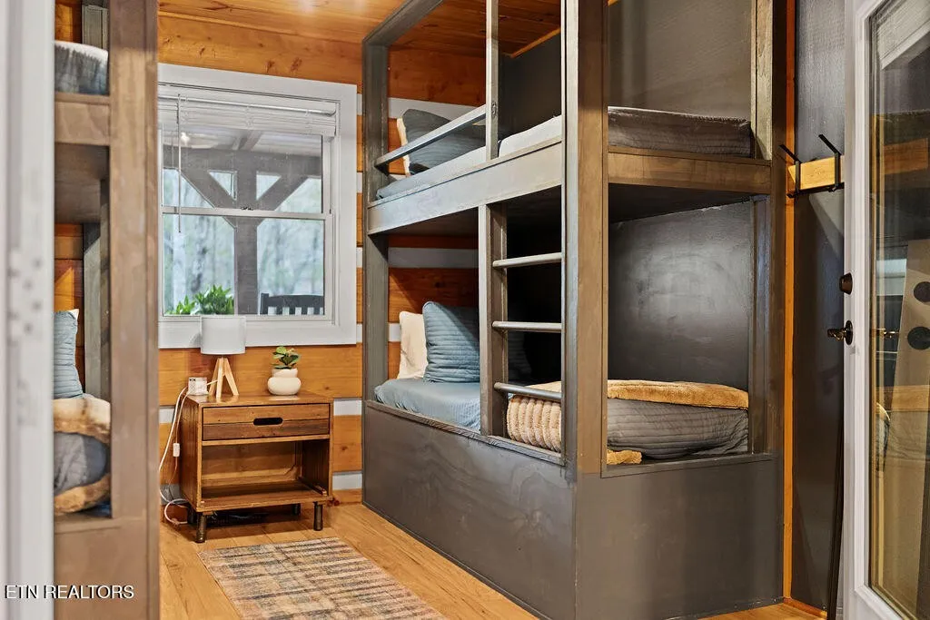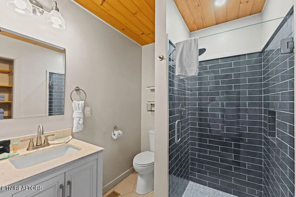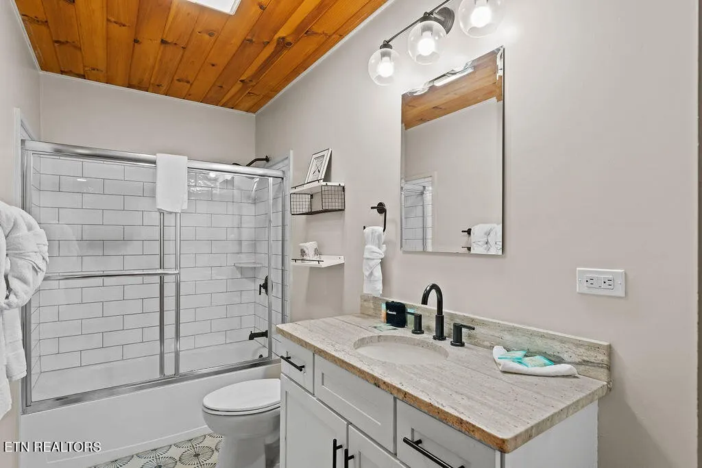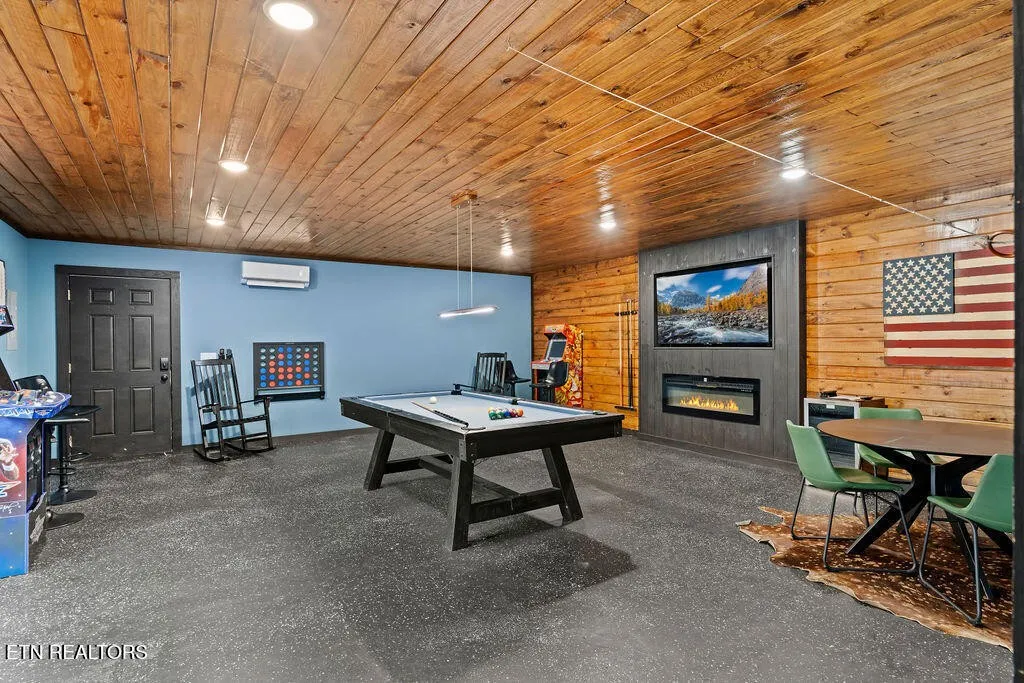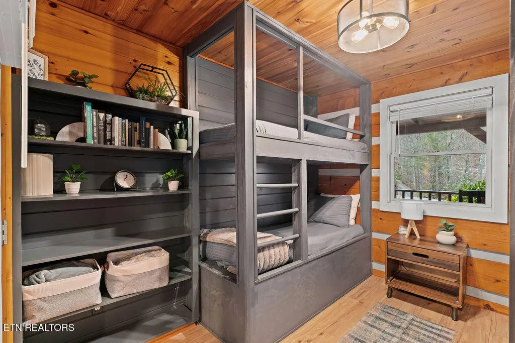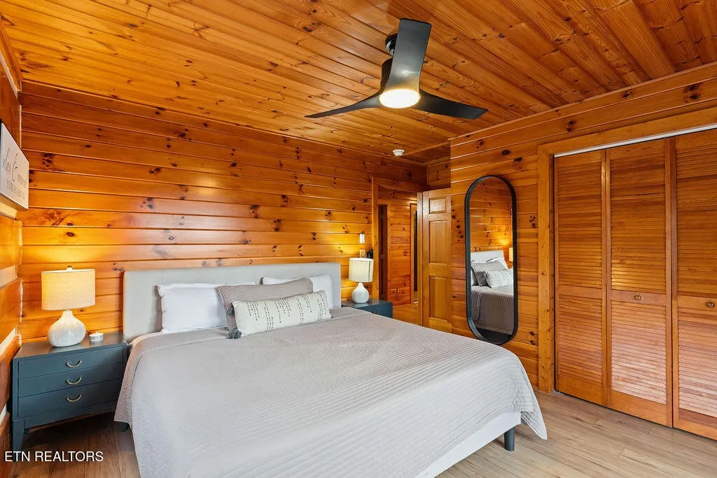 Designed for both comfort and entertainment, the cabin includes multiple gathering spaces such as a living room, sunroom, game room, and private theater, allowing room for everyone to spread out and unwind. The sunroom is a standout feature, complete with heated floors and year-round heating and cooling, ideal for enjoying the tranquil mountain setting in any season. This beautifully appointed retreat features classic pine tongue-and-groove interiors, a fully updated kitchen, and a striking two-sided stone wood-burning fireplace that anchors the main living spaces.\r\n