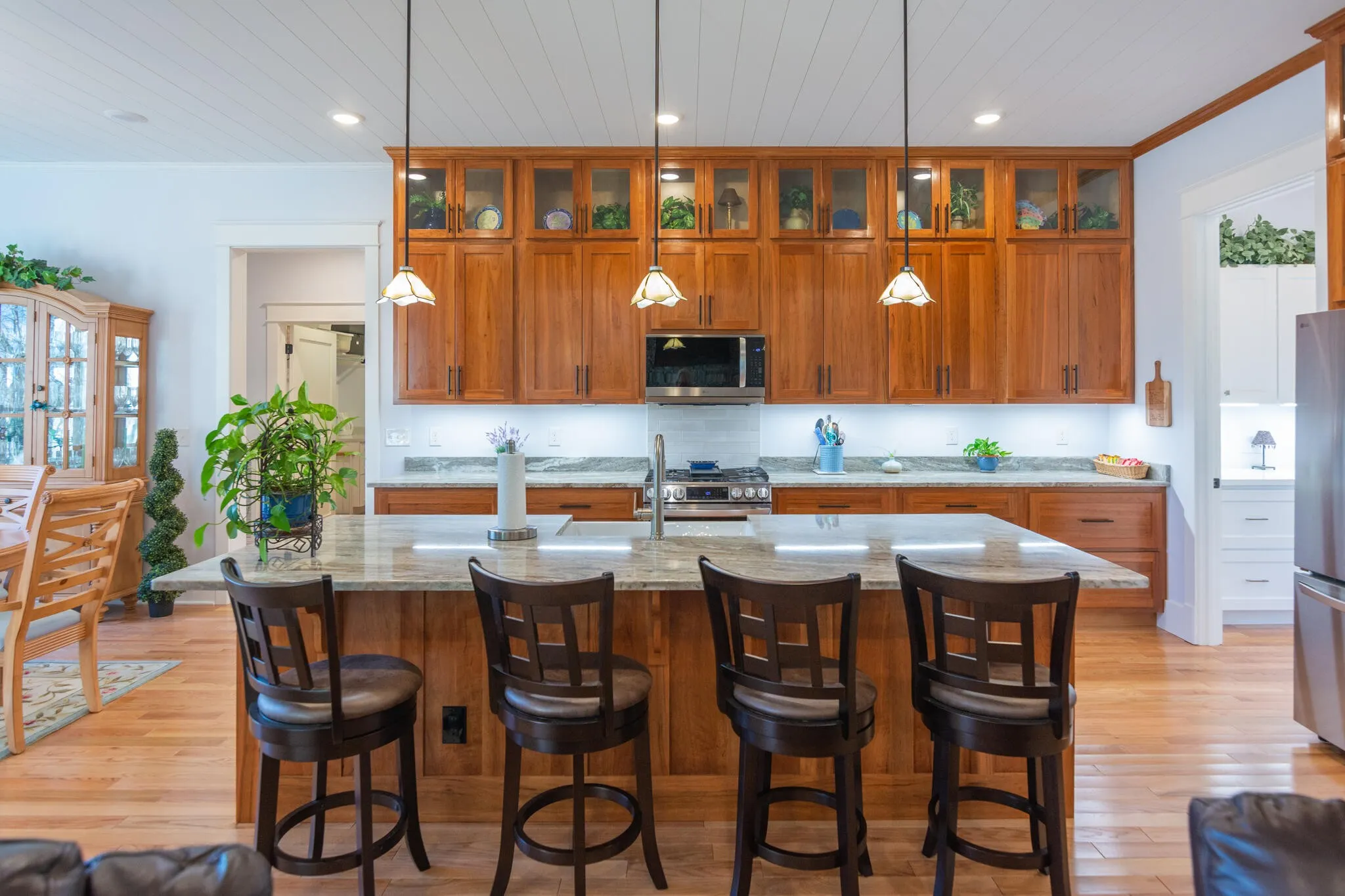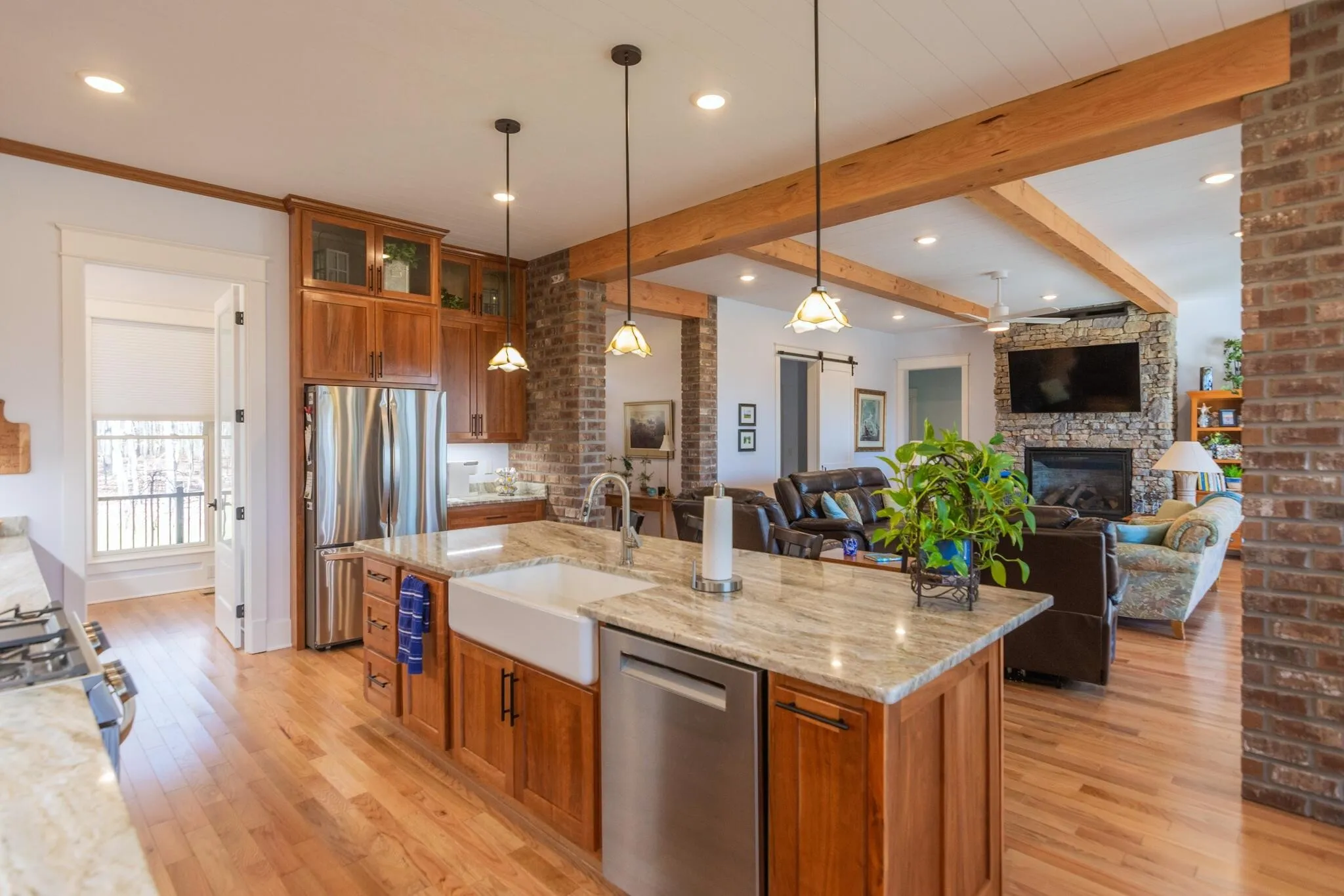 The spacious kitchen is a showstopper with custom cherry wood cabinets, quartzite countertops, stainless steel appliances, under-cabinet lighting, and a huge walk-in pantry, making it ideal for entertaining and everyday living. The living room features brick accents and a stacked-stone fireplace with gas logs, creating a warm and inviting focal point.\r\n