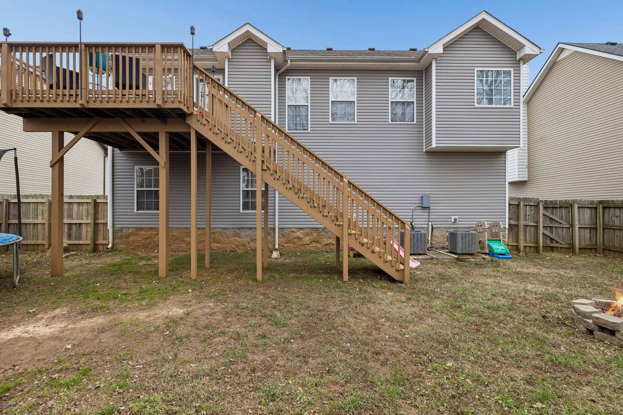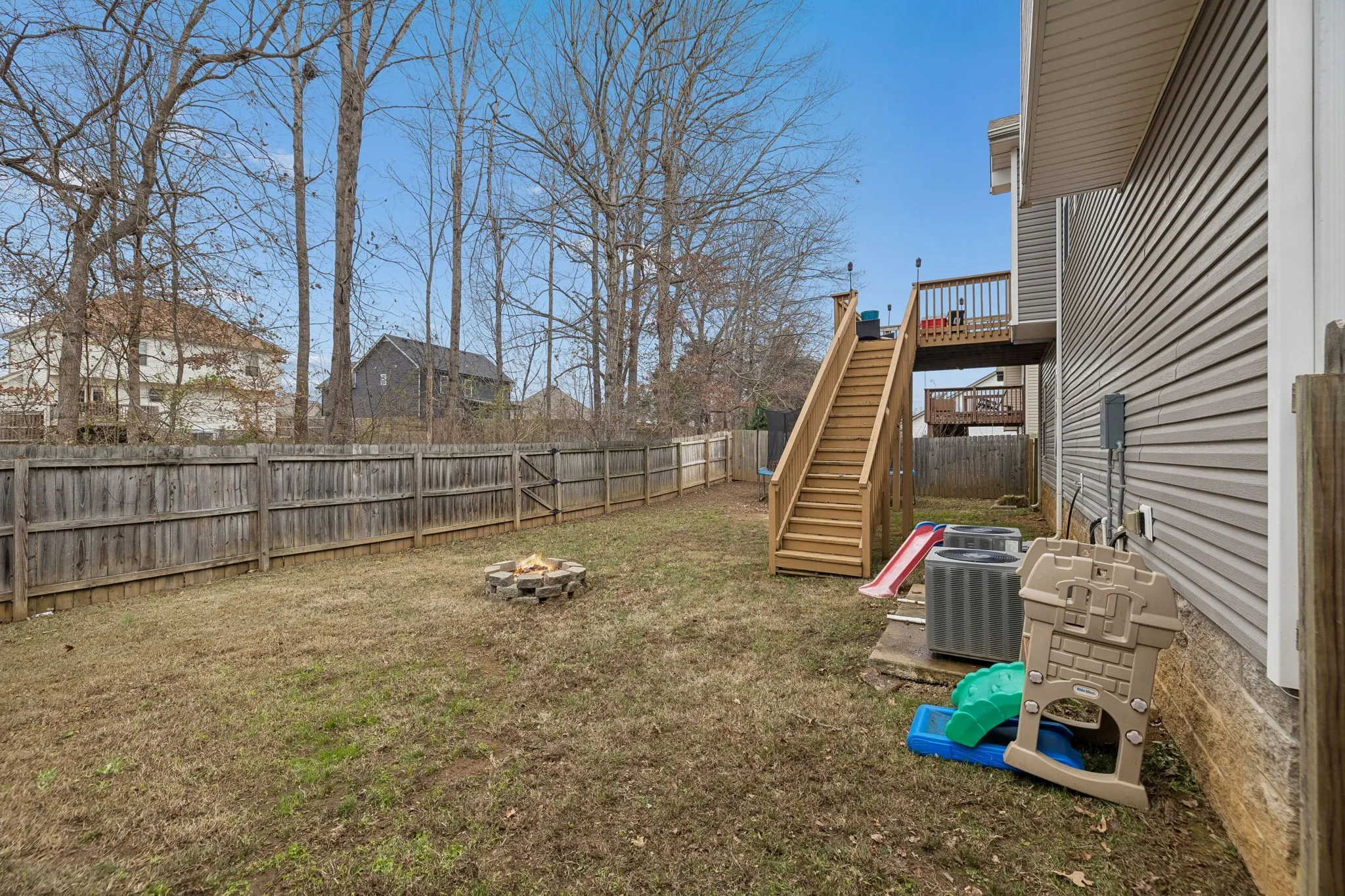 Outside, enjoy an elevated deck overlooking a fully fenced backyard with room for pets, play, and entertaining. The lot extends beyond the current fence line, offering the opportunity to expand the fenced area and create an even larger backyard if desired. A wooded backdrop, fire pit area, and easy access from both the deck and lower level complete the outdoor space.