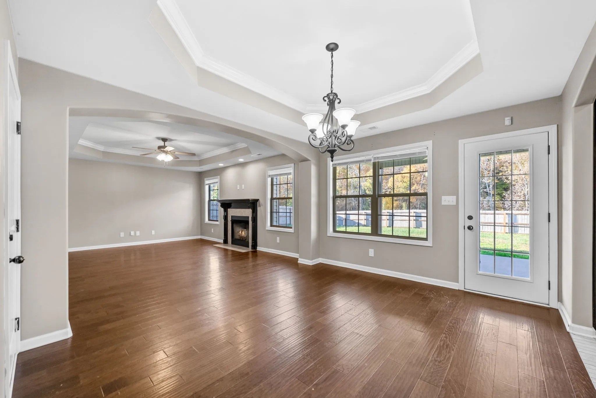 Outdoor spaces include a covered patio and a fenced backyard with a tree-lined backdrop, offering added privacy and room to enjoy the outdoors. Additional features include a tankless water heater and county-only taxes.