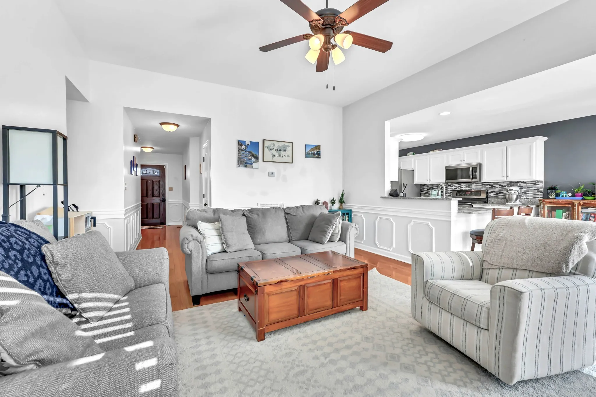 This neighborhood was designed to be at the center of everything – shopping, hospital, post and interstate. The home boasts stylish wainscoting throughout, adding a touch of elegance to every room. The kitchen is beautifully appointed with granite countertops, white cabinets, and a striking accent wall, complemented by light hardwood flooring. The primary bedroom features a sophisticated double tray ceiling and a decorative medallion, providing a luxurious atmosphere. In the primary bathroom, you’ll find double vanities, a spacious walk-in closet, and both a separate tub and shower for ultimate comfort. The laundry room is exceptionally equipped, offering the most cabinets you are likely to see, providing ample storage and organization space. Outside, enjoy a pergola and deck ideal for relaxing or entertaining guests. Additional amenities include a storage shed and a tree-lined backyard.