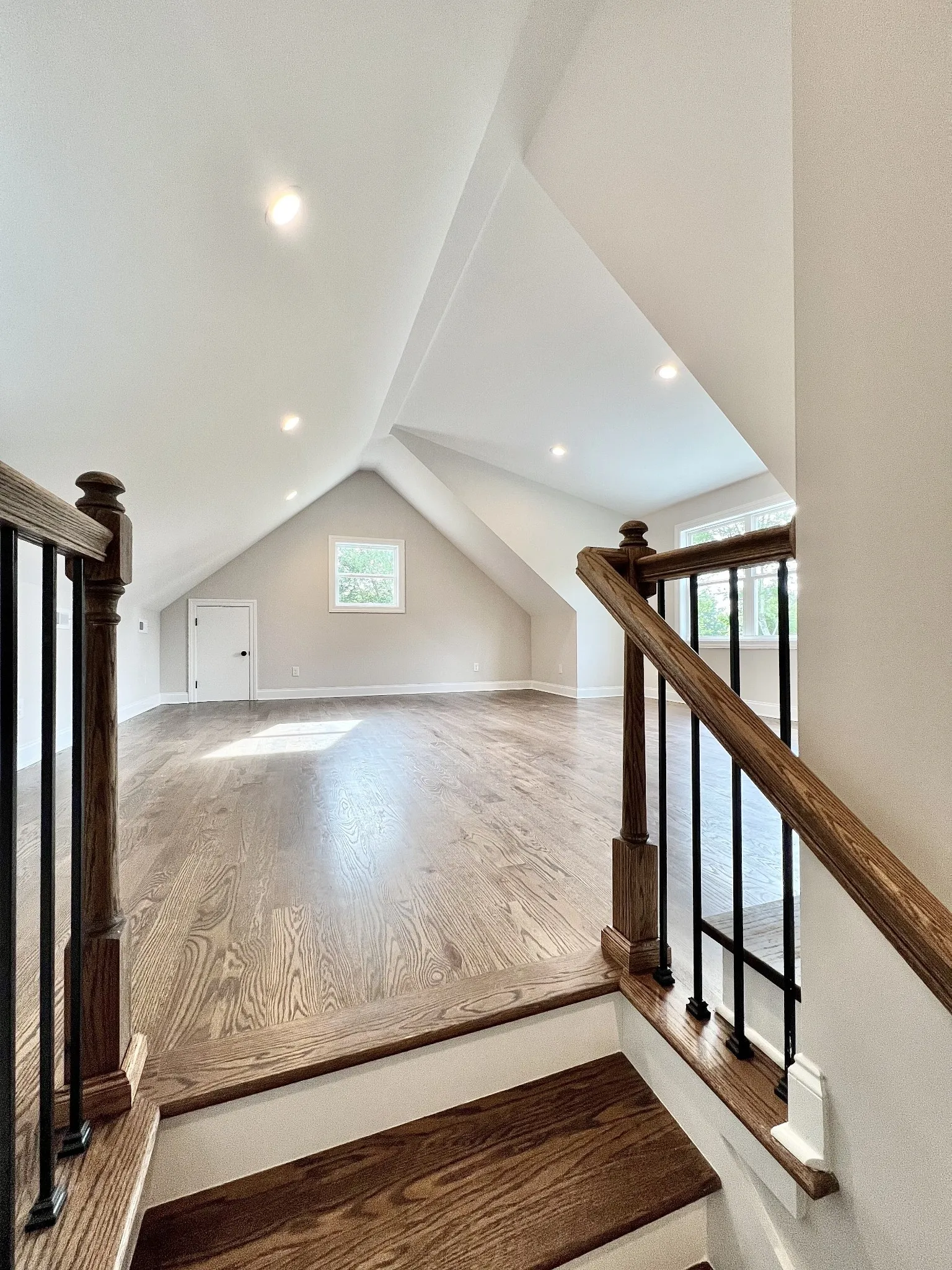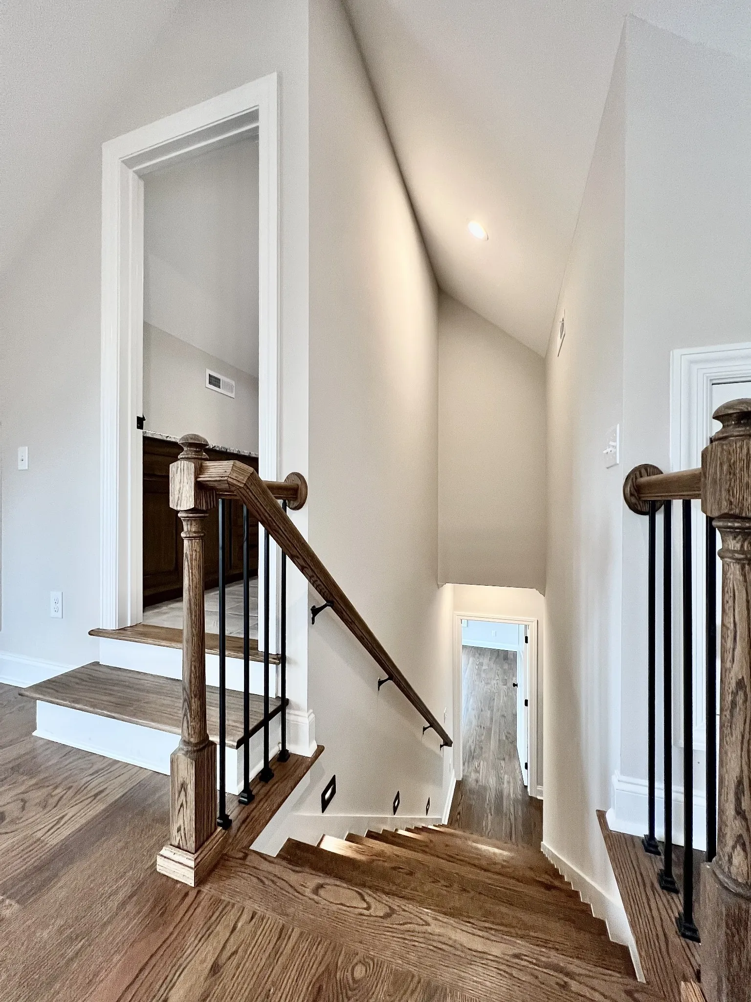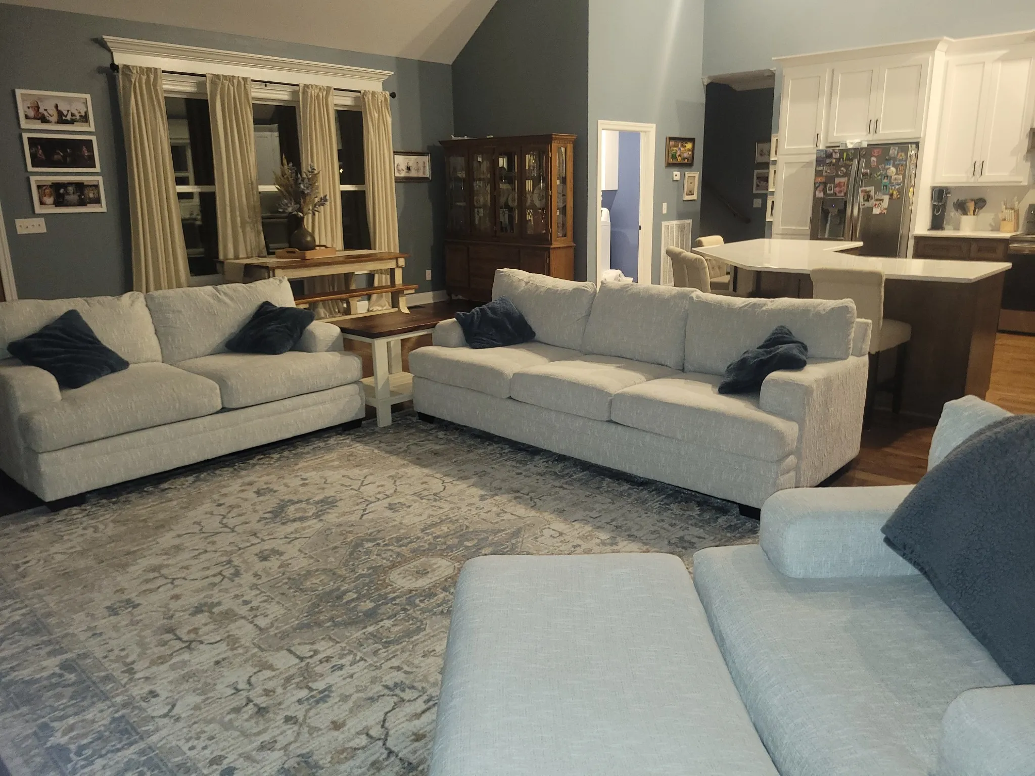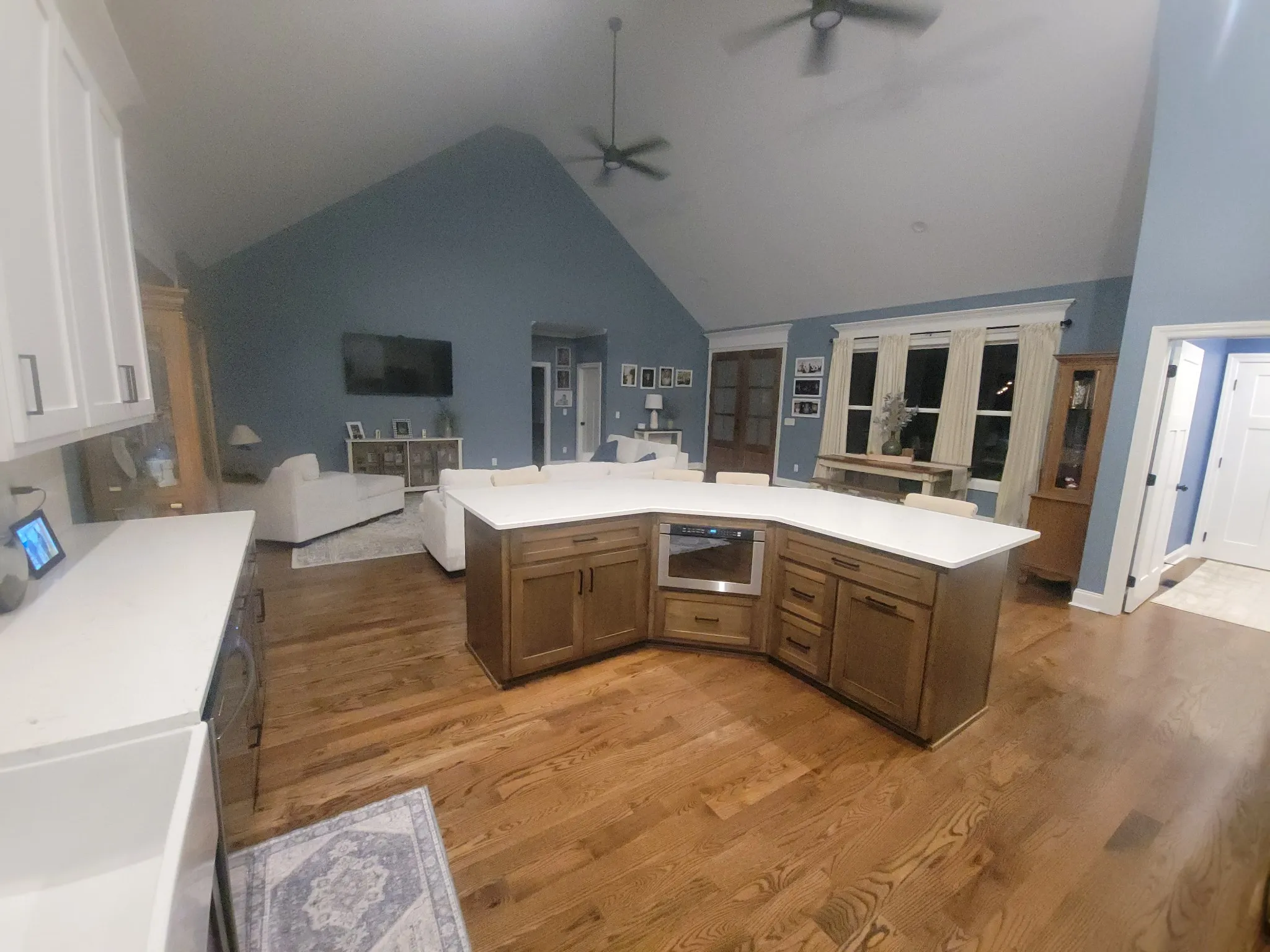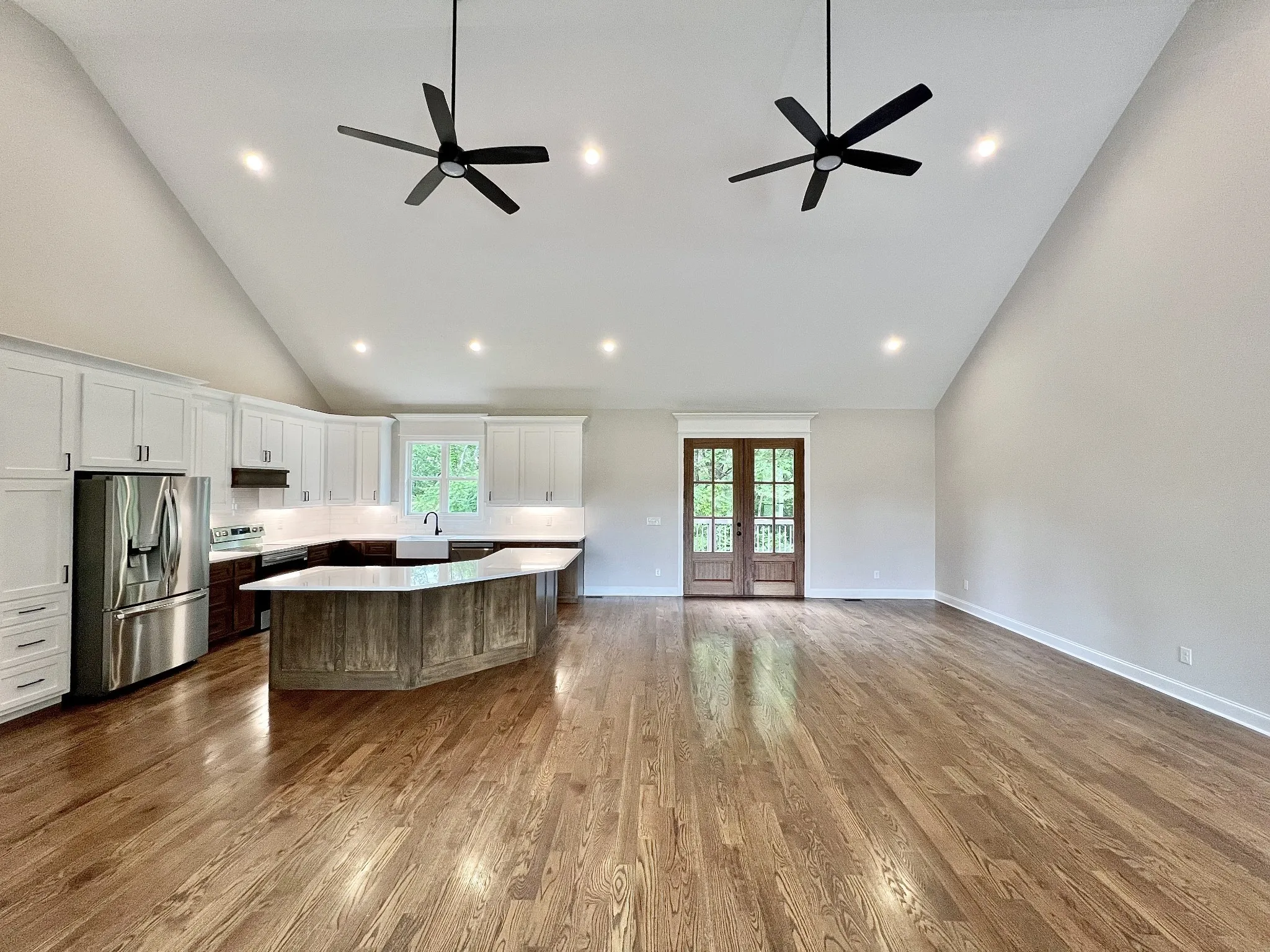 Step inside through elegant 8-foot mahogany French doors to an open-concept living, dining, and kitchen area filled with natural light, soaring 18-foot vaulted ceilings, and beautiful oak hardwood floors. The show-stopping kitchen features custom two-tone maple cabinetry, quartz and granite countertops, under-cabinet lighting, tile backsplash, farm-style sink, stainless steel LG appliances, and an impressive batwing island with seating for six—perfect for everyday living and entertaining alike.