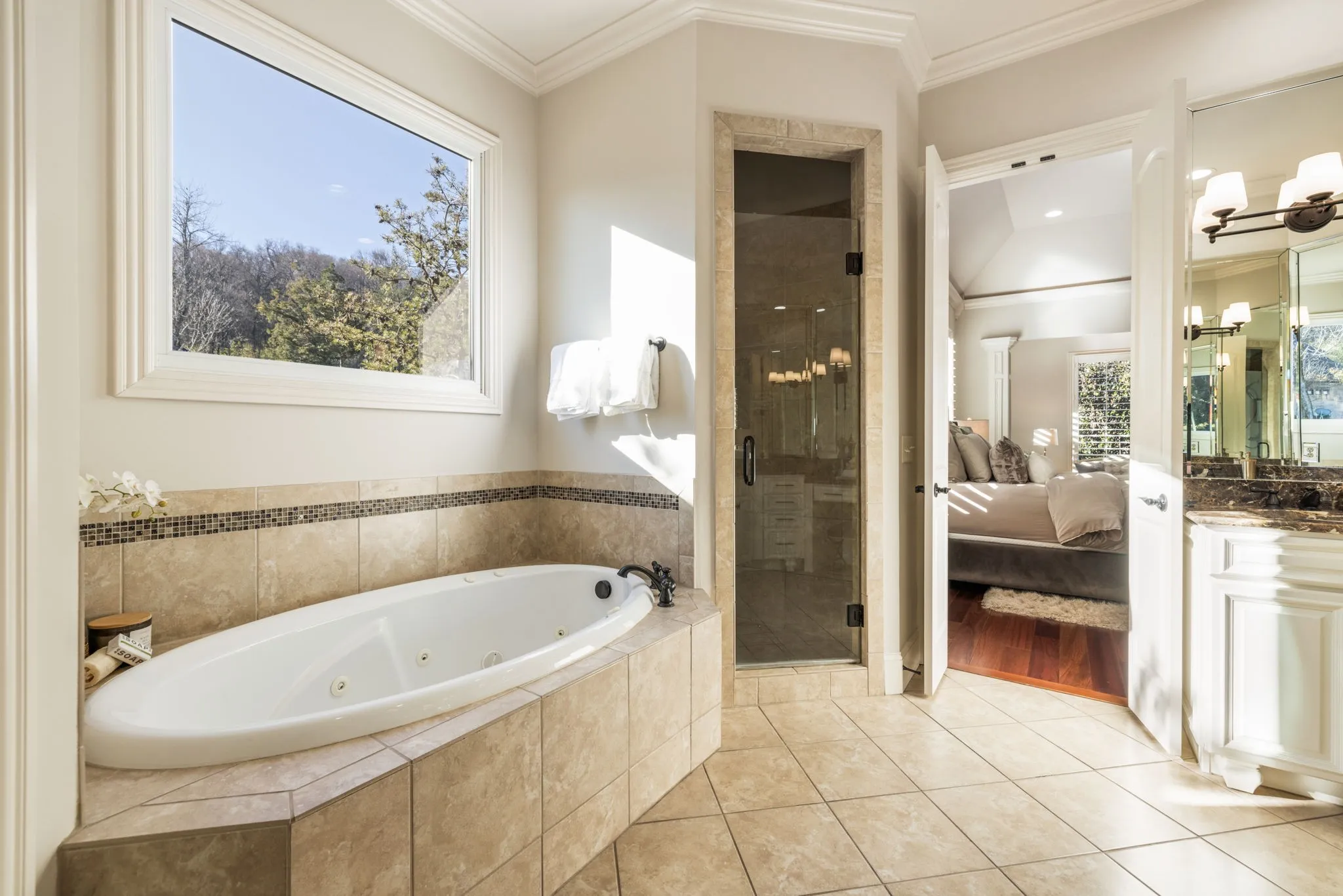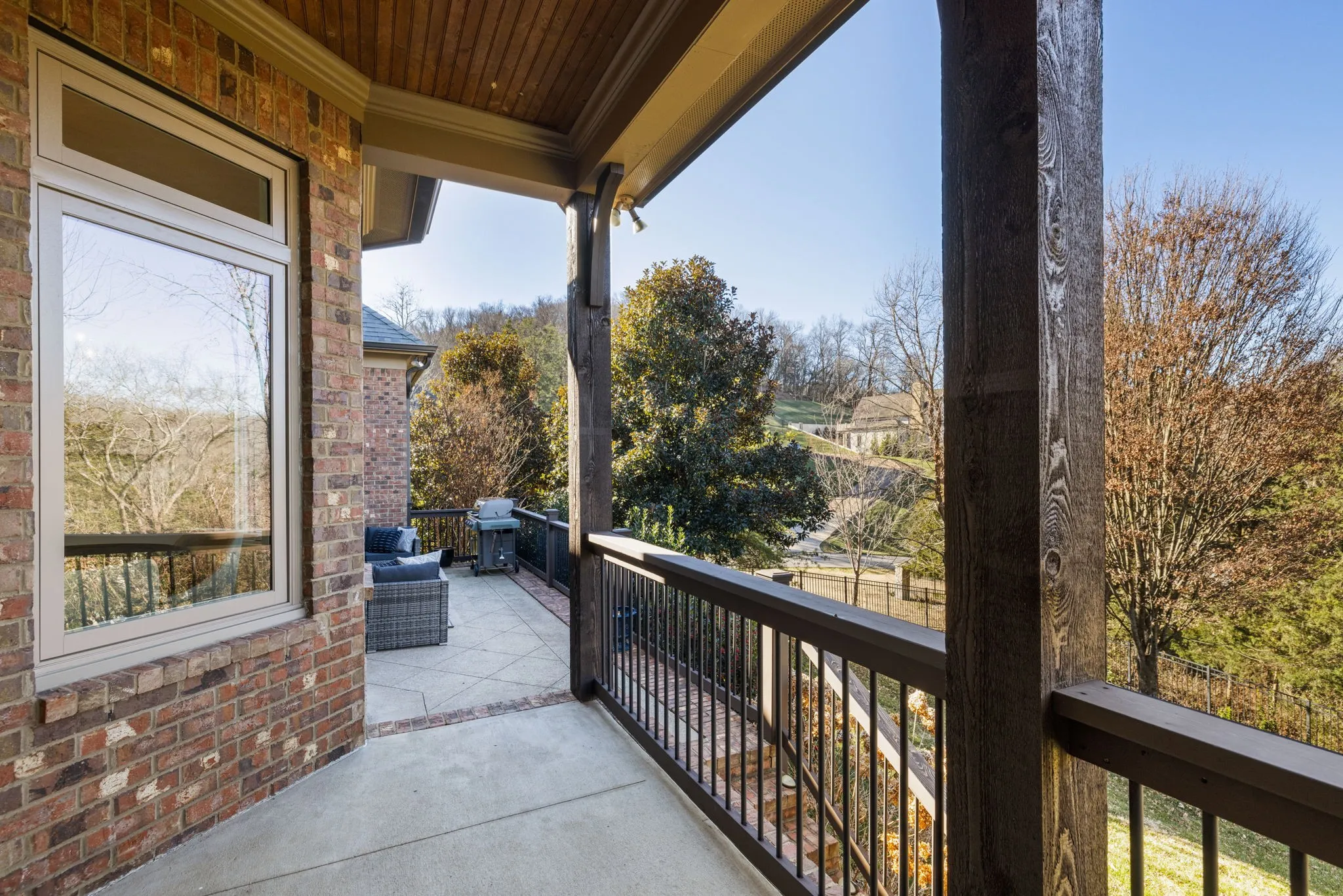 The kitchen flows into a warm & inviting keeping room w/stacked stone fireplace, vaulted and beamed ceilings & walls of windows. From here, step into the first of two outdoor living spaces with cozy fireplace and TV—perfect for relaxed evenings, celebrations & everything in between.