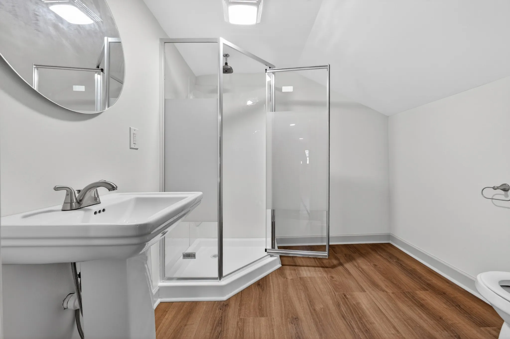 The kitchen has been fully renovated with new cabinets, countertops, and hardware. Bathroom downstairs has been updated with new vanities, showers, fixtures, and lighting. Additional interior improvements include shiplap detailing on the fireplace and added drywall upstairs, along with the addition of a second bathroom in the upper level.