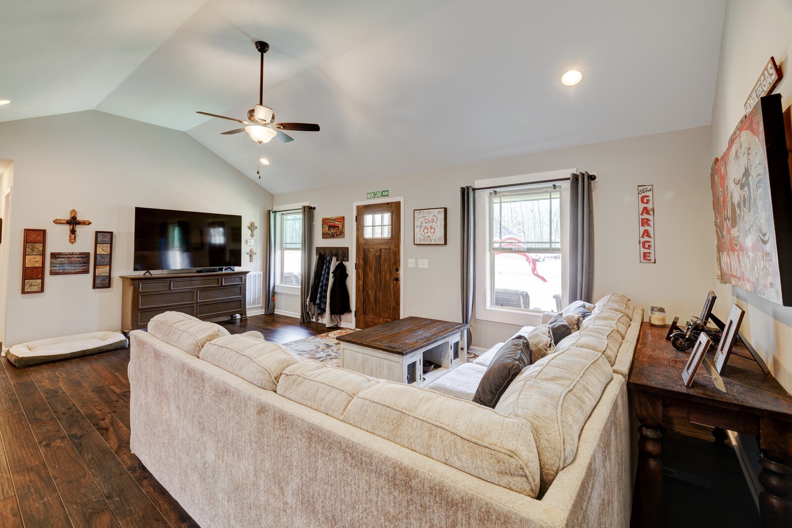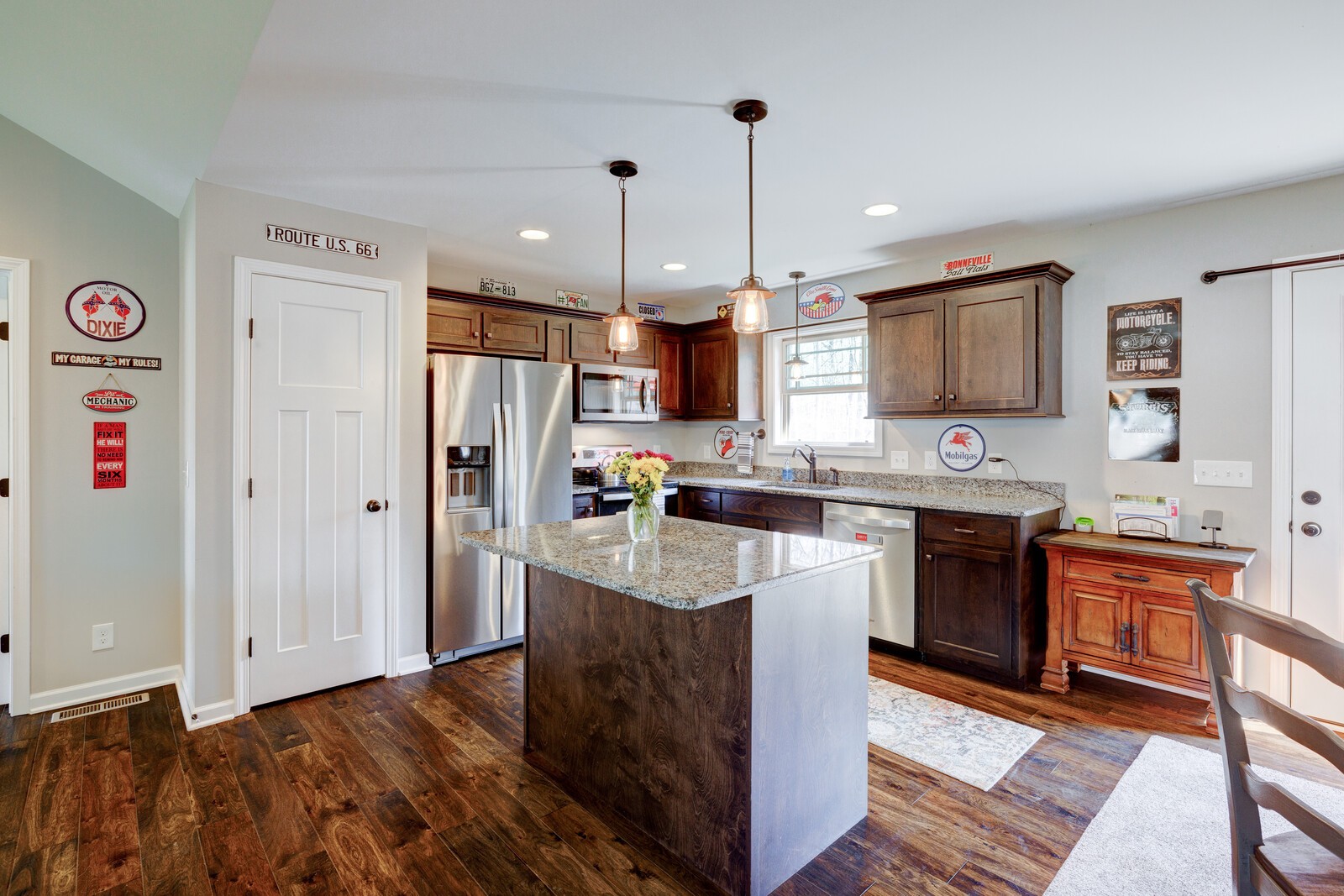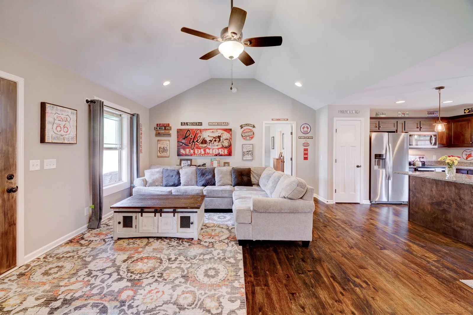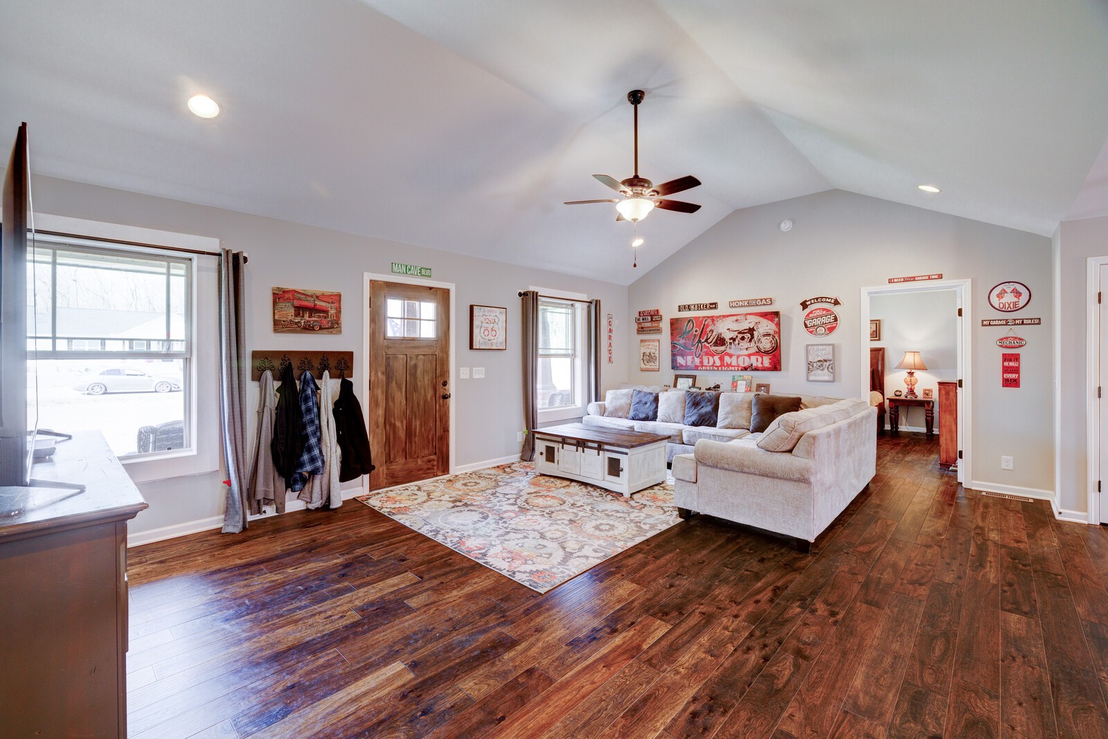 One level, charming home built in 2021 with open floorplan sits on a 2.29 acre lot. NO HOA! Rocking chair front porch allows you to enjoy the beauty of the neighborhood. Beautiful open kitchen with center island, tons of cabinets, stainless steel appliances and granite countertops. The primary bedroom includes a trey ceiling, hardwood floors and a gorgeous en-suite bathroom with granite dual vanity, soaking tub, stand up shower, tile flooring, and large custom walk-in closet with built-ins. Bonus room with separate entrance has tons of natural light, hardwood flooring, electric fireplace & separate HVAC unit. Tons of storage space! Additional features include cathedral ceilings, hardwoods throughout, granite & tile in secondary bathroom. Back patio is great for entertaining!