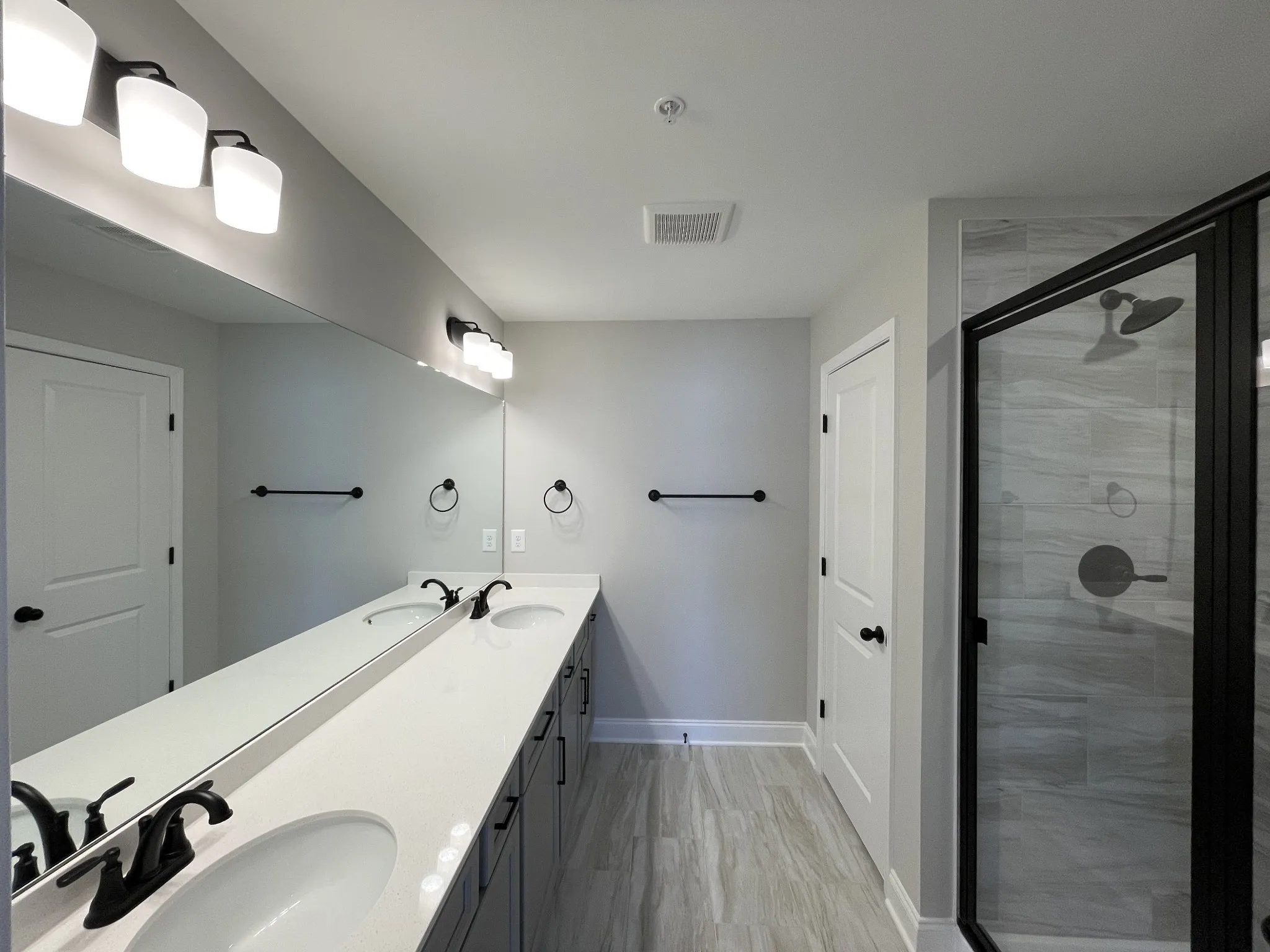 Celebration Homes offers hardwood stair treads leading upstairs to a large Owner’s Suite that truly impresses. The private bath showcases upgraded tile in the walk-in shower, quartz countertops with undermount sinks, and double vanities for a spa-like experience. Enhanced lighting and upgraded plumbing fixtures are found throughout the home, adding a refined, modern touch.