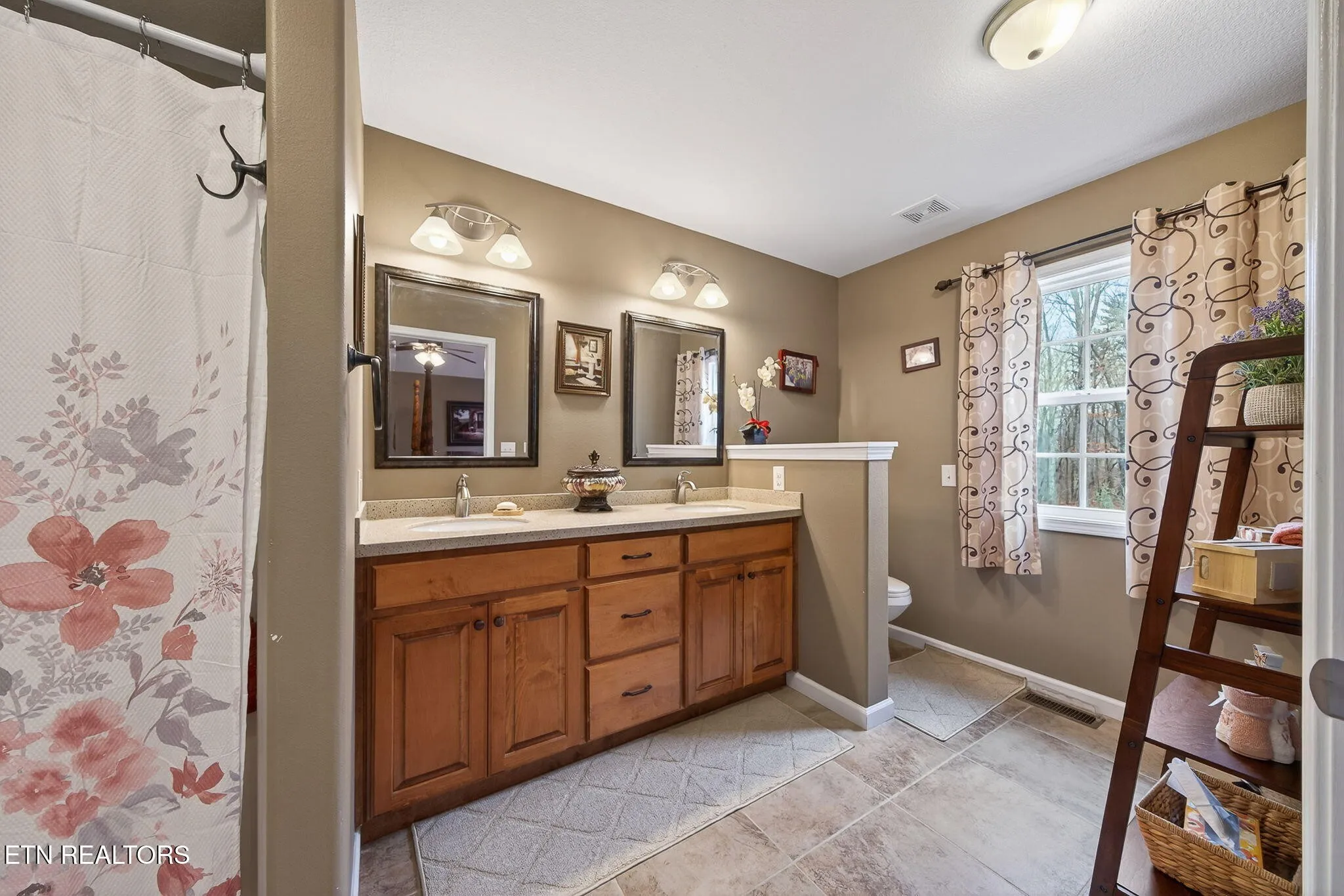 – Double-sink vanity with quartz countertop