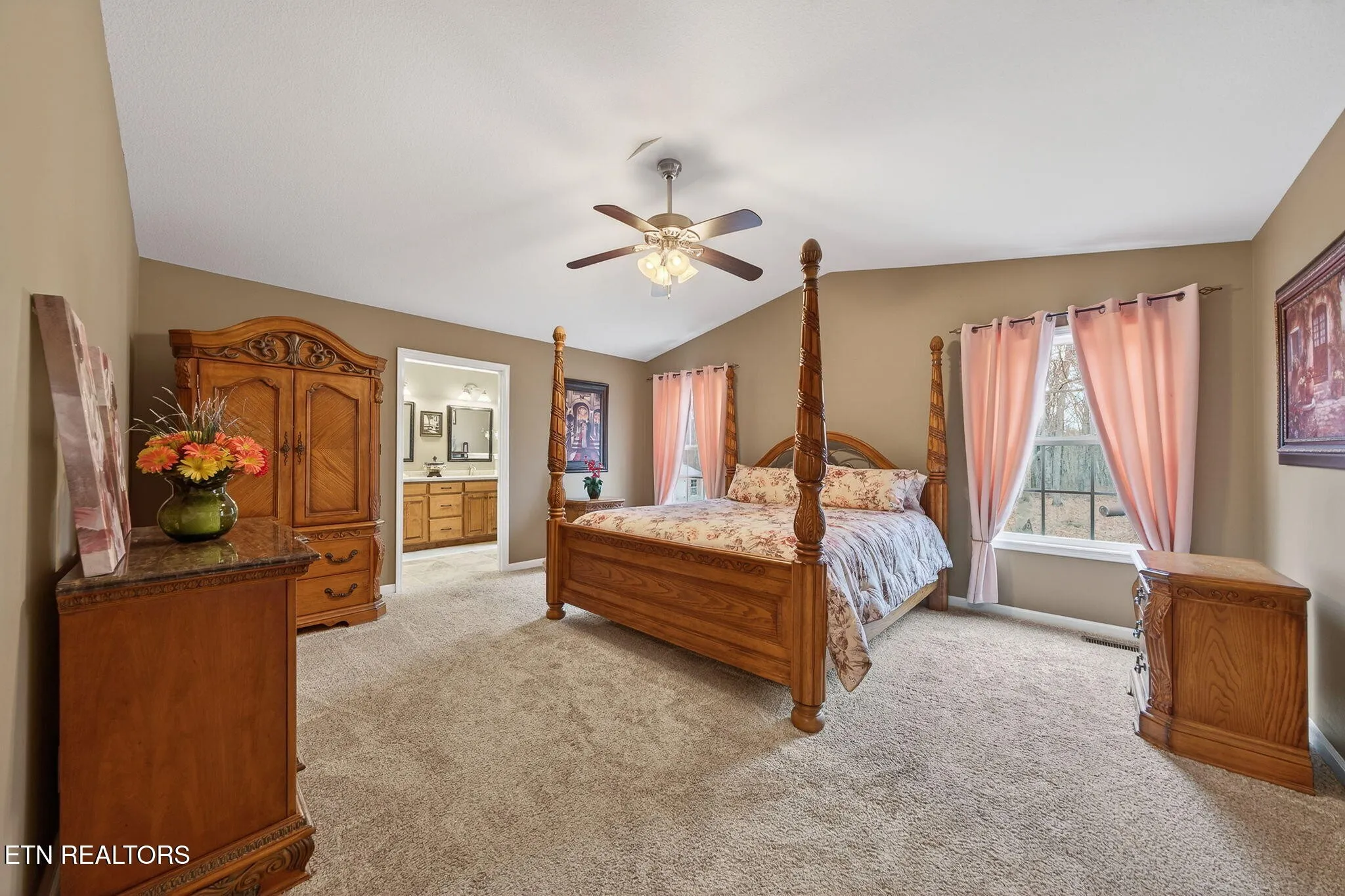 • One guest bedroom features a vaulted ceiling