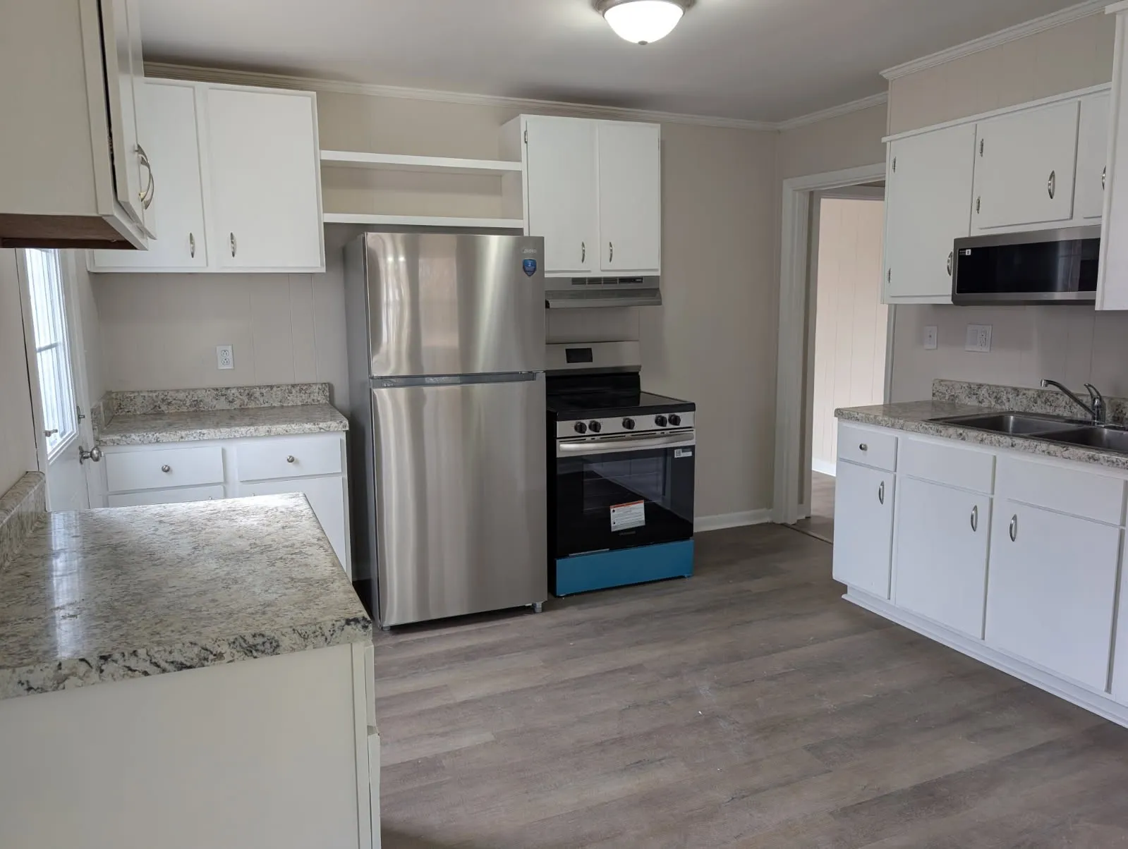 Nice house completely remodeled with new windows, doors, lights, LVP floor thruout, new countertops and appliances, new vanity and tub. Large back yard with storage building. Concrete driveway.