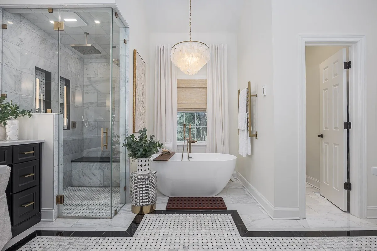 Inside, the home features four generously sized bedrooms, brand-new carpeting throughout, and custom California closets. The primary suite serves as a private sanctuary, highlighted by stunning marble finishes, gold-accented fixtures, a New deep-soaking tub, a heated towel rack, an Alexa-enabled mirror, and a fully tiled spa-style shower with dual shower heads, a rainfall feature, steam capability, and a built-in bench. Electric blinds in both the primary bedroom and bathroom allow effortless control of light and privacy.