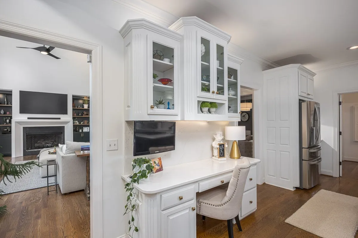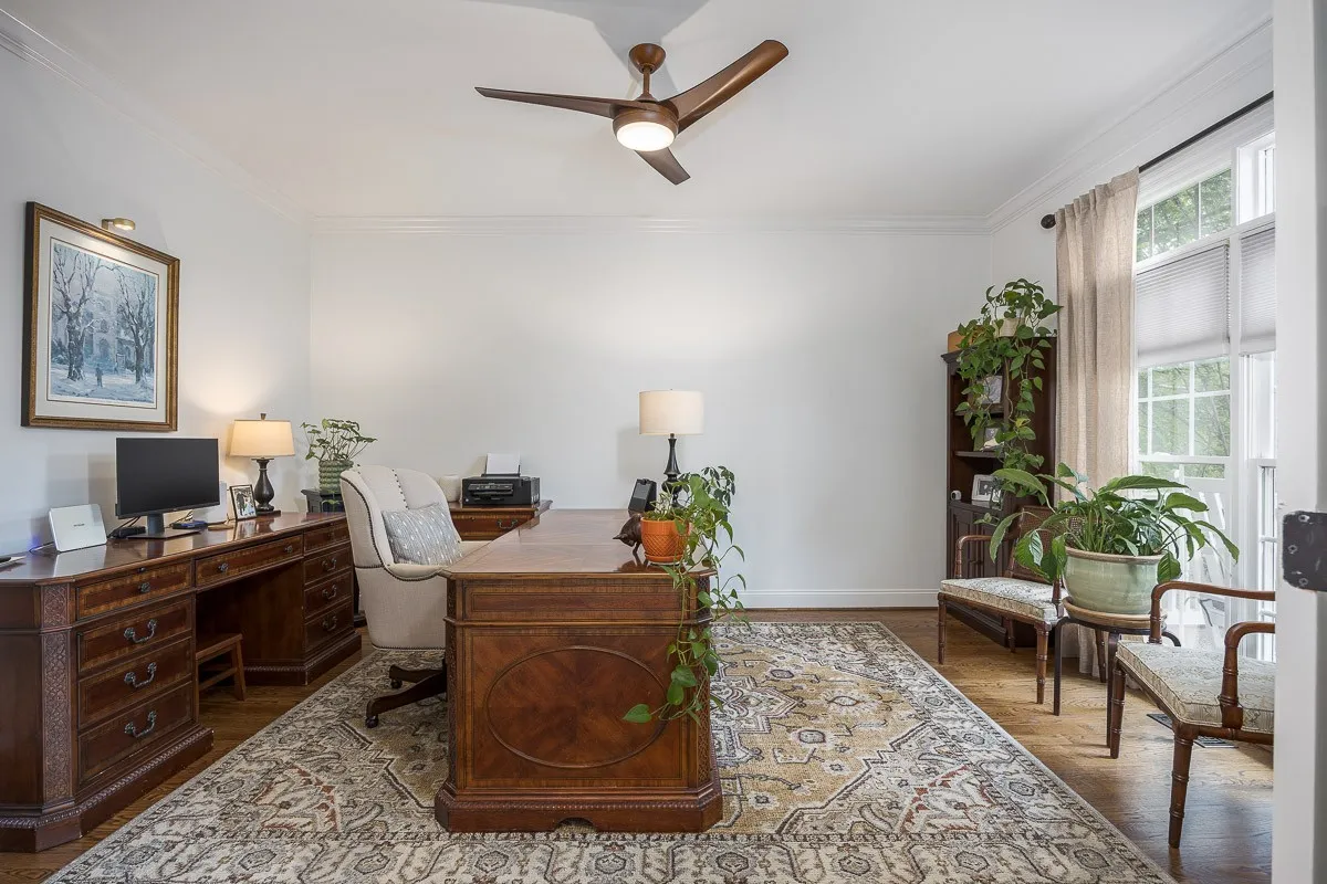 The kitchen is both stylish and functional, perfect for daily living or entertaining, and is equipped with New stainless steel appliances, a double oven, a KitchenAid refrigerator, and a hot water dispenser. The main living area is anchored by a cozy fireplace framed by custom built-ins, while a dedicated office and additional sitting room provide versatile spaces for work or relaxation.