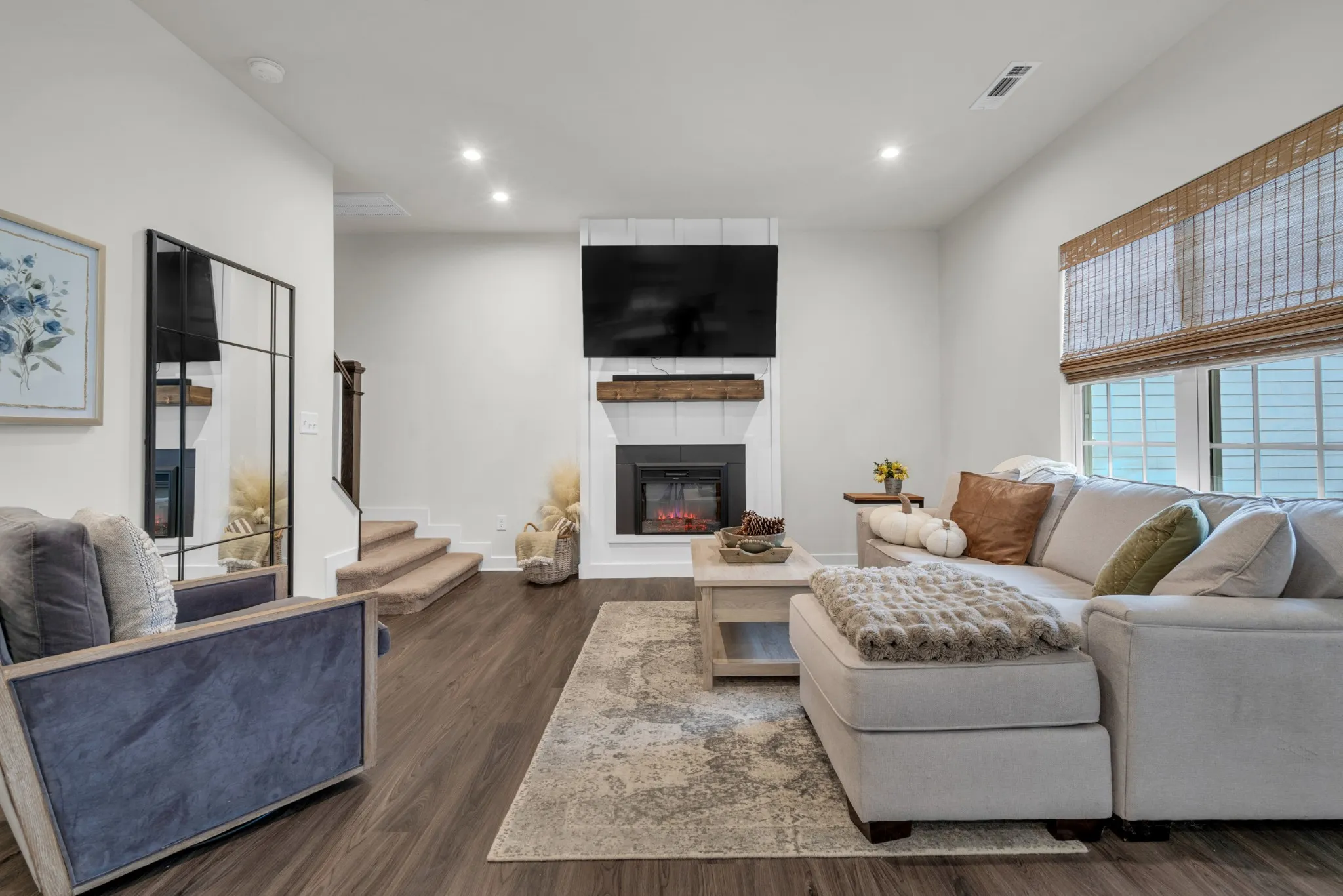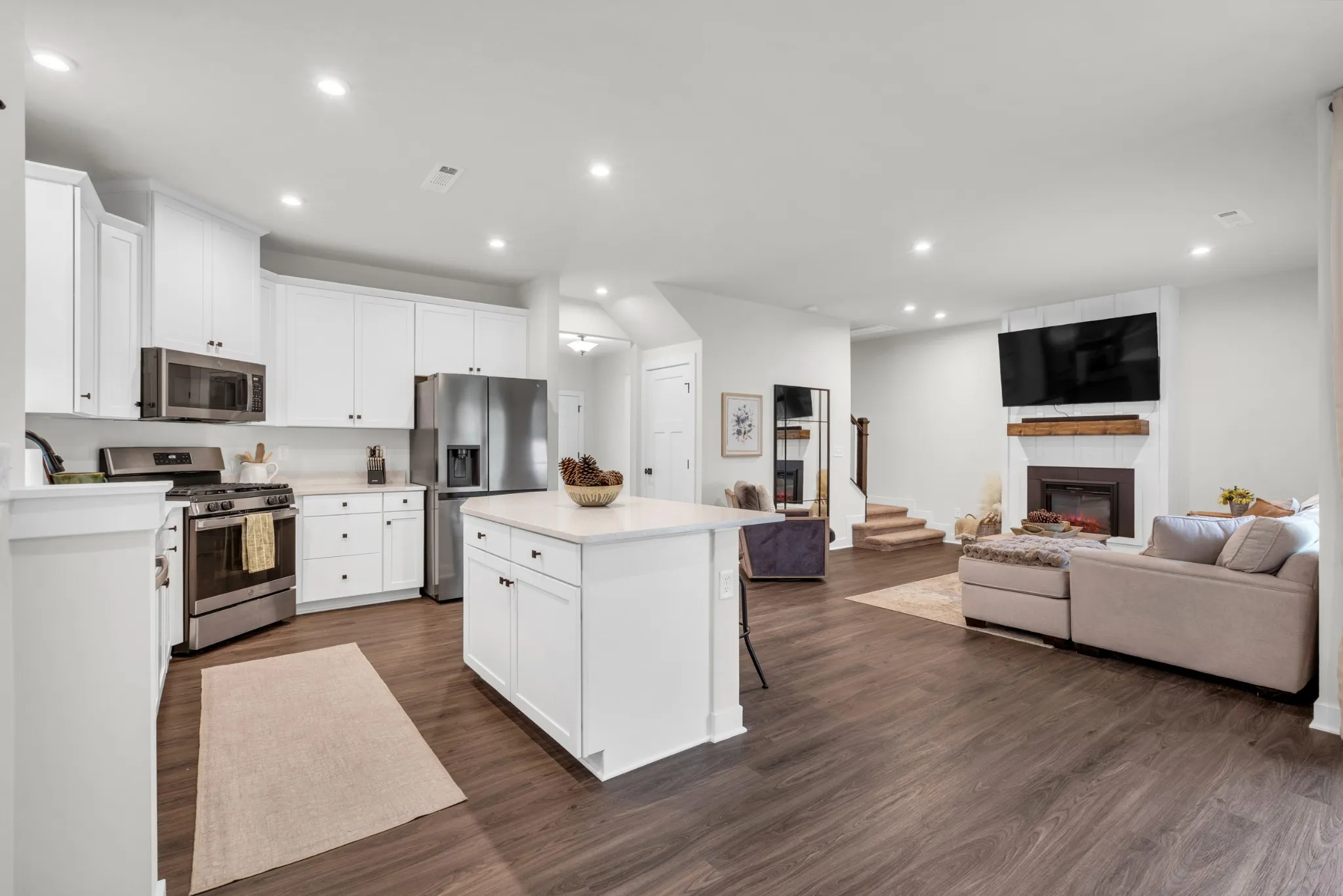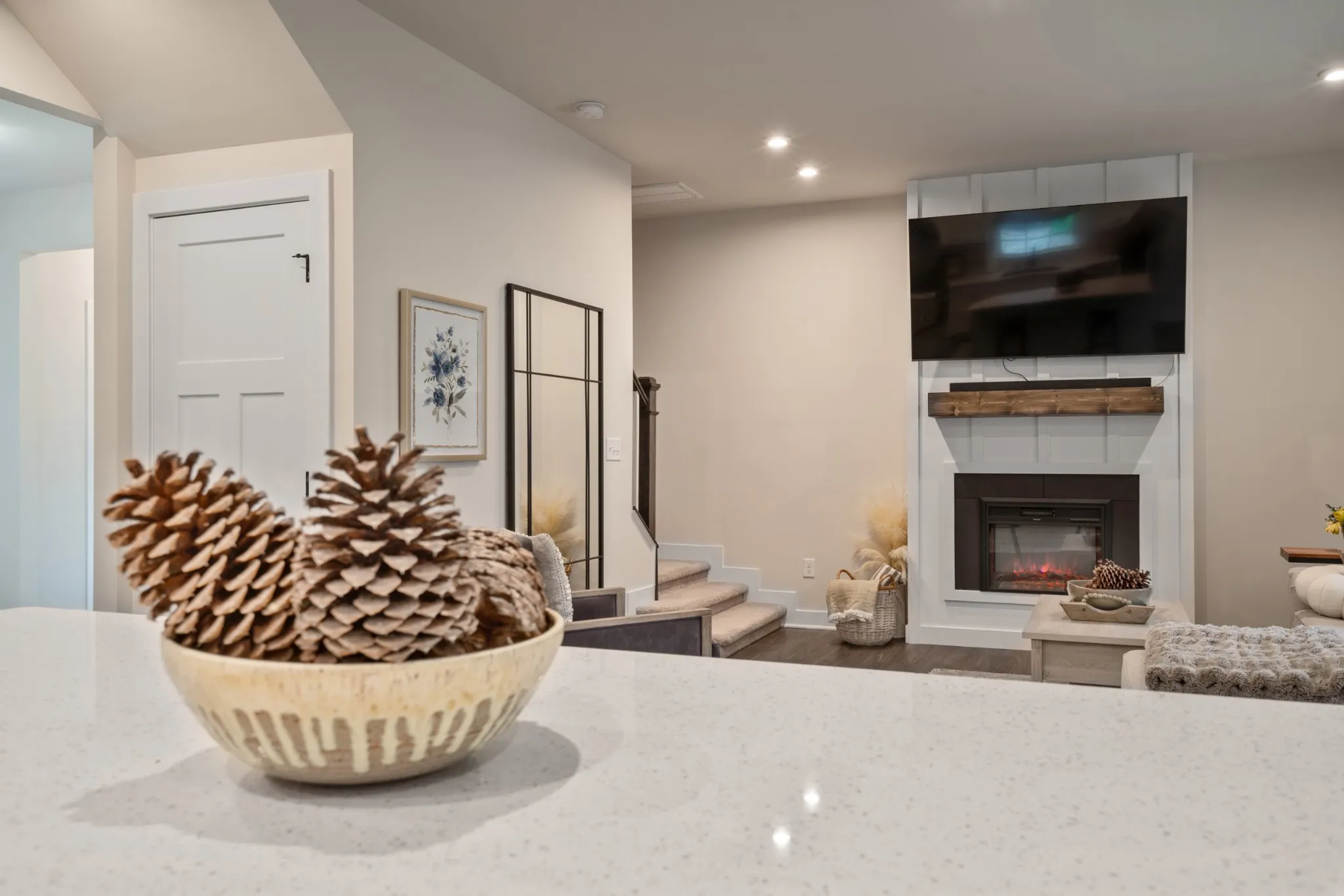 Inside, the living room becomes the heart of the home with a stunning custom fireplace accent wall that sets the tone for cozy nights and memorable gatherings. The kitchen shines with quartz countertops, upgraded white cabinetry with black hardware, luxury vinyl flooring, and a gas range that makes cooking a joy. Downstairs, the private office with glass double doors is perfect for working from home, a playroom, or a quiet reading retreat.
