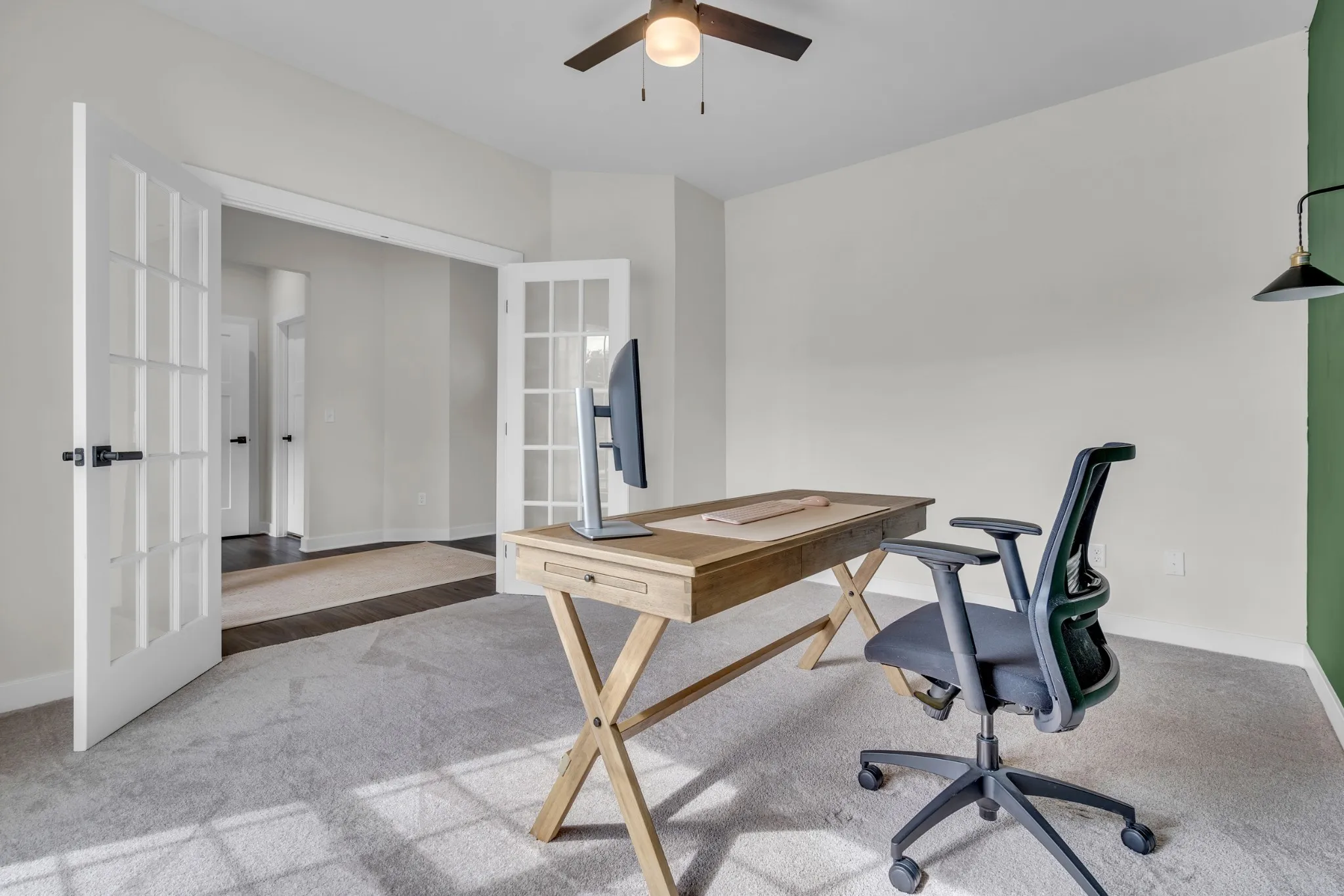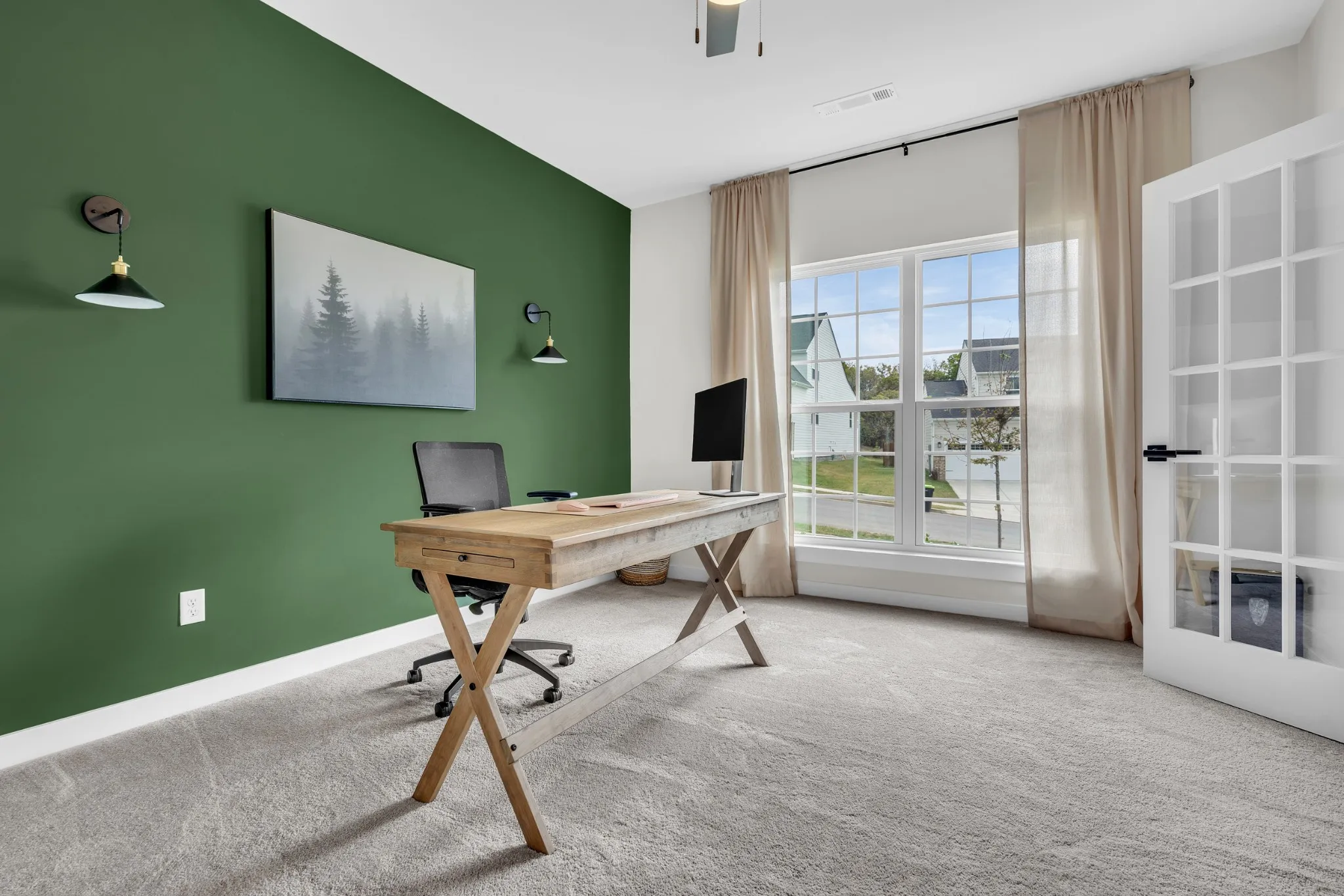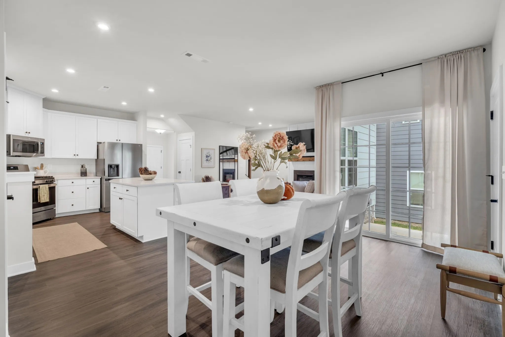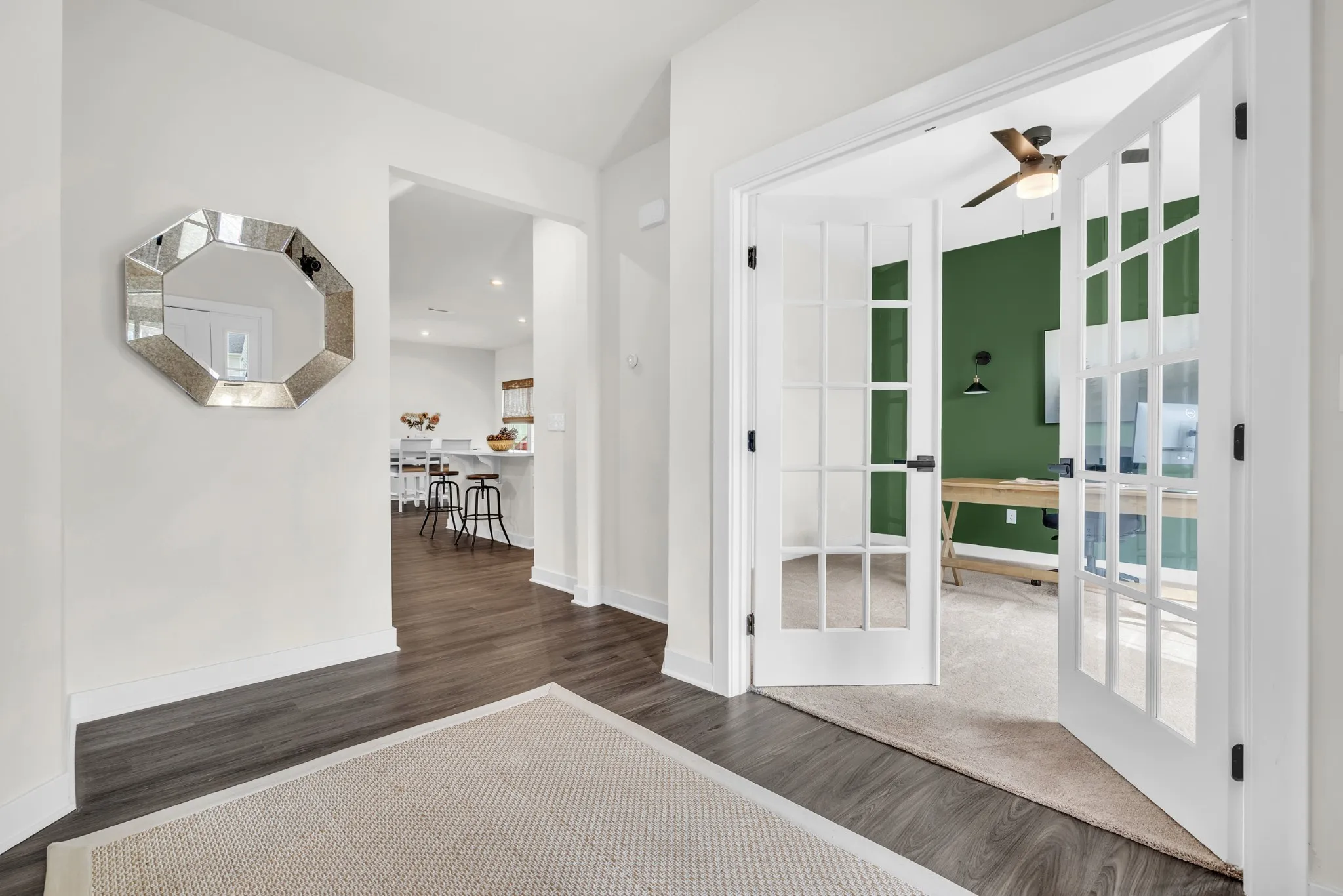 Inside, the living room becomes the heart of the home with a stunning custom fireplace accent wall that sets the tone for cozy nights and memorable gatherings. The kitchen shines with quartz countertops, upgraded white cabinetry with black hardware, luxury vinyl flooring, and a gas range that makes cooking a joy. Downstairs, the private office with glass double doors is perfect for working from home, a playroom, or a quiet reading retreat.