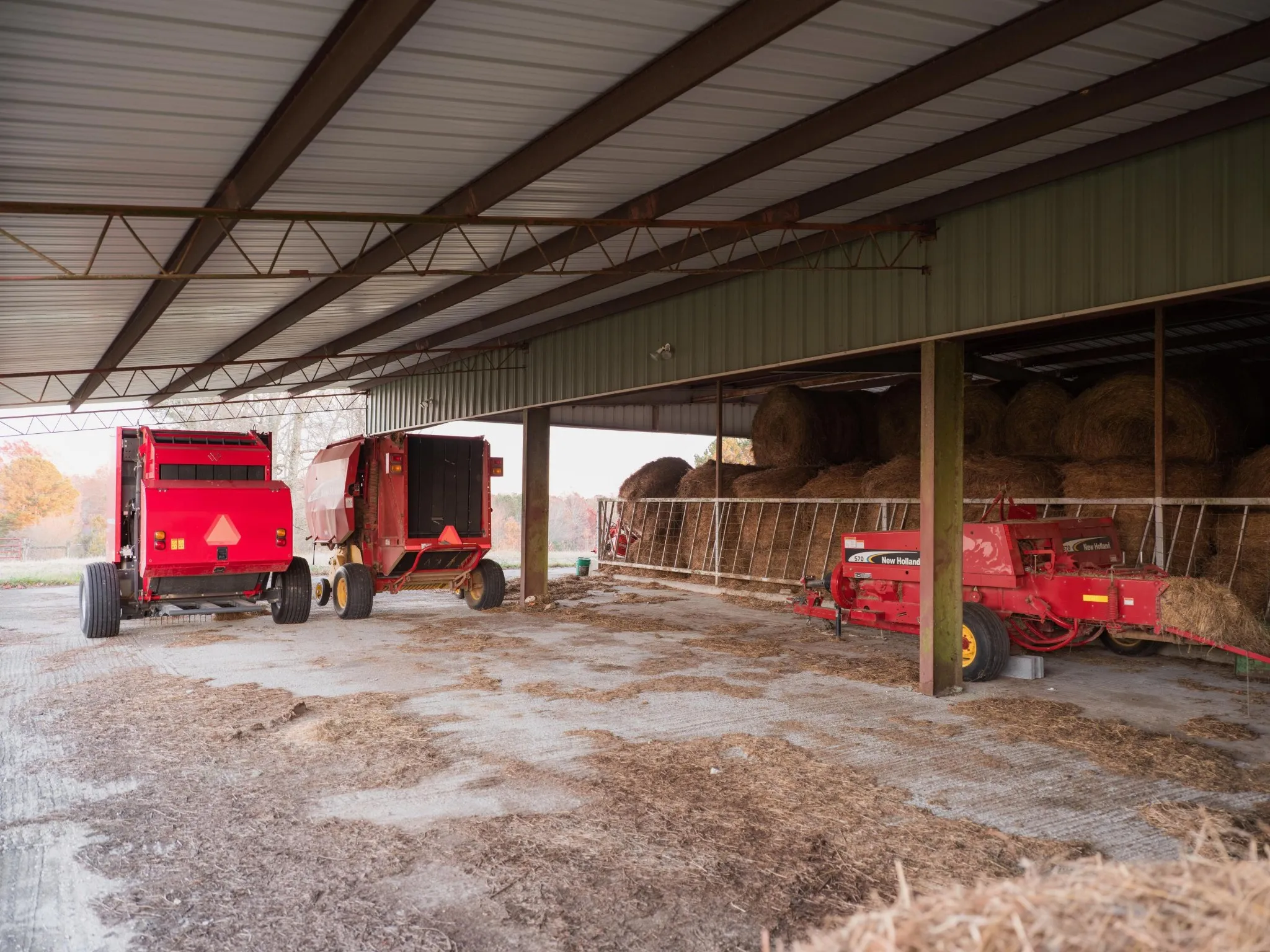 The farm infrastructure is well-positioned and thoughtfully laid out. A large barn measuring approximately 120 feet by 125 feet includes both open and enclosed storage along with working pens designed for livestock handling. Additional structures support equipment storage and day-to-day operations, creating a farmstead that is practical and adaptable.