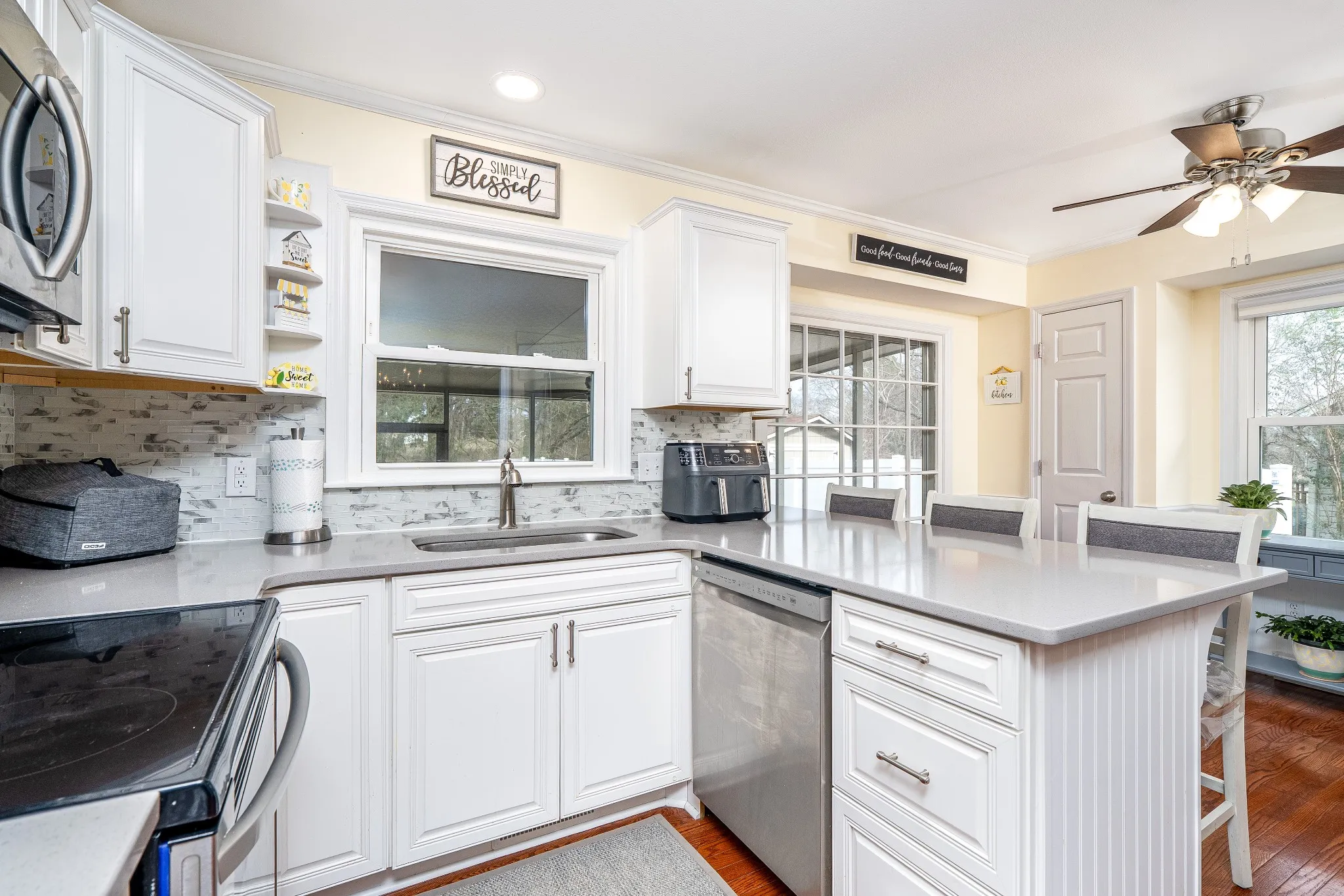 Additional upgrades include new windows, new storm doors, a new hot water heater, and an HVAC system approximately 5 years old. Step outside to enjoy the large, private backyard featuring vinyl privacy fencing and a relaxing screened-in patio—your own peaceful retreat.
