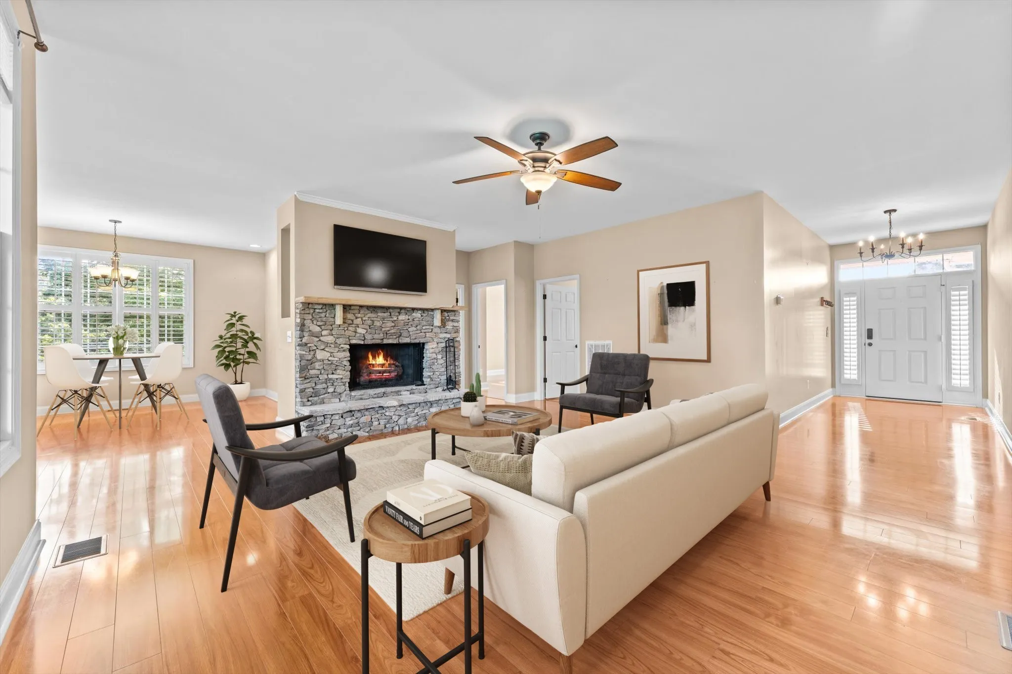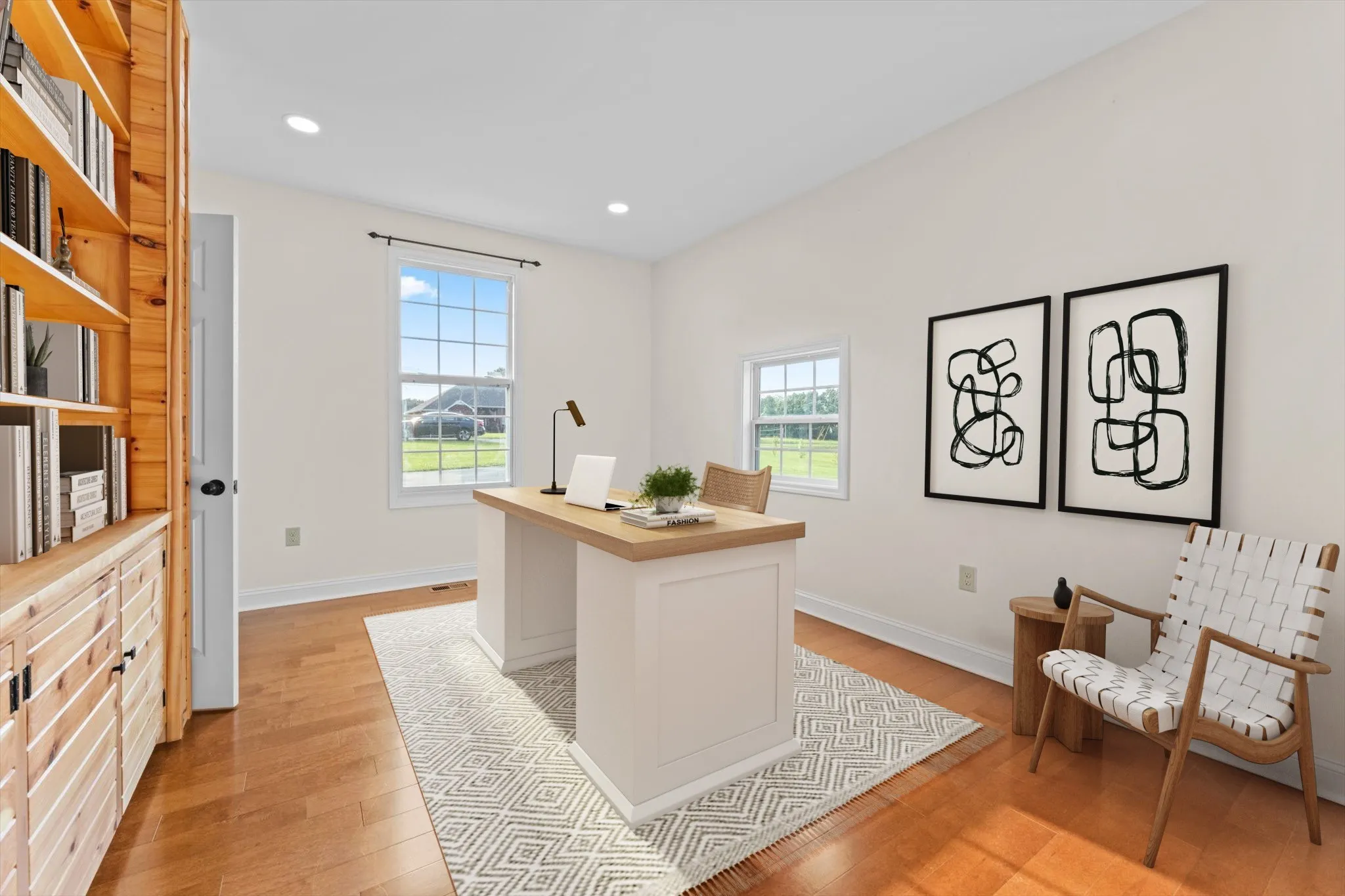 This open-concept home offers 3 bedrooms, 2 bathrooms, an office, AND a separate cozy library/reading room with custom-built wooden bookshelves. The gourmet eat-in kitchen features stainless steel appliances, while the spacious primary suite includes a generous bath and walk-in closet.
