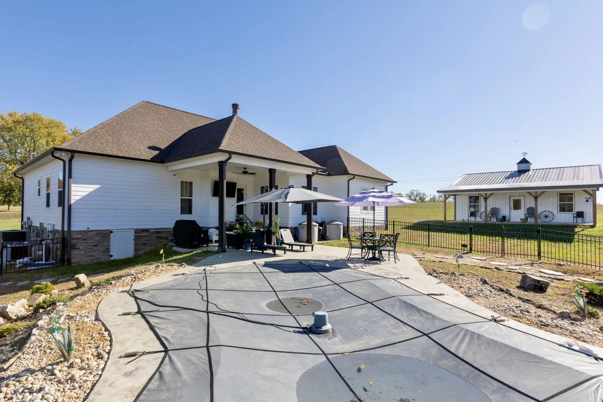 Stunning “LIKE NEW” Home on 5 acres with Lagoon Inground Pool! 4 Bedrooms, 3.5 Baths, Huge Bonus Room, 2 car attached Garage & 30×30 Outbuilding! Luxurious living featuring open floor plan with Hardwood flooring throughout & Tiled floors in Baths! Custom Kitchen with Granite, oversized Island, Stainlesss Steel appliances remain, big Pantry, Breakfast area & Formal Dining room! Primary Suite double granite vanities, tiled shower, garden tub & X-large Walk in closet! Laundry room with Utility sink! Gorgeous Saltwater Lagoon style inground 30’ swimming pool with sunbathing shelf (6 ft deep end) & Covered patio is a private backyard Oasis! 3100 sq ft! Country living with easy access to nearby amenities! Truly the best of both worlds! Ring doorbell & outside cameras remain! Mounted tv’s in living room, bonus room & outside remain.