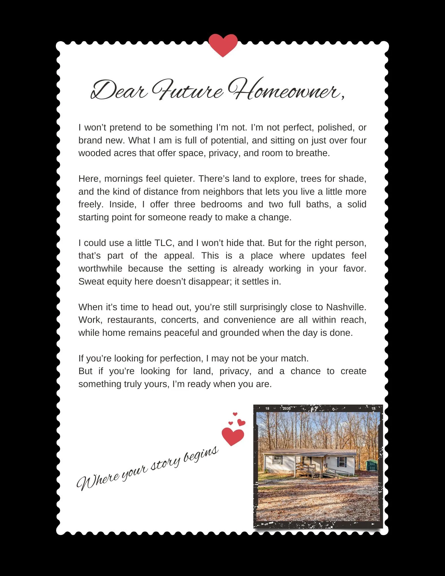 Located in Ashland City with a quick, workable commute to Nashville, this property offers space and freedom while still maintaining access to work, dining, and conveniences. Ideal for buyers who prioritize acreage, affordability, and potential.