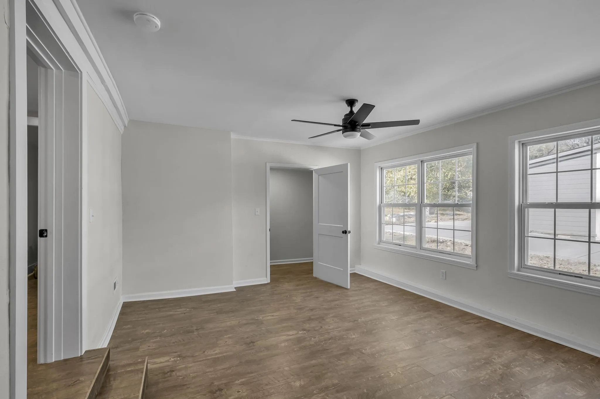 The home also features a spacious entryway with the perfect nook for a dry bar, adding extra versatility. Step outside and enjoy the large front deck that extends your living space outdoors, ideal for relaxing or hosting friends. Parking is convenient with a private driveway tucked behind the house.