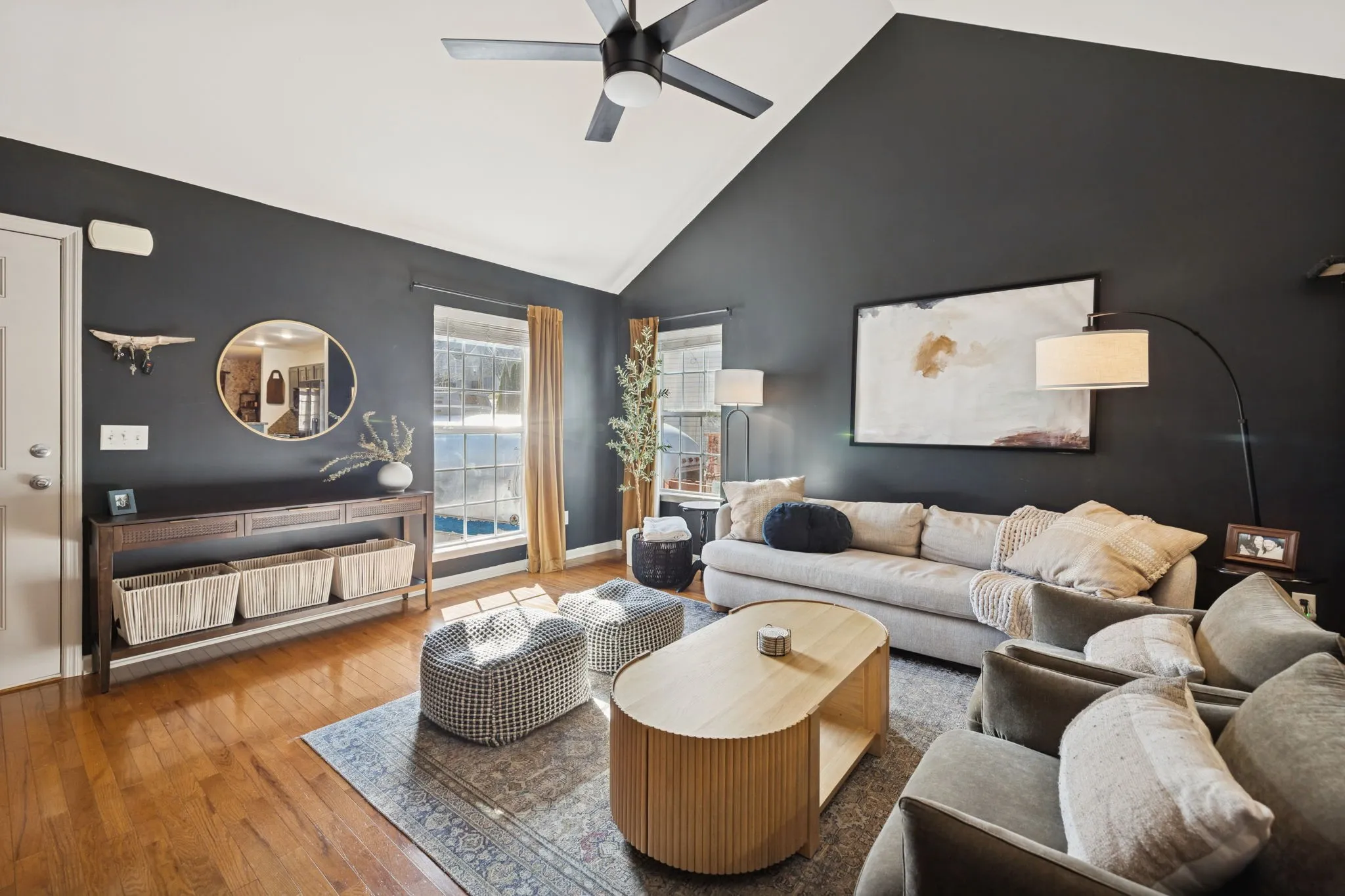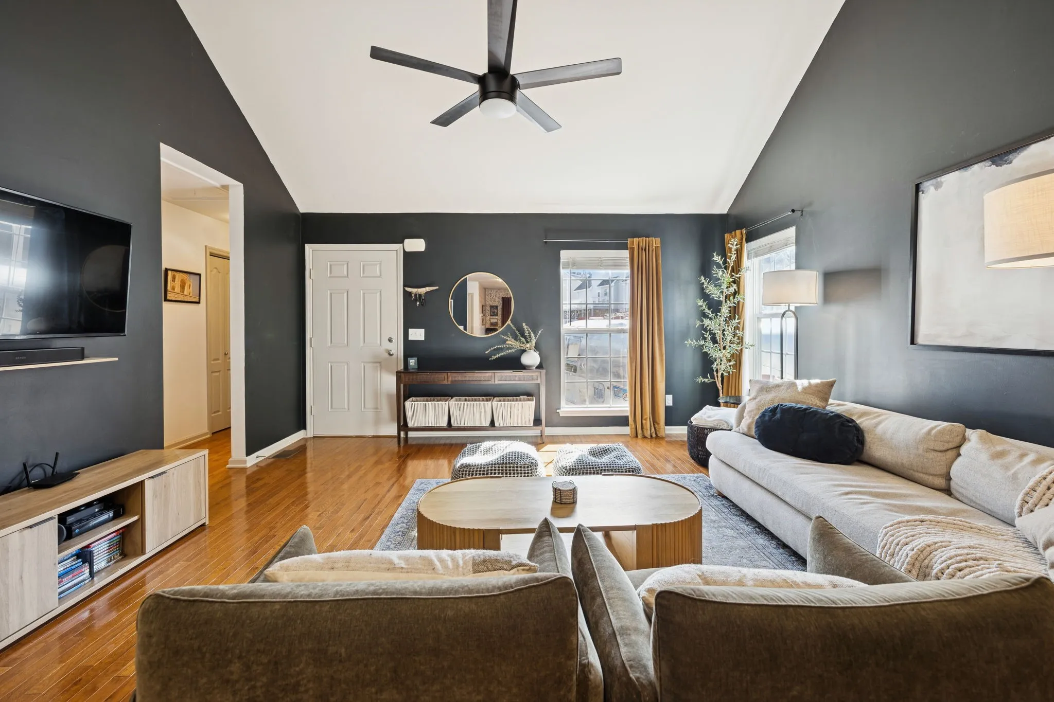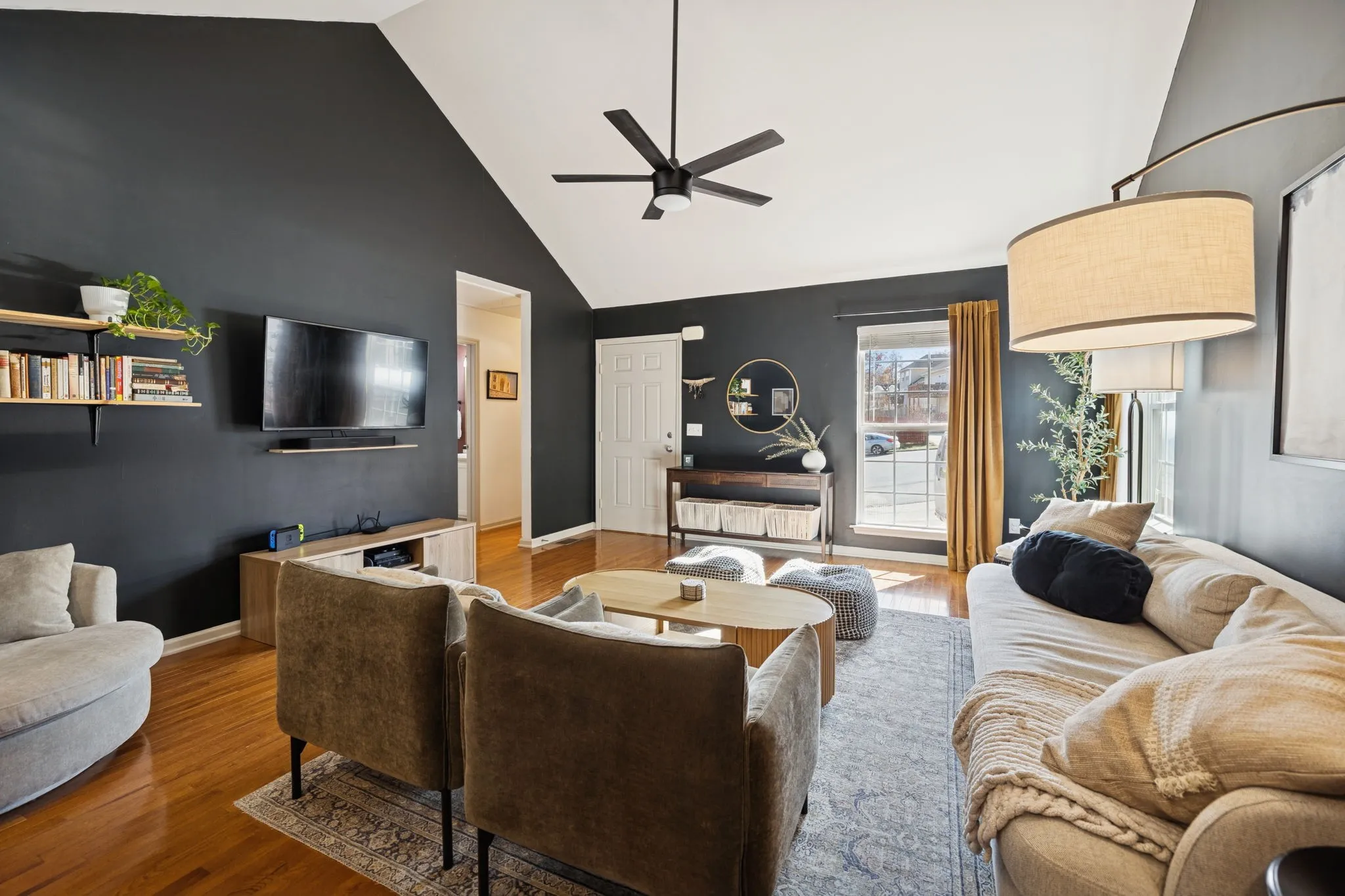 This charming 3-bedroom, 2-bath home offers 1,208 square feet of comfortable living with modern touches throughout. Vaulted ceilings, hardwood flooring and contemporary finishes create a bright, welcoming atmosphere. Enjoy meals at the kitchen island or in the stylish dining area. The primary bedroom with ensuite bathroom is set towards the back of the home offering a private retreat. Two additional bedrooms share a full bathroom and separate hallway with extra storage. A fenced in backyard provides privacy and peaceful wooded views with no neighbors behind the home. Enjoy the screened-in porch, gather around the fire pit, or entertain friends in the spacious outdoor area. Practical features include a large driveway with plenty of parking, extra storage in the walk-in crawlspace and a quiet cul-de-sac location. Water heater, dishwasher and fridge are all brand new and whole house water softener was installed in 2023. Conveniently situated just 15 minutes from Nashville International Airport and 20 minutes from downtown, this home combines tranquility with accessibility.
