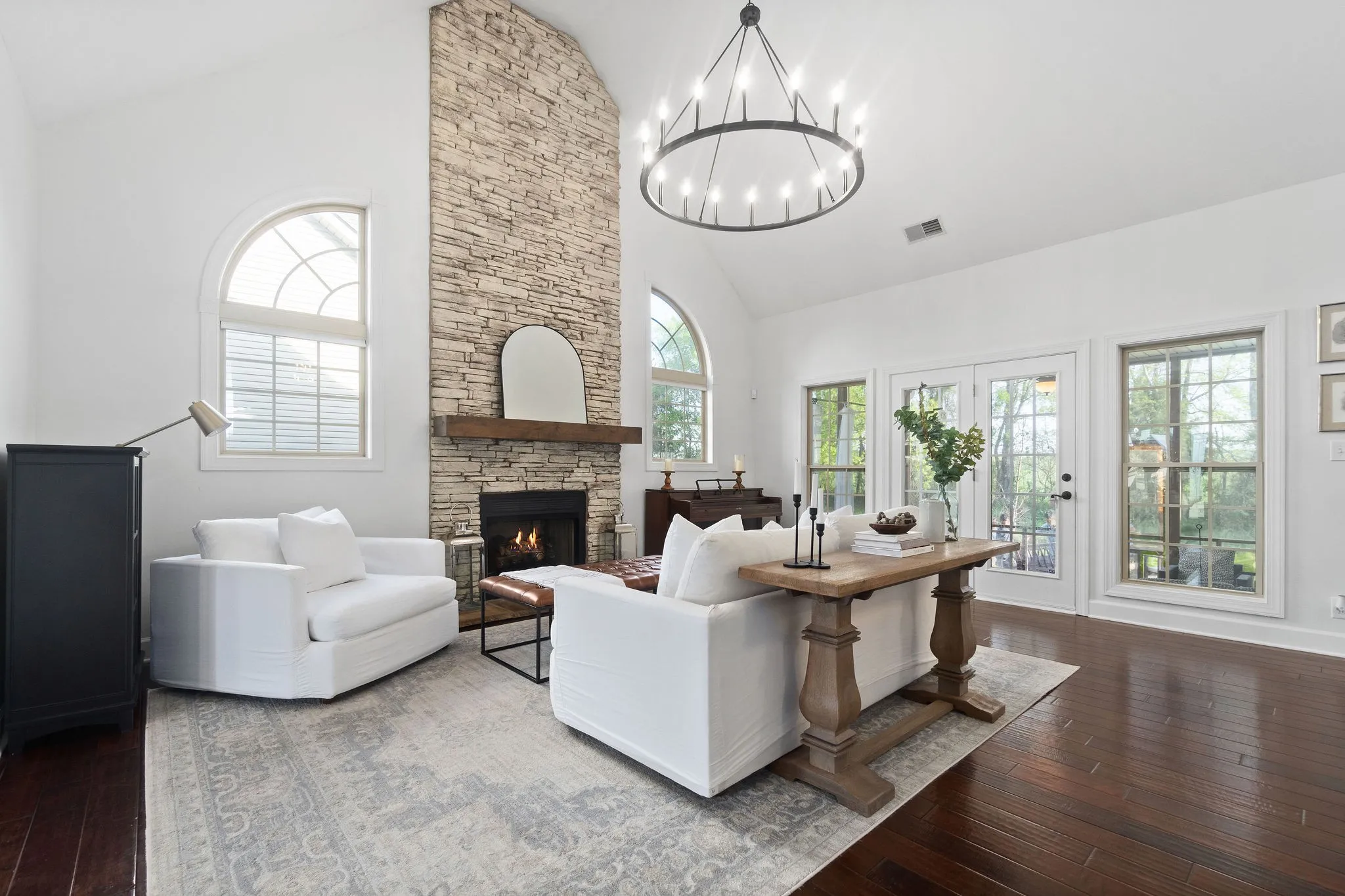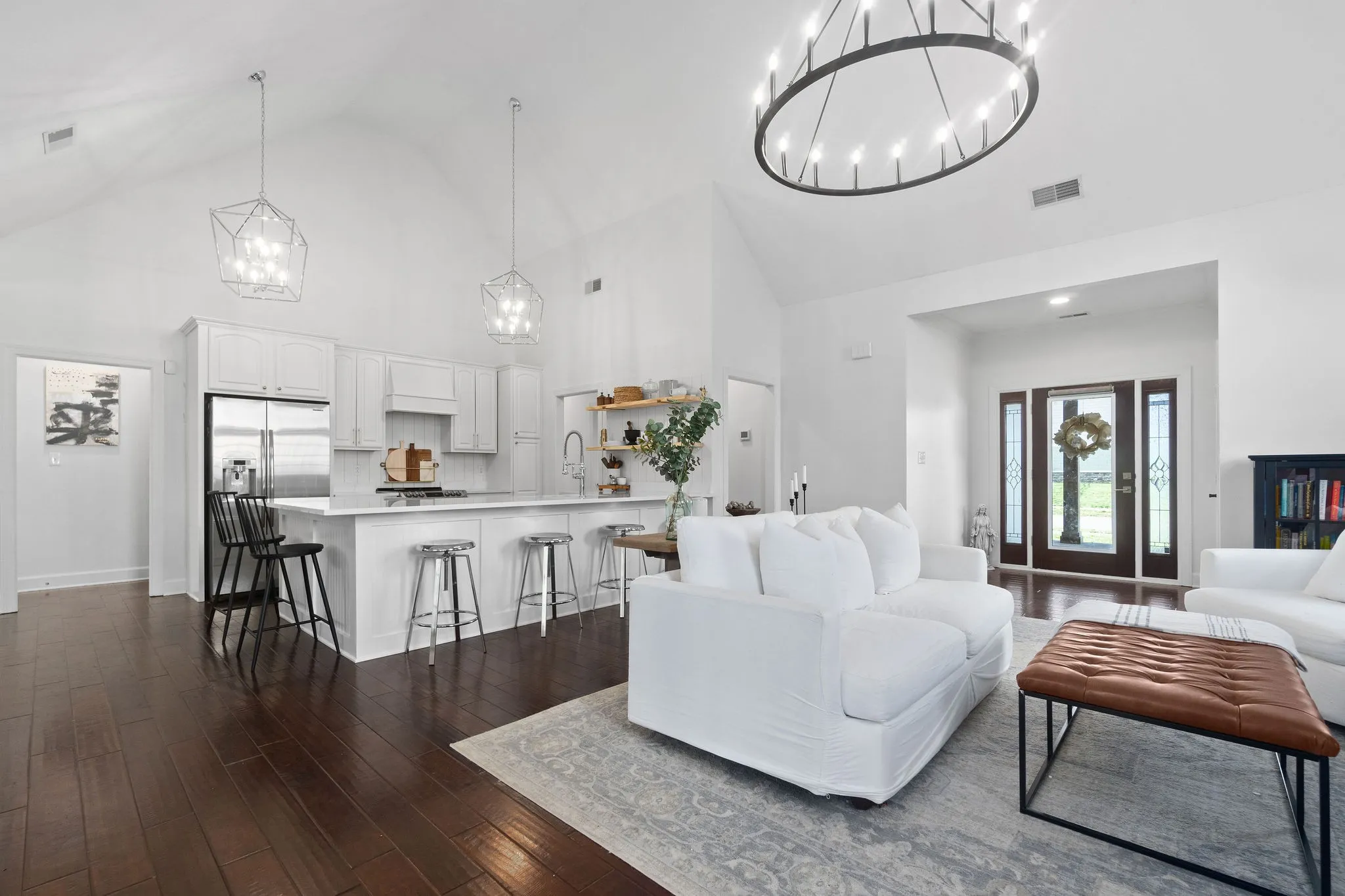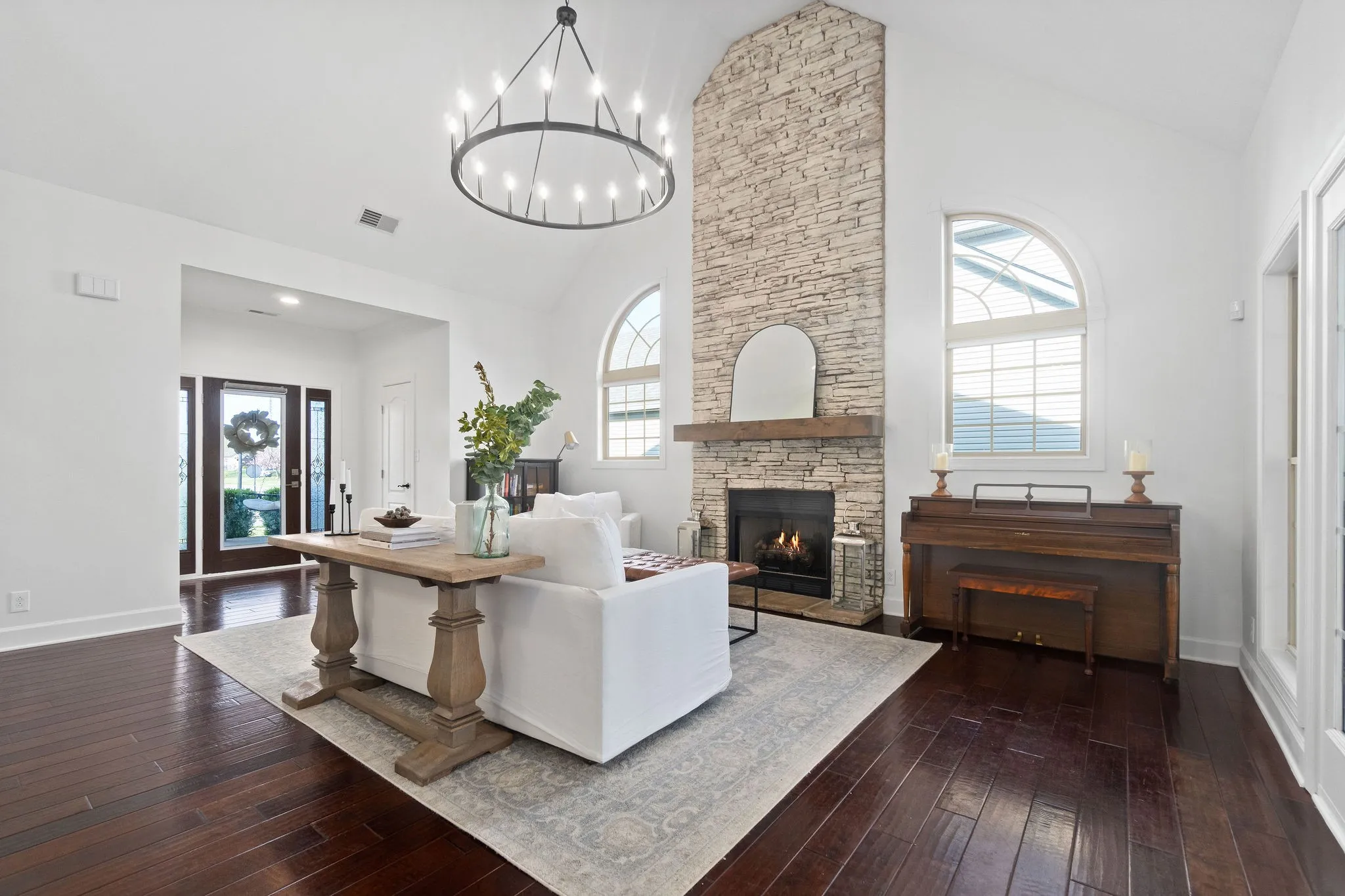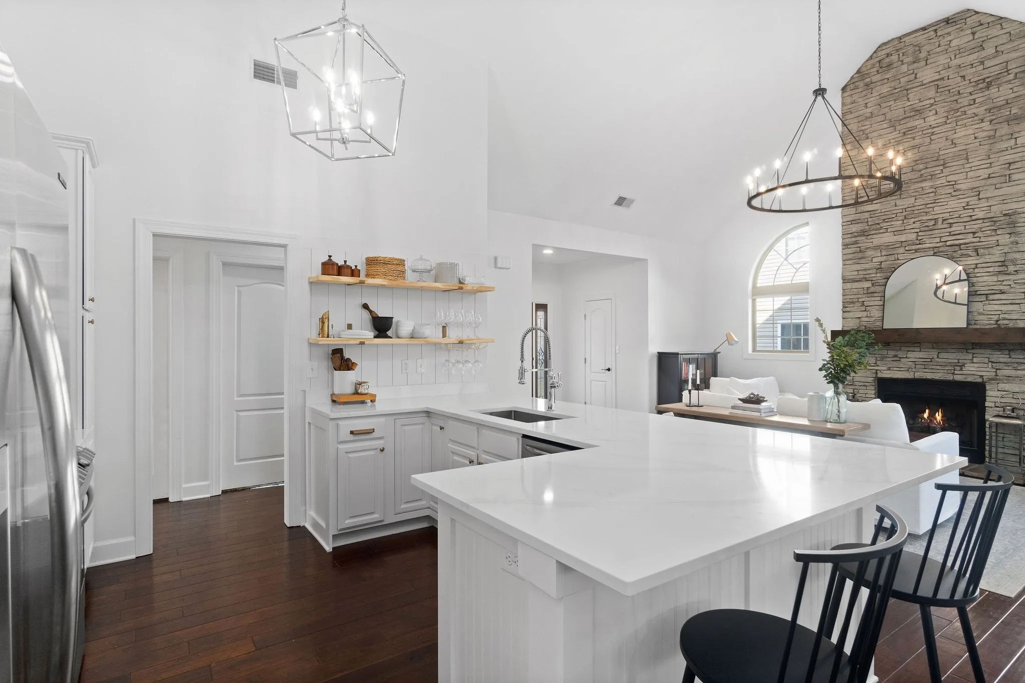 Step onto the inviting covered front porch and into the living room featuring vaulted ceilings and a stunning floor-to-ceiling stone fireplace, creating a warm and welcoming focal point. The kitchen is designed for both style and function, showcasing quartz countertops, floating shelves, and a large island with seating for up to six, perfect for casual dining and entertaining.