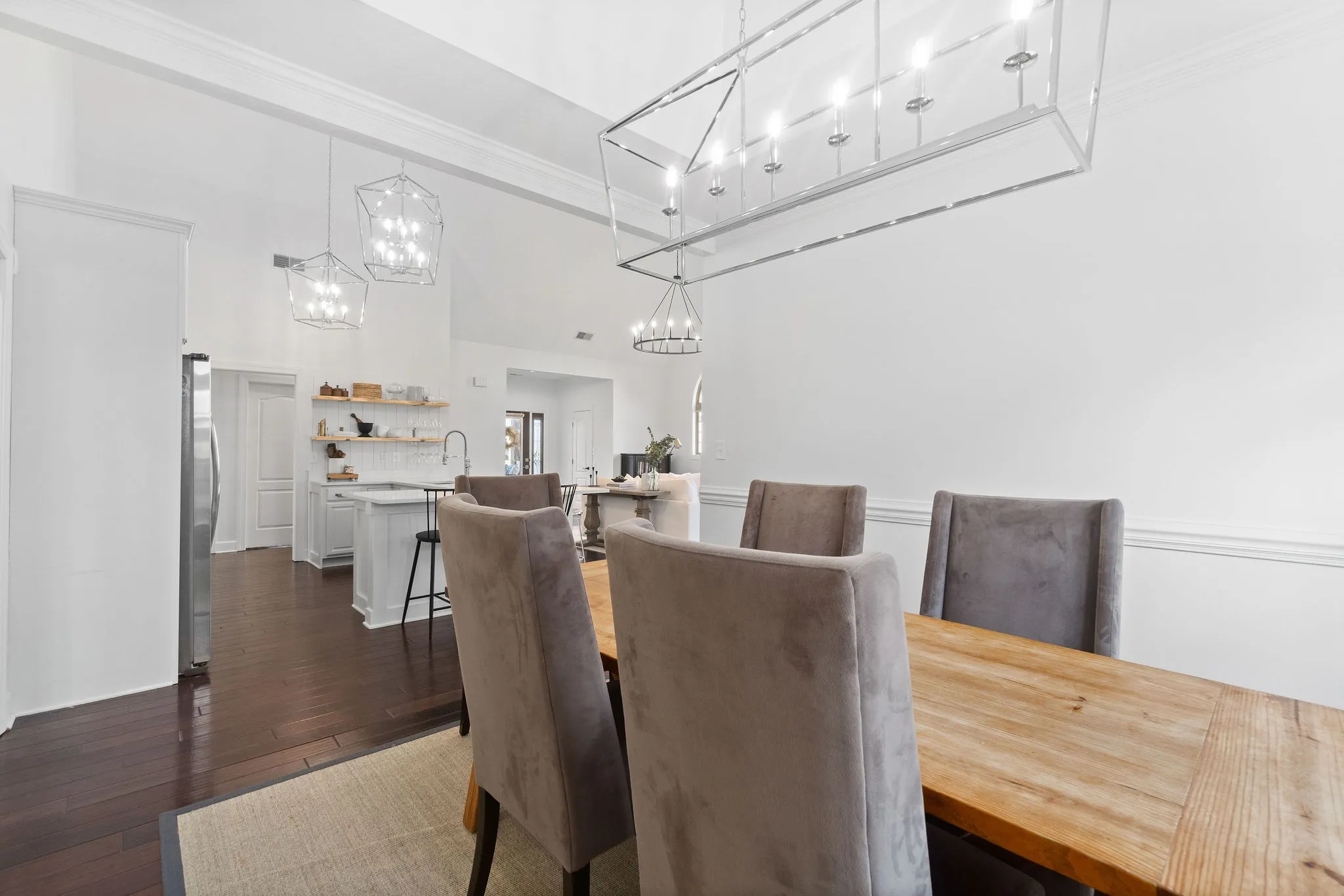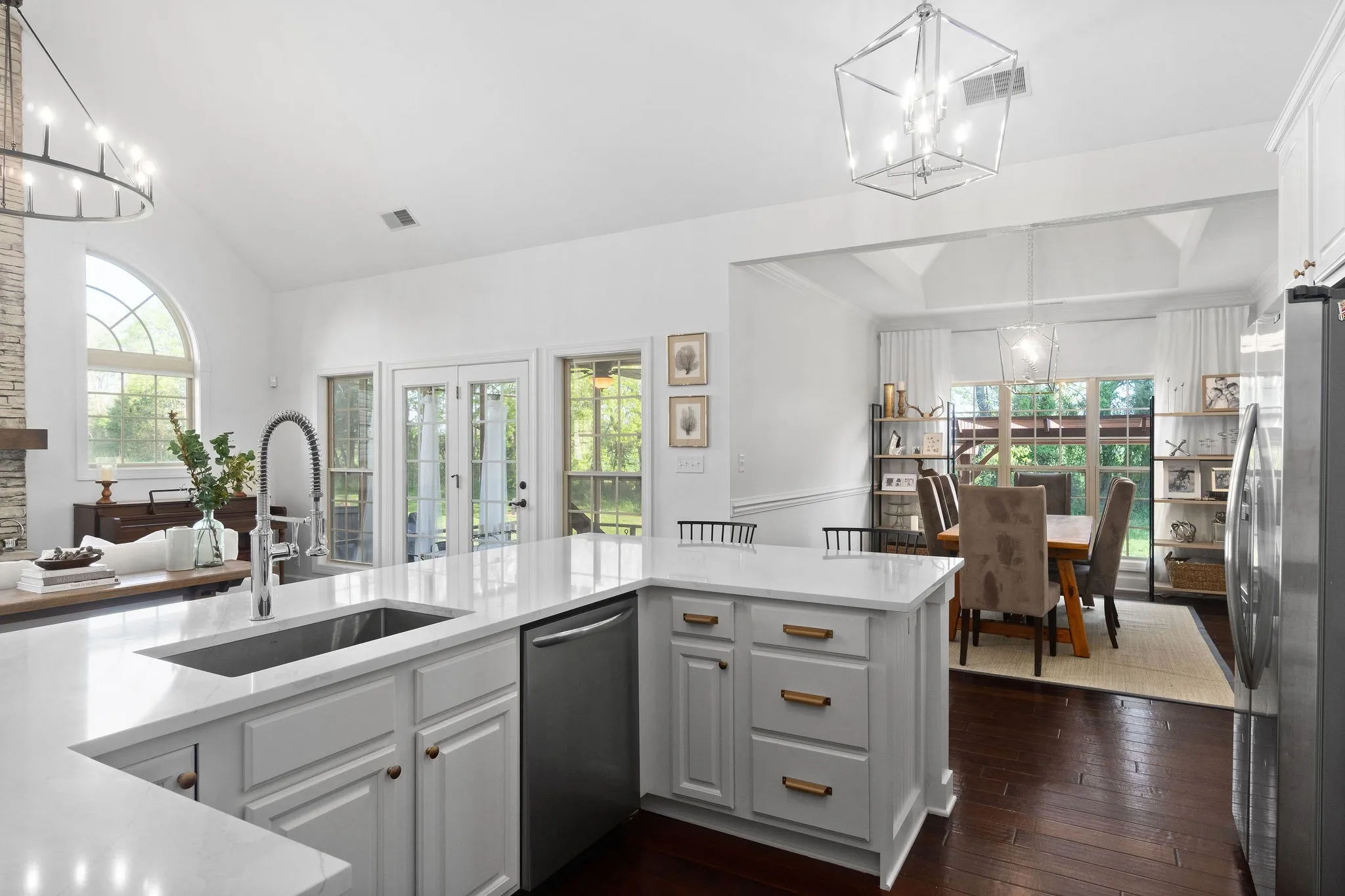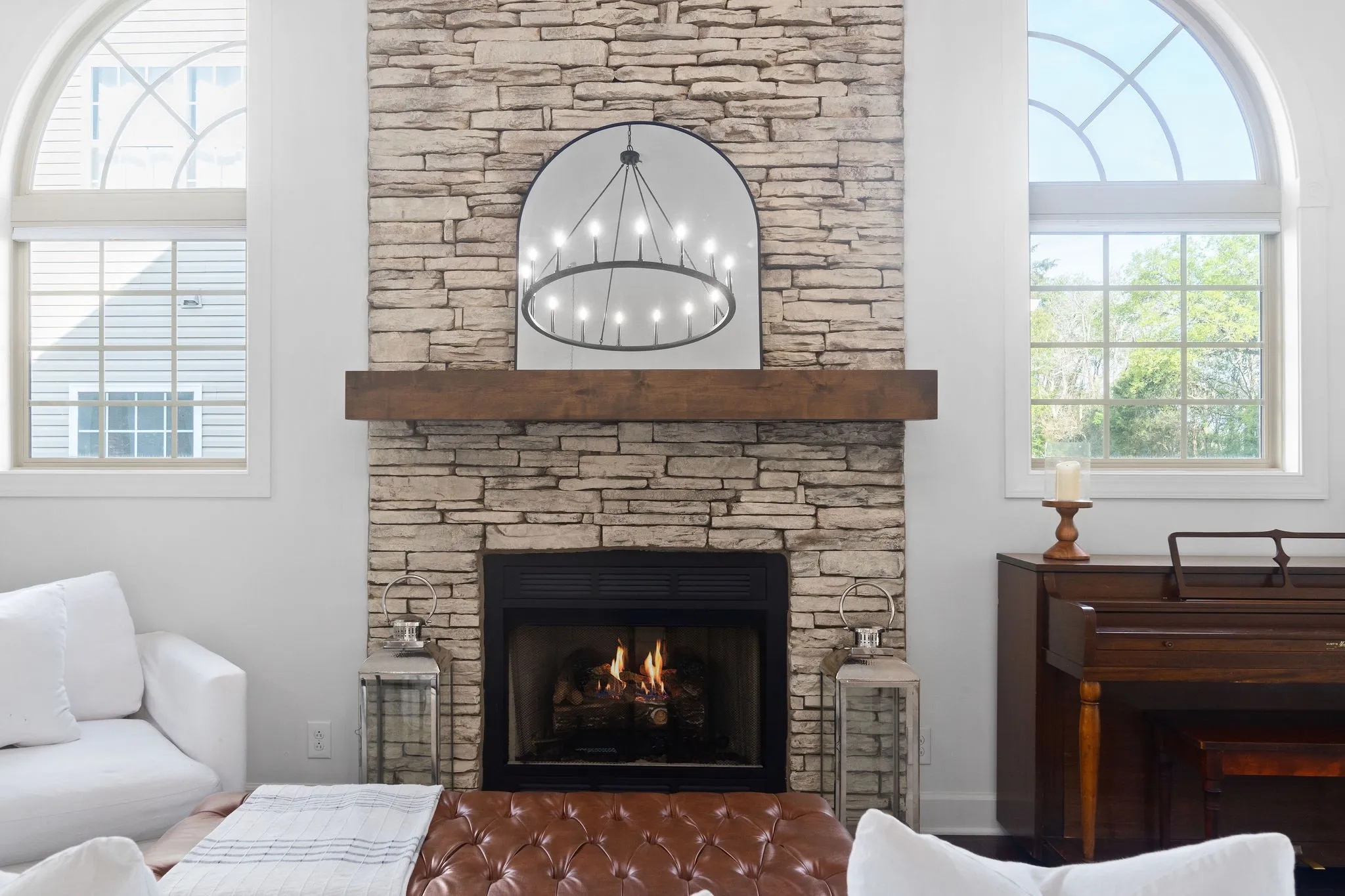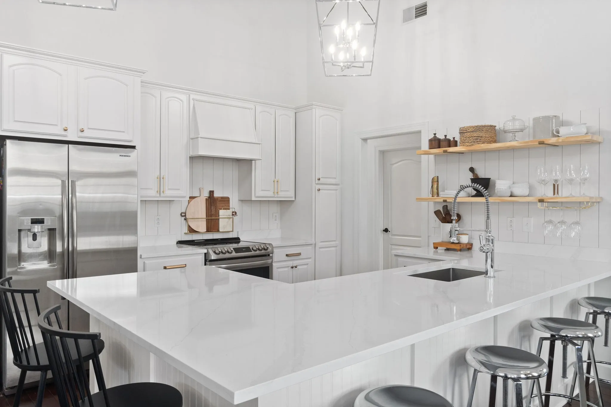 Step onto the inviting covered front porch and into the living room featuring vaulted ceilings and a stunning floor-to-ceiling stone fireplace, creating a warm and welcoming focal point. The kitchen is designed for both style and function, showcasing quartz countertops, floating shelves, and a large island with seating for up to six, perfect for casual dining and entertaining.