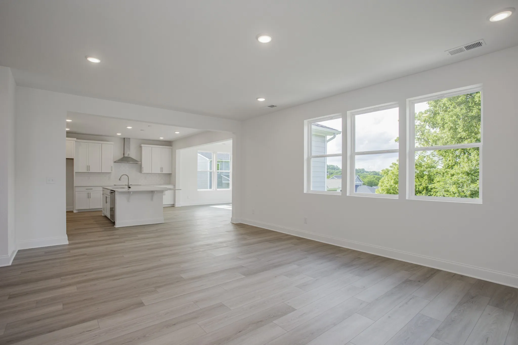 The GOURMET KITCHEN, appointed with all STAINLESS STEEL appliances and a large island, is OPEN to the LARGE GREAT ROOM. This expansive, seamless space is perfect for hosting gatherings, holiday feasts, or simply unwinding at home. A half bath is conveniently located downstairs for guests.