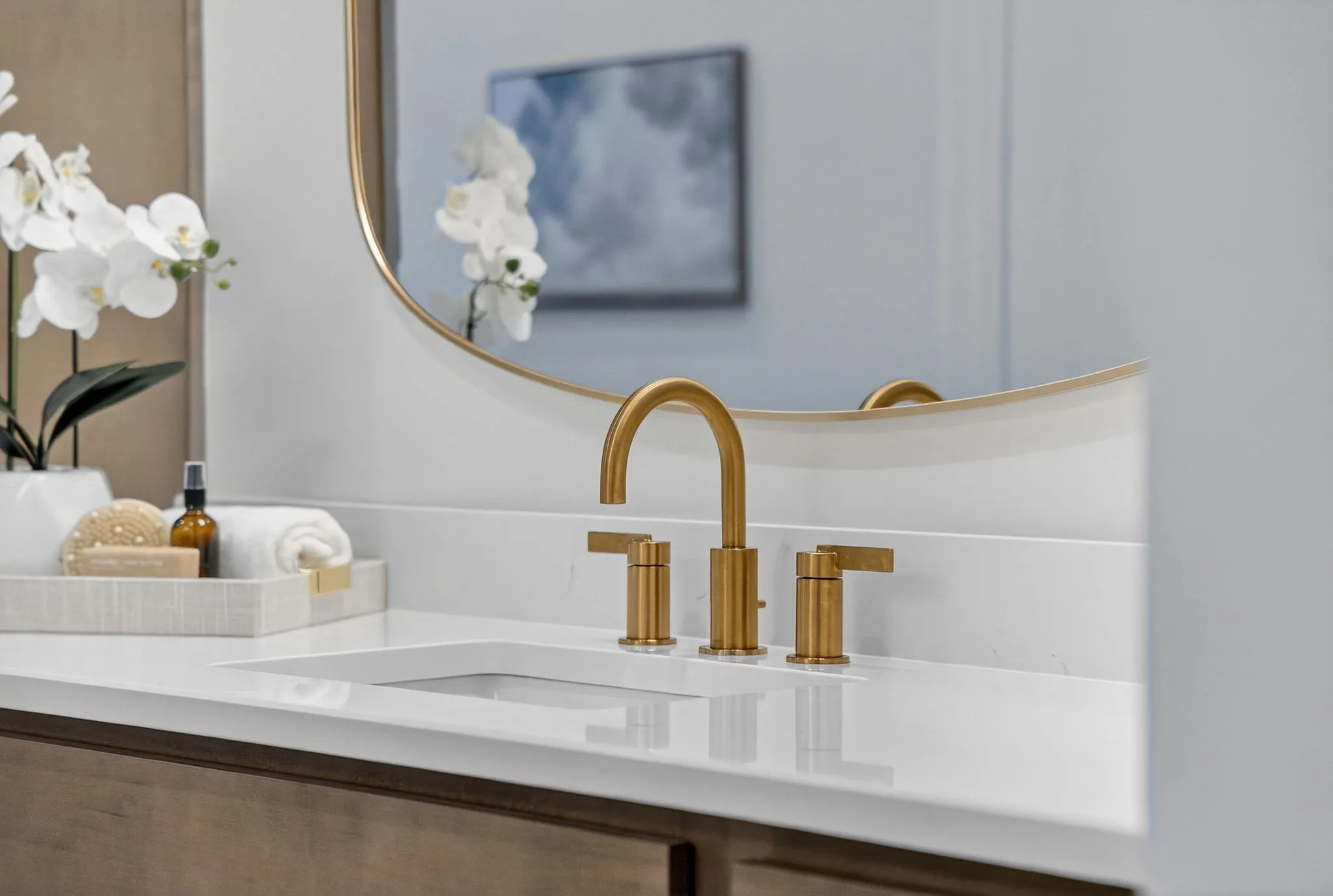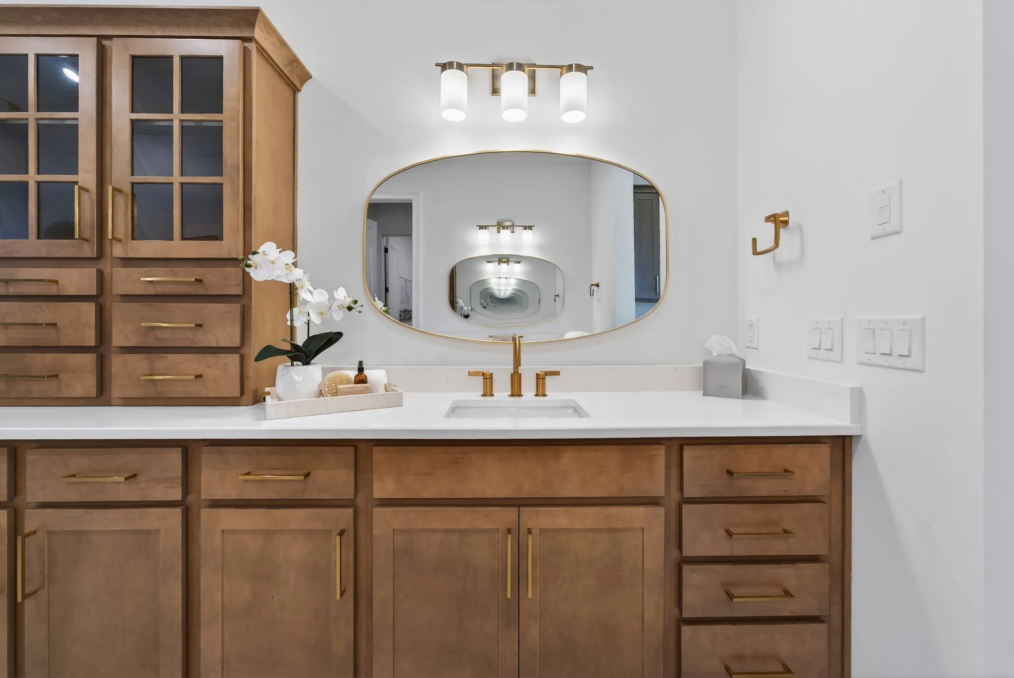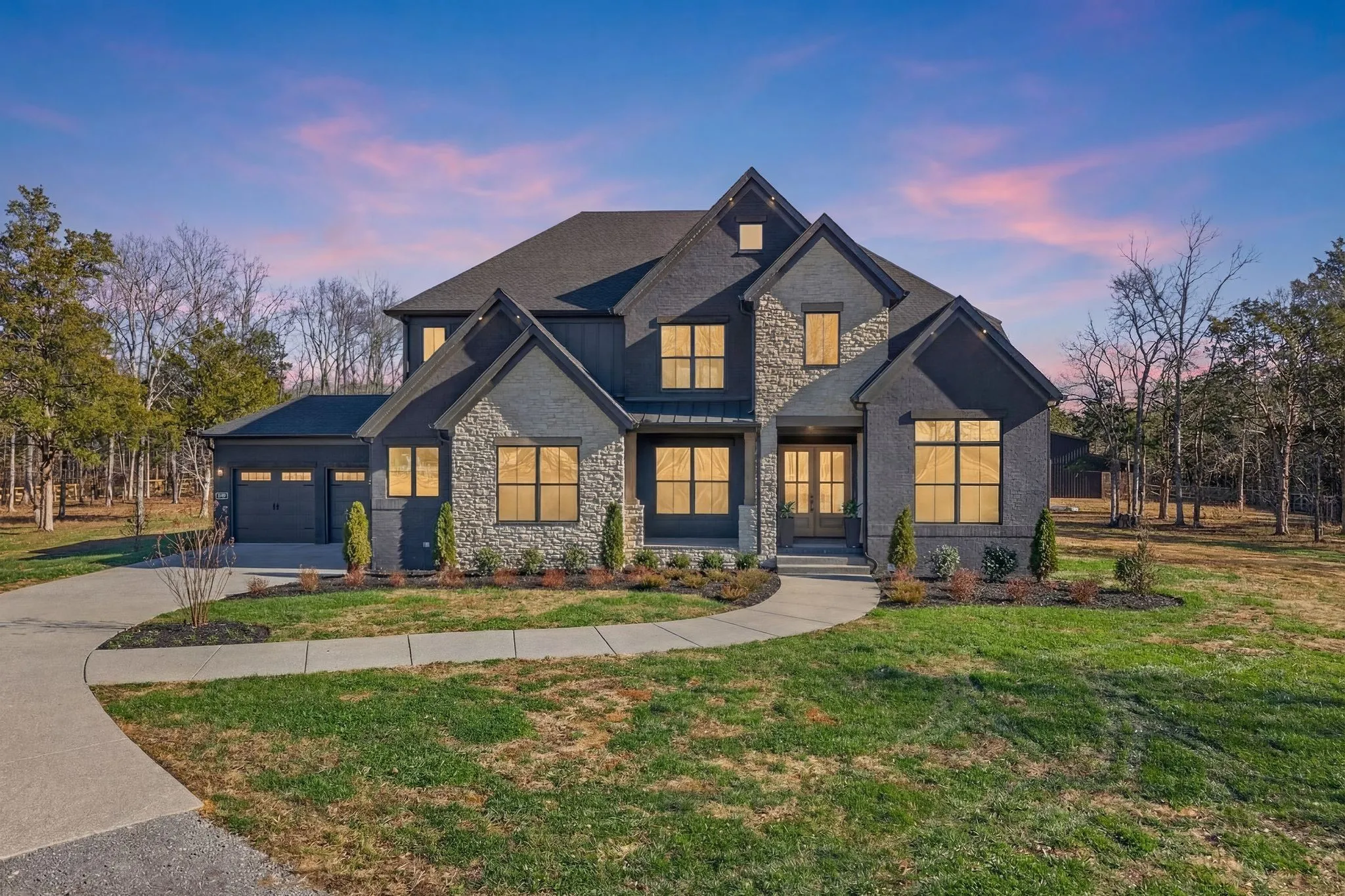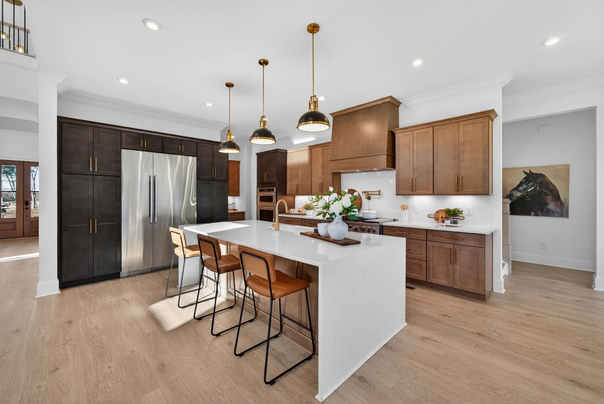 Upon entry, you are welcomed by a striking two-story foyer featuring elegant white oak plank flooring that flows throughout the main living areas. The chef’s kitchen is a true showpiece with an oversized stunning waterfall island, custom wood cabinetry, and high-end, custom-built appliances. Highlights include a 48-inch gas smart range with custom hood, double ovens, a six-burner cooktop with griddle and pot filler, stainless steel refrigerator, beautiful backsplash, and a spacious island with a ceramic farmhouse sink—perfect for gathering and entertaining. The main-level primary suite offers a peaceful retreat, complete with two large walk-in, dressing-room–style closets, double vanities, and an oversized tiled shower. Upstairs, the home continues to offer warmth and versatility for family and guests, including a large yet tucked away media room ideal for gaming, movies, music, reading, or hobbies.\n