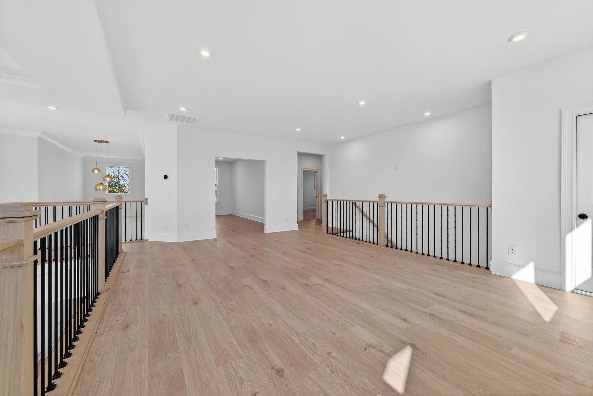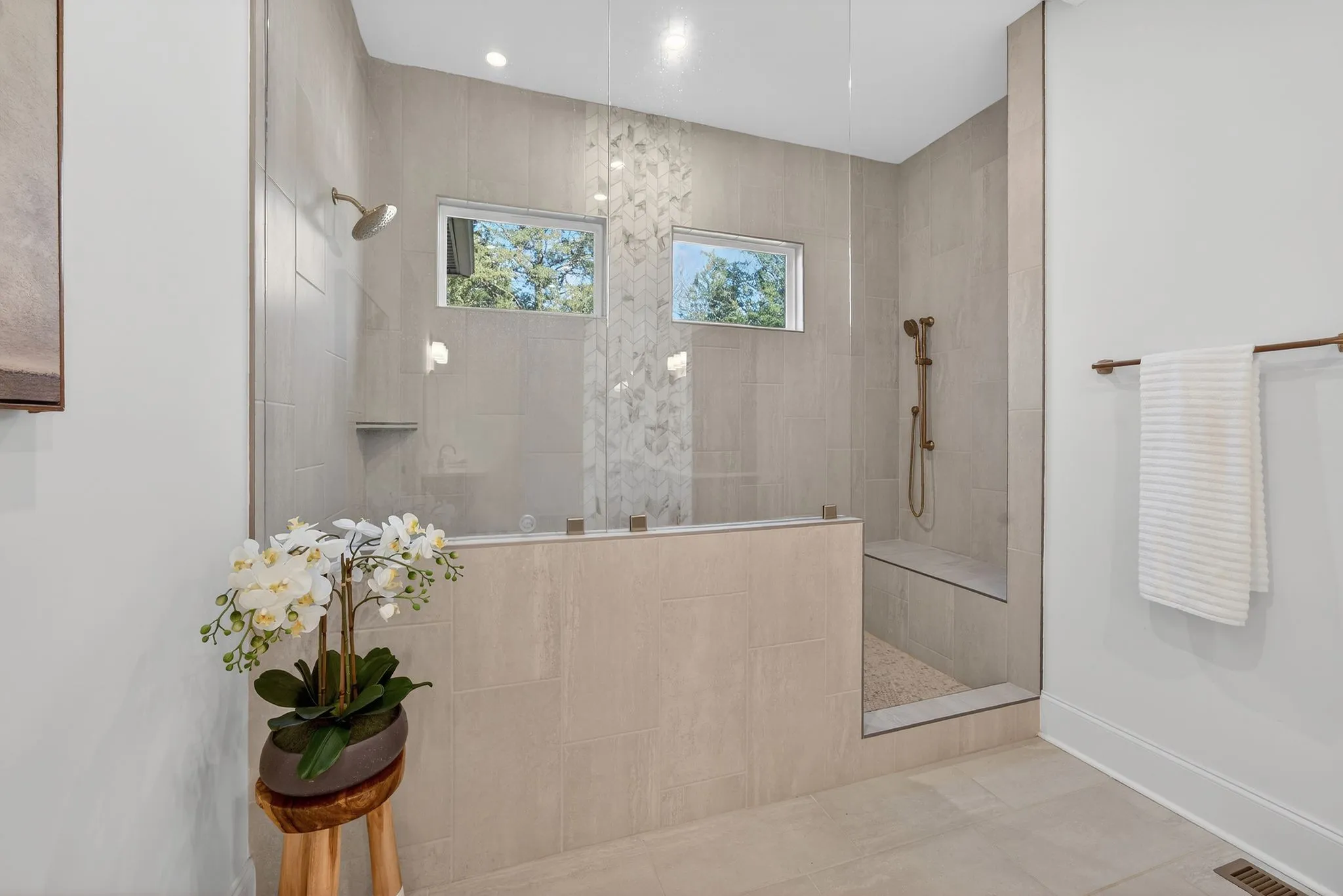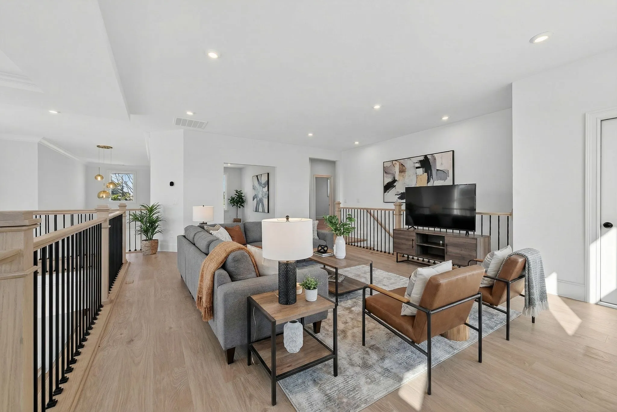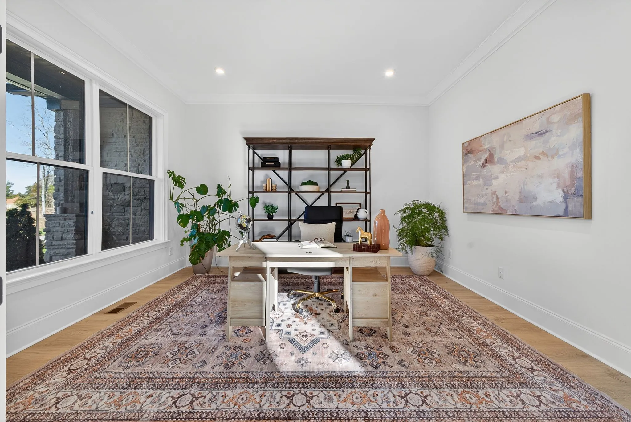 Upon entry, you are welcomed by a striking two-story foyer featuring elegant white oak plank flooring that flows throughout the main living areas. The chef’s kitchen is a true showpiece with an oversized stunning waterfall island, custom wood cabinetry, and high-end, custom-built appliances. Highlights include a 48-inch gas smart range with custom hood, double ovens, a six-burner cooktop with griddle and pot filler, stainless steel refrigerator, beautiful backsplash, and a spacious island with a ceramic farmhouse sink—perfect for gathering and entertaining. The main-level primary suite offers a peaceful retreat, complete with two large walk-in, dressing-room–style closets, double vanities, and an oversized tiled shower. Upstairs, the home continues to offer warmth and versatility for family and guests, including a large yet tucked away media room ideal for gaming, movies, music, reading, or hobbies.\n