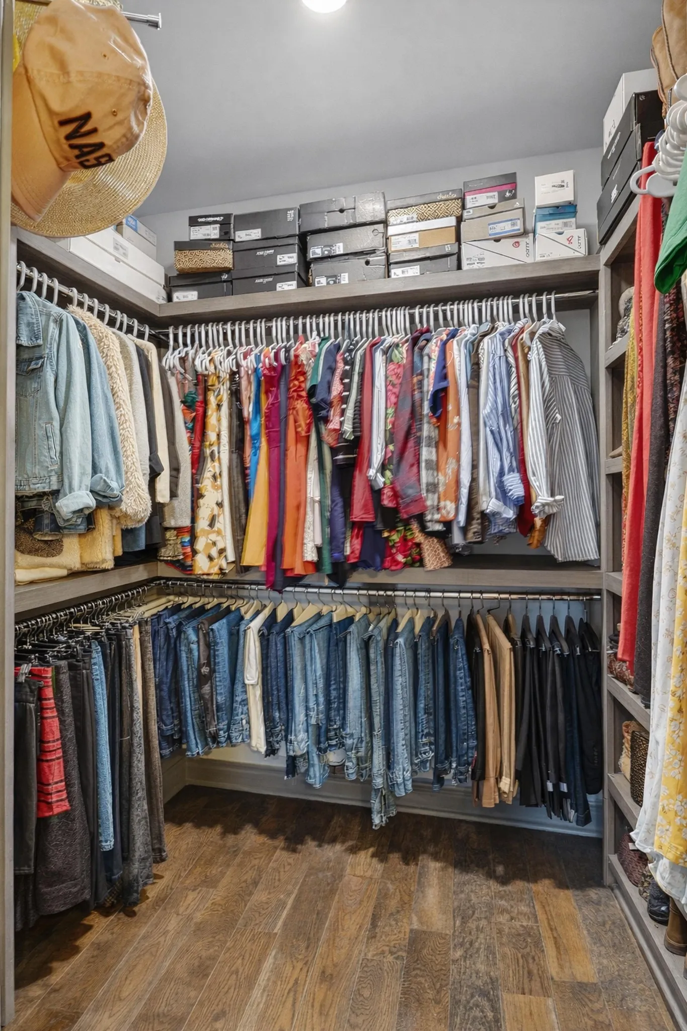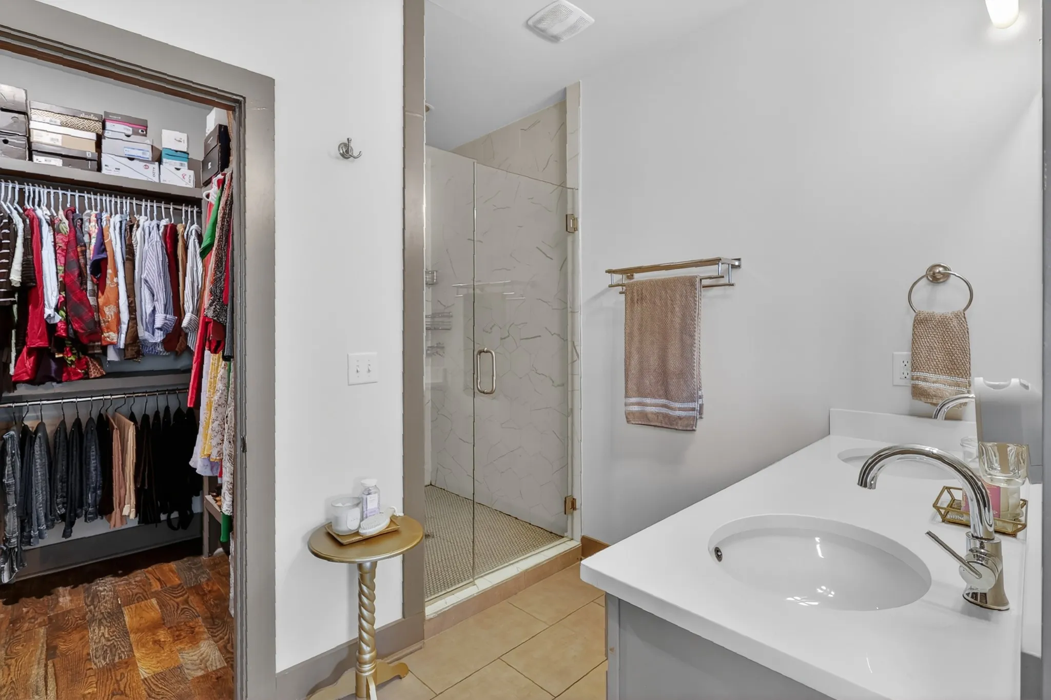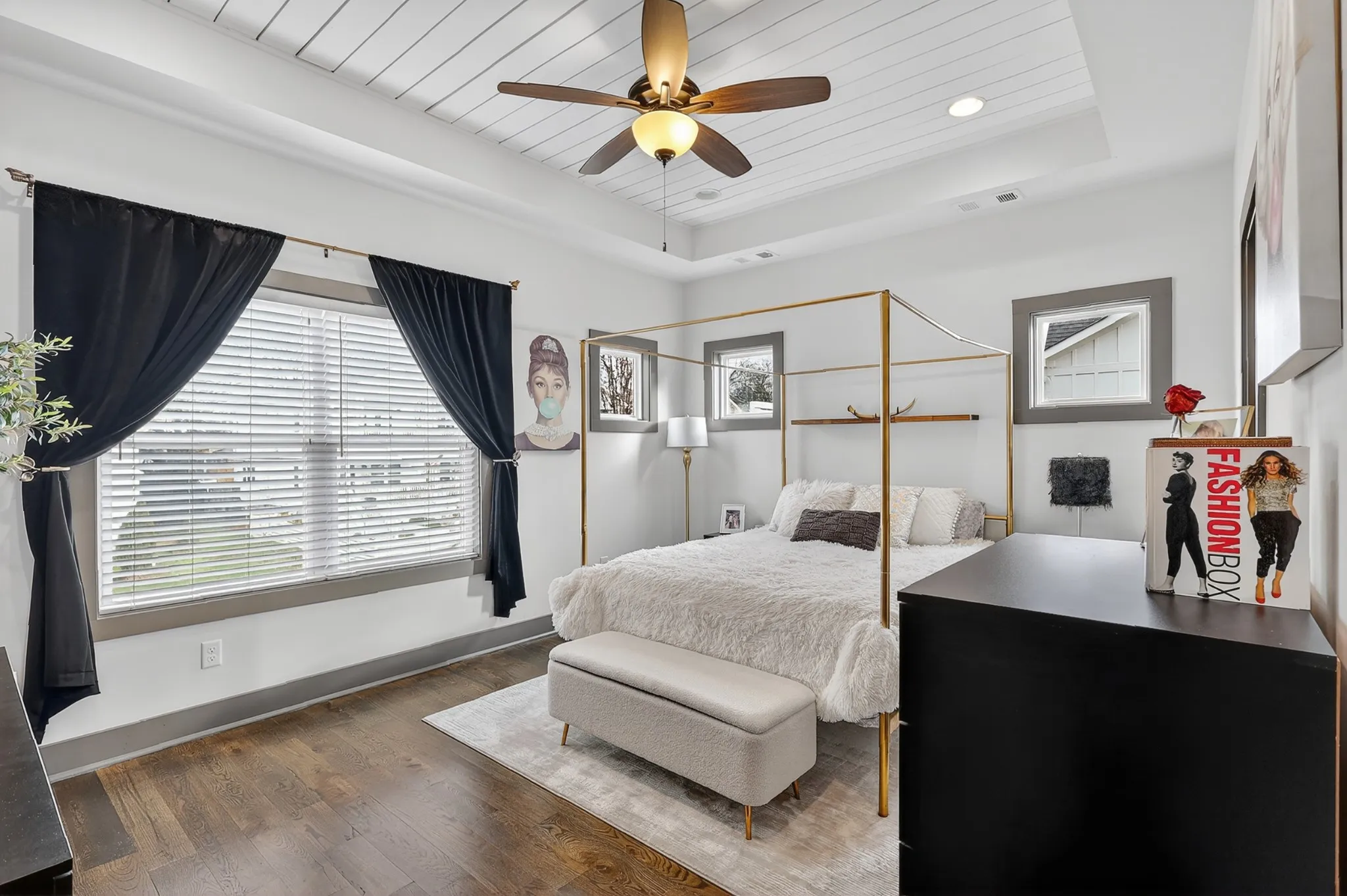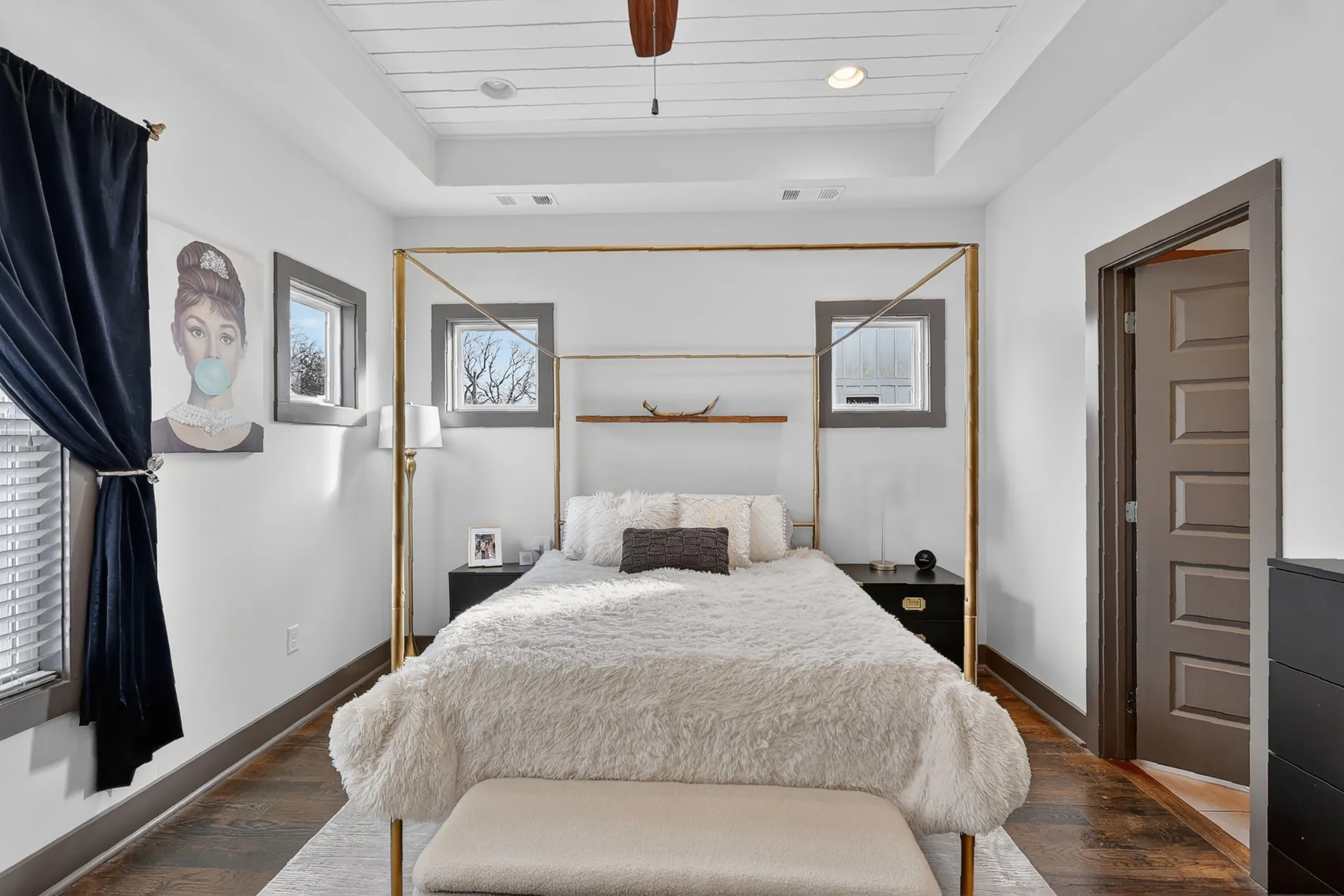 Upstairs, all bedrooms are thoughtfully tucked away, creating a true retreat from the energy below. The primary suite features a dramatic coffered tray ceiling with warm wood detail and an extra-large spa-inspired walk-in shower that feels straight out of a magazine. Every detail is polished, modern, and move-in ready.