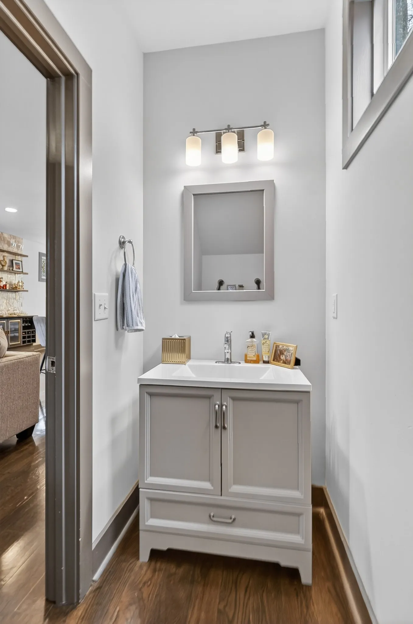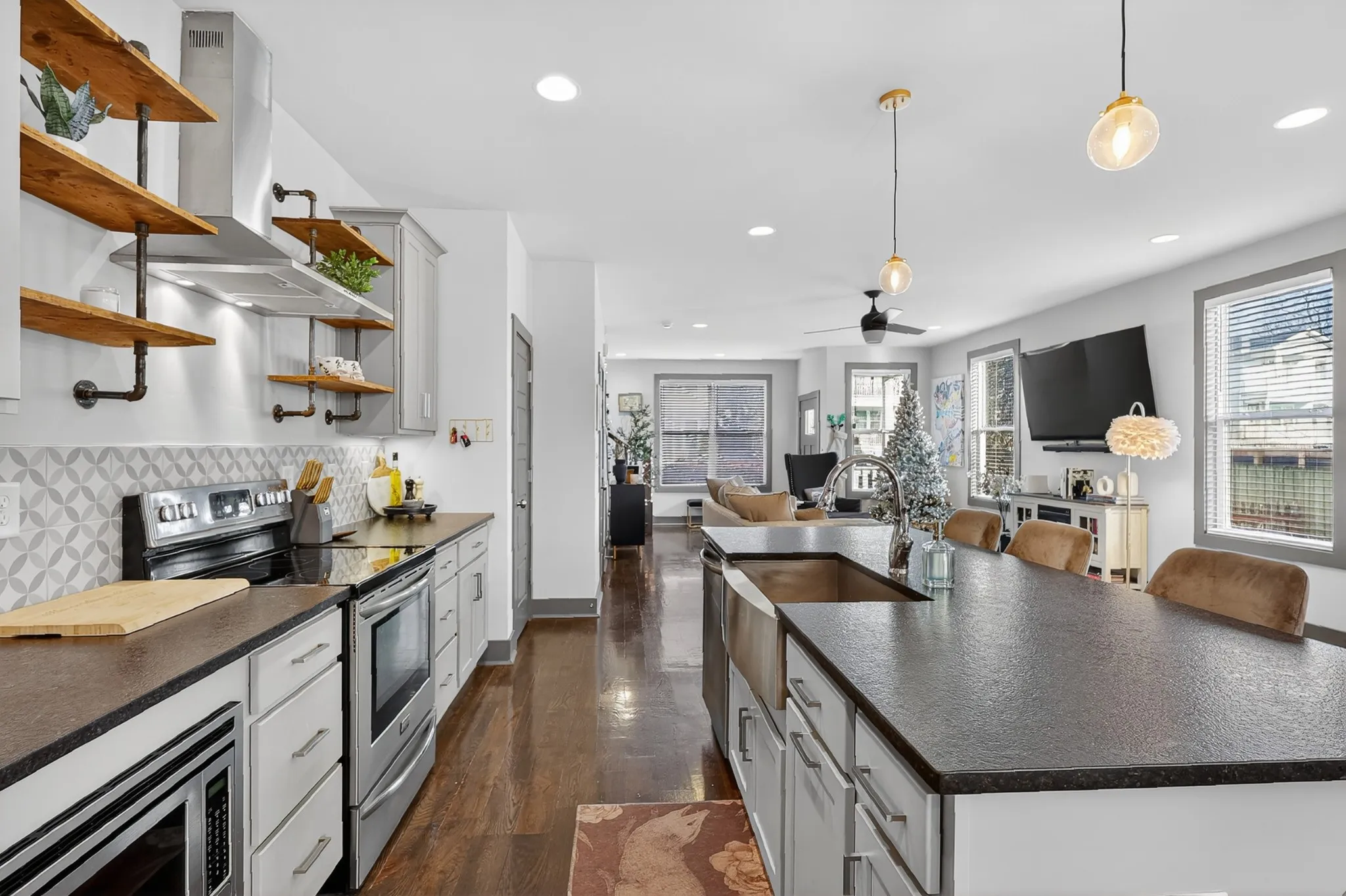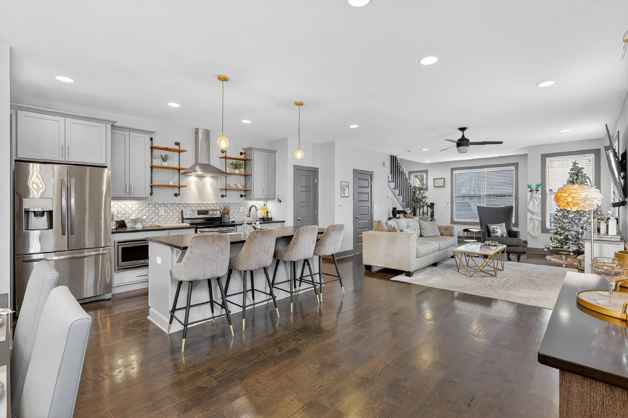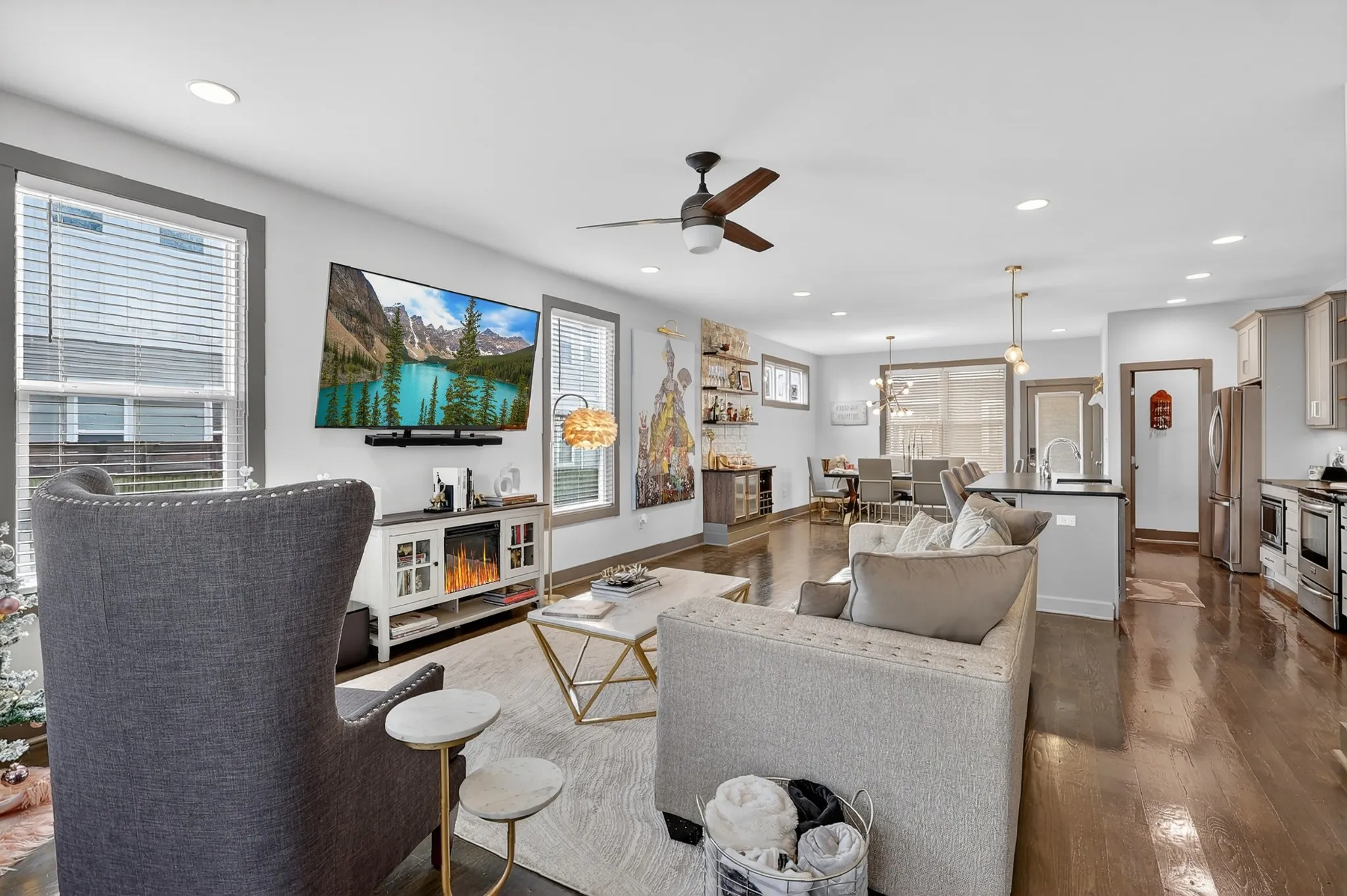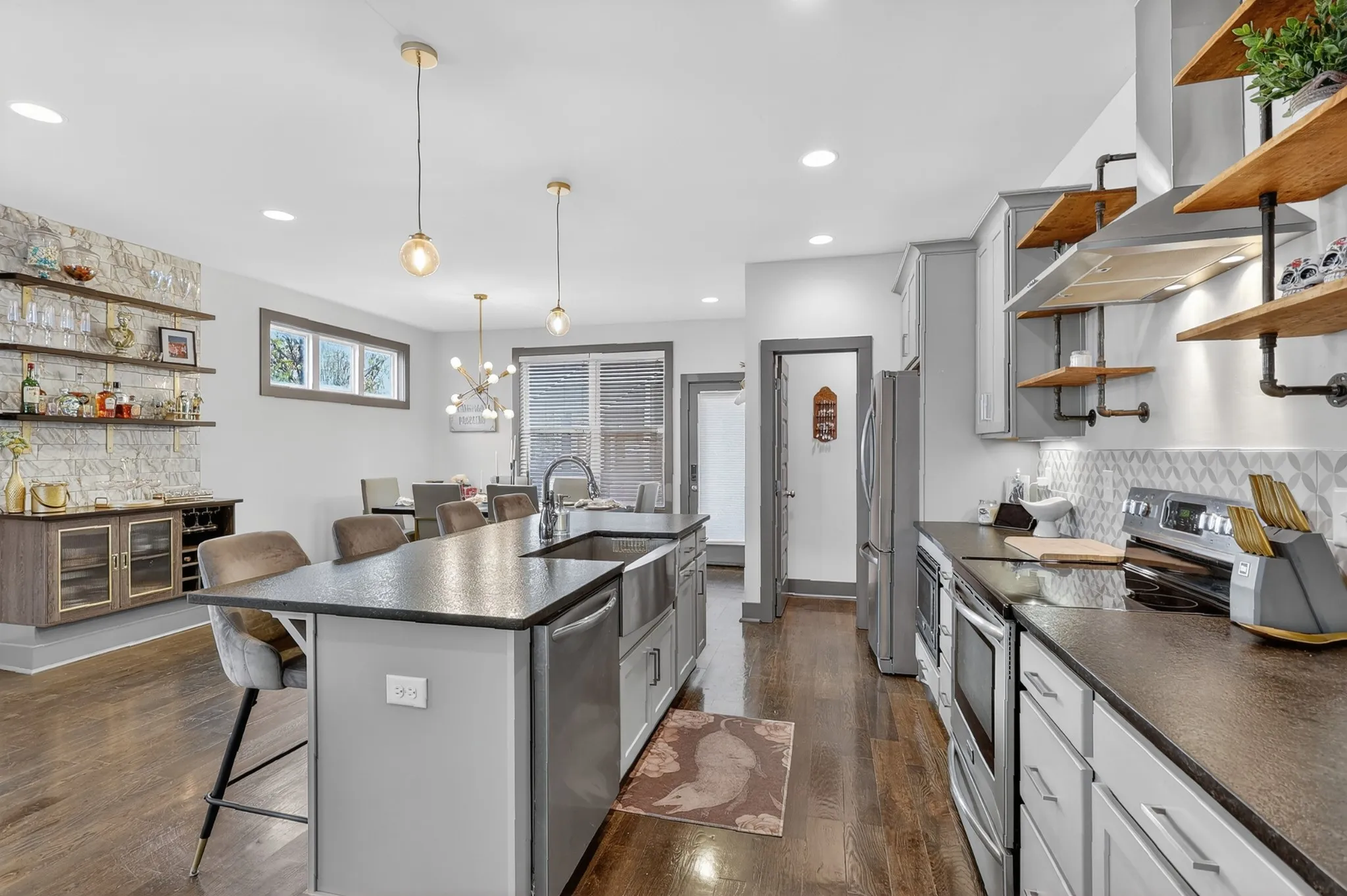 Step inside and you’re immediately elevated. The open-concept main level welcomes you with natural light, wide-plank hardwoods, and boutique like finishes throughout. The oversized kitchen commands attention with a massive island, modern cabinetry, and plenty of room to entertain with intention. A custom built-in wall bar adds a boutique-hotel edge — perfect for toasting to playful playlists w/pre-dinner cocktails before heading downtown.