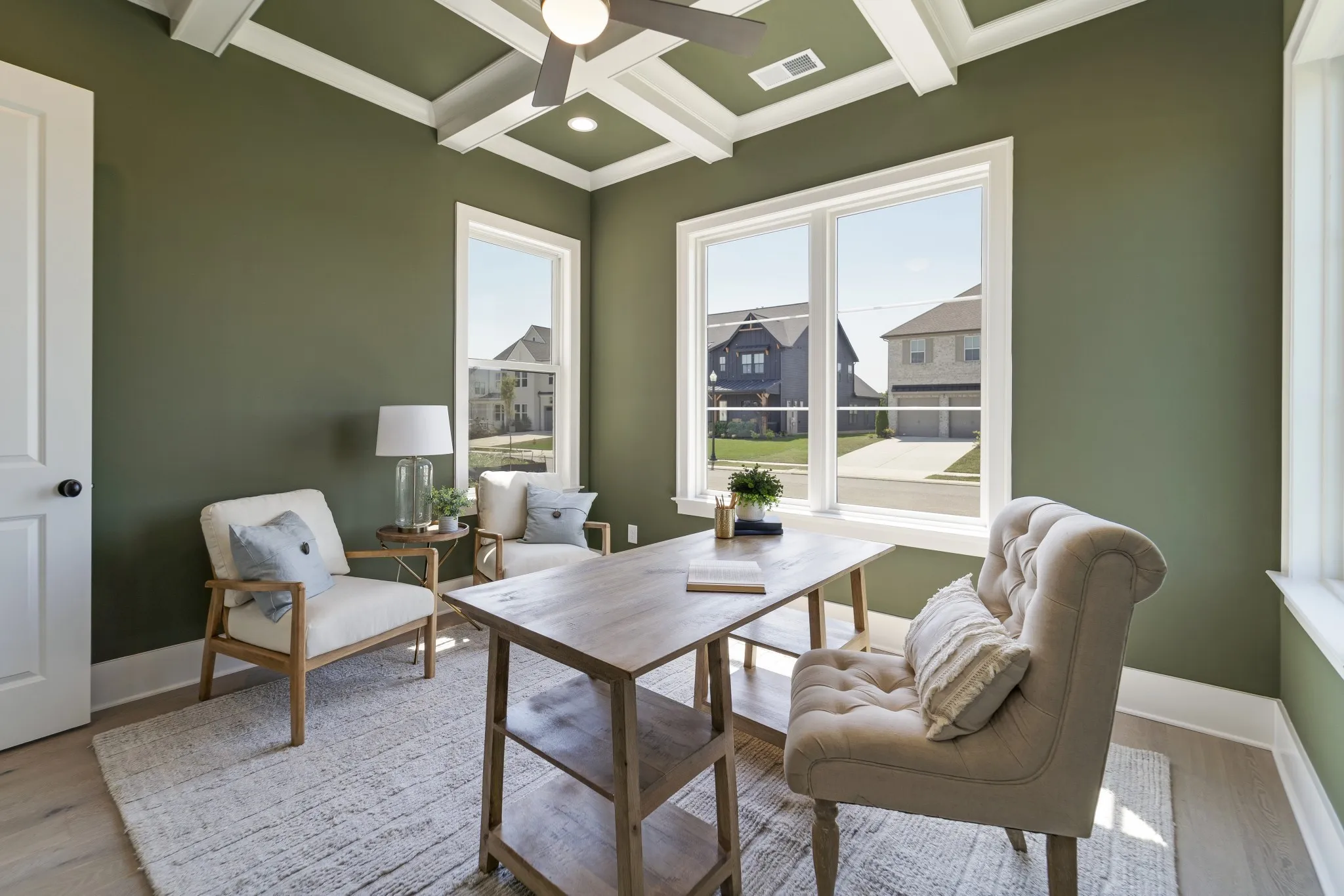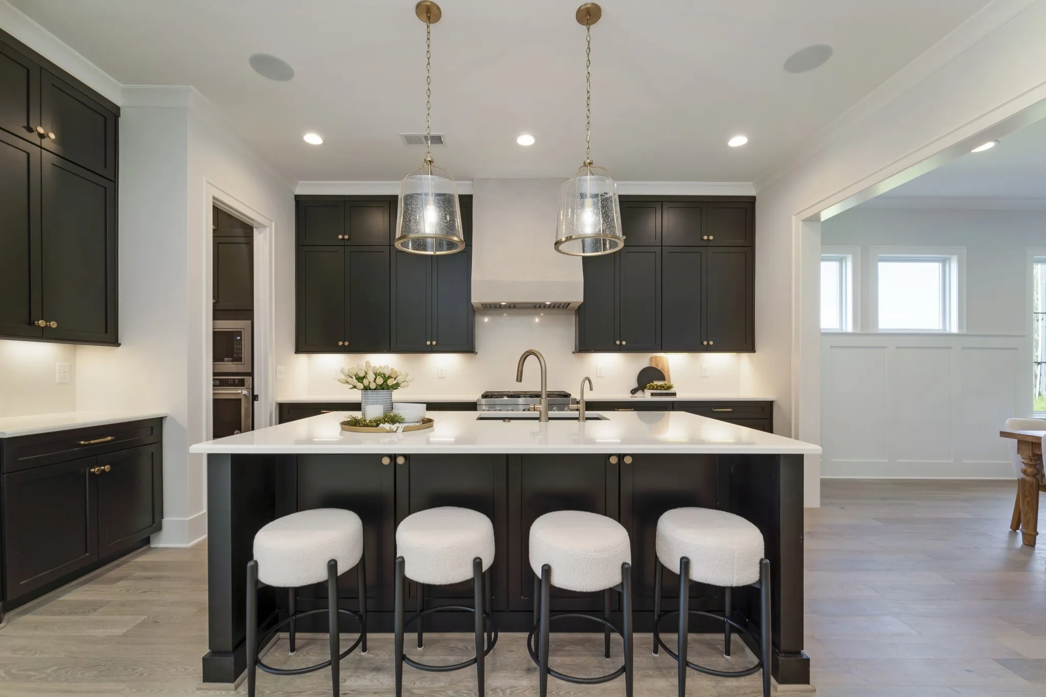The heart of this exceptional home is its Gourmet Kitchen, featuring premium KitchenAid appliances and a functional working pantry, seamlessly connected to an Informal Dining Room that opens to the Great Room—an ideal arrangement for both everyday living and sophisticated entertaining. Step outside to the expansive 12’x23′ Covered Rear Porch, thoughtfully equipped with a Privacy TV Wall and Ceiling Heaters for year-round outdoor enjoyment.