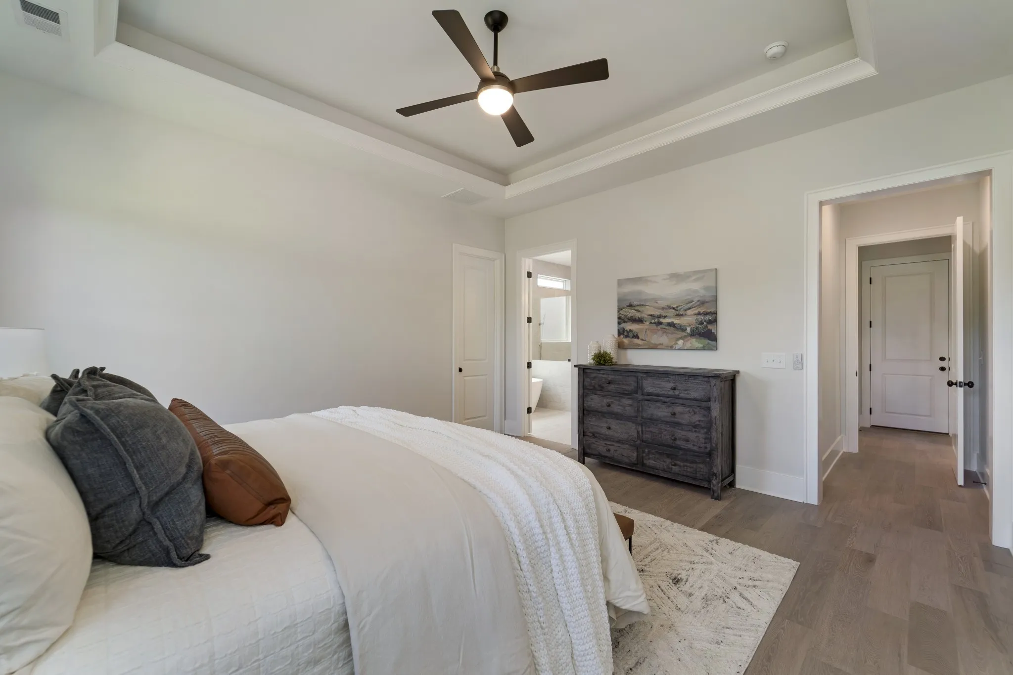Discover exceptional living in this custom-built Woodridge Homes residence in the prestigious Thomas Downs community. This executive home features soaring 10′ ceilings, elegant 8′ doors, and gorgeous wide-plank hardwood flooring throughout. The thoughtfully designed open layout showcases a stunning full glass wall in the Great Room, creating a light-filled, airy atmosphere. Enjoy the convenience of main-level living with a luxurious Primary Bedroom Suite and versatile Home Office/Flex Room on the first floor. The upper level offers four additional Bedrooms and a spacious Bonus Room, perfect for family living or entertaining guests.