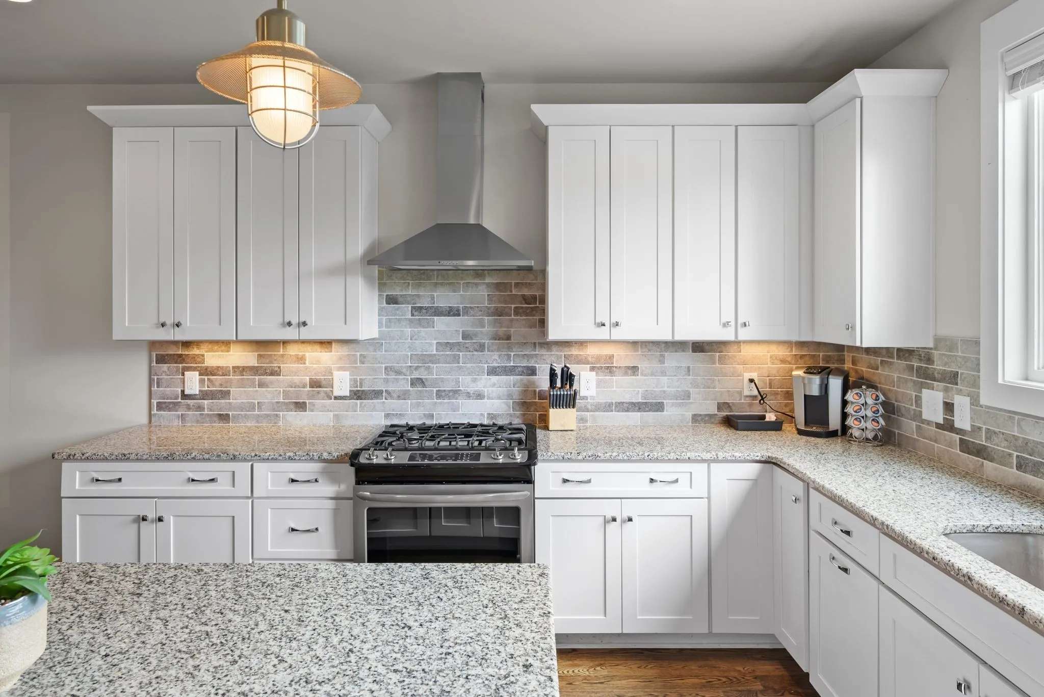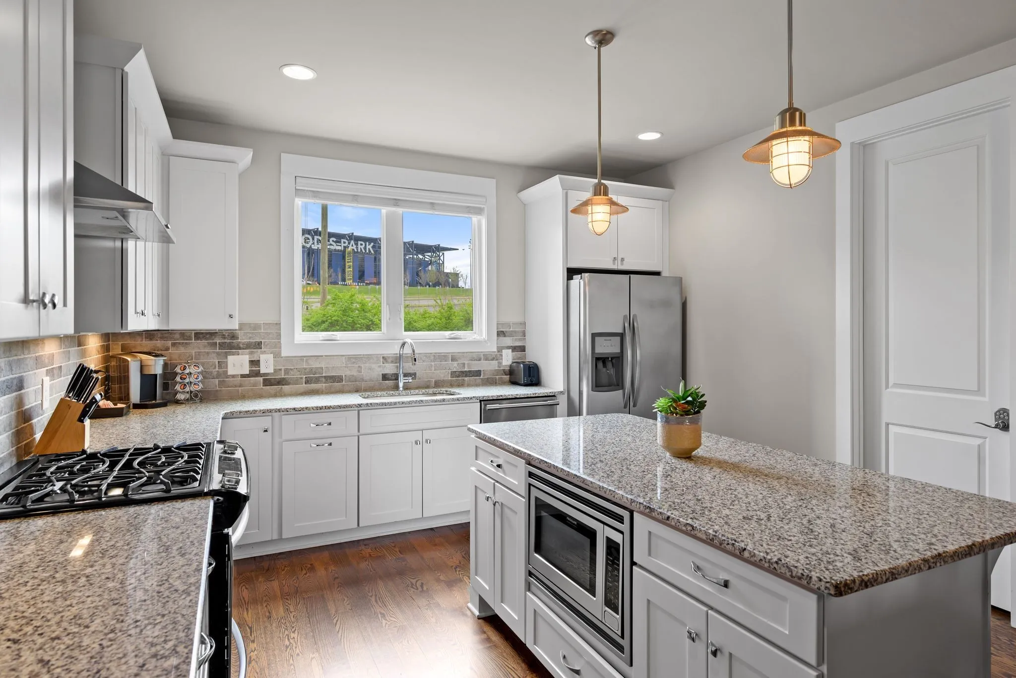 Interior features include hardwood floors on the upper levels, stained concrete on the main level, granite countertops throughout, tile bathrooms, and a well-equipped kitchen with gas range, stainless appliances, under-cabinet lighting, tile backsplash, and oversized pantry/storage.
