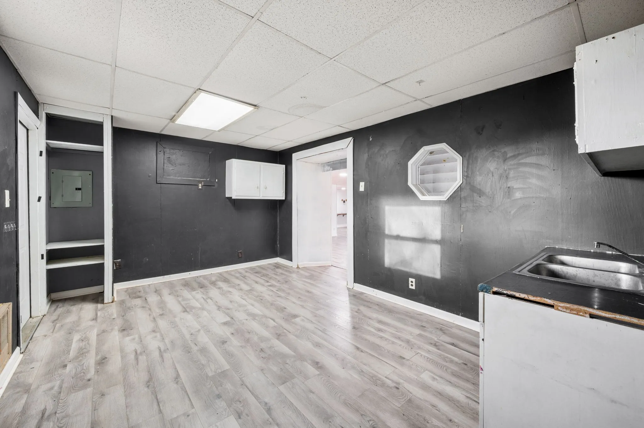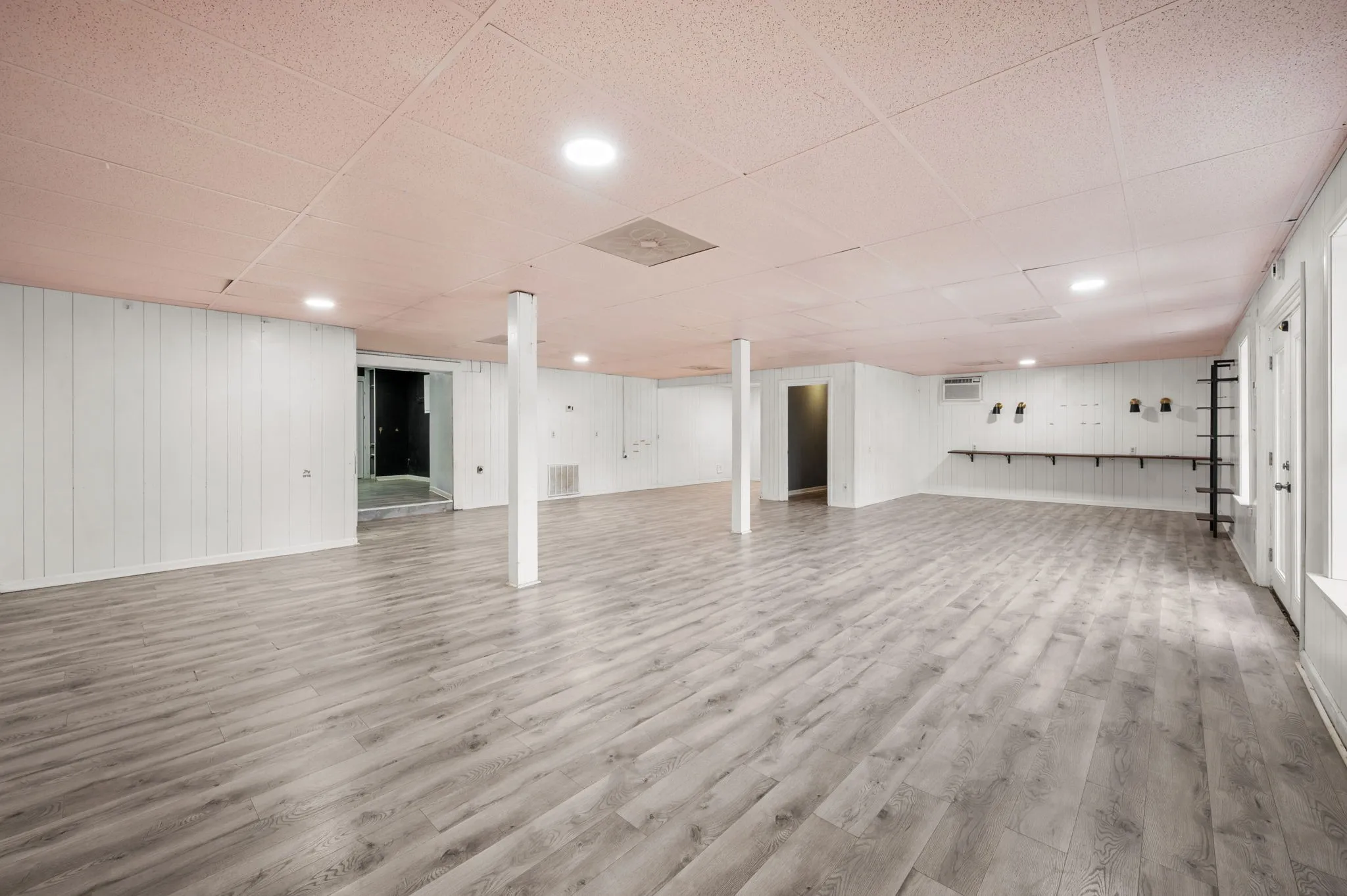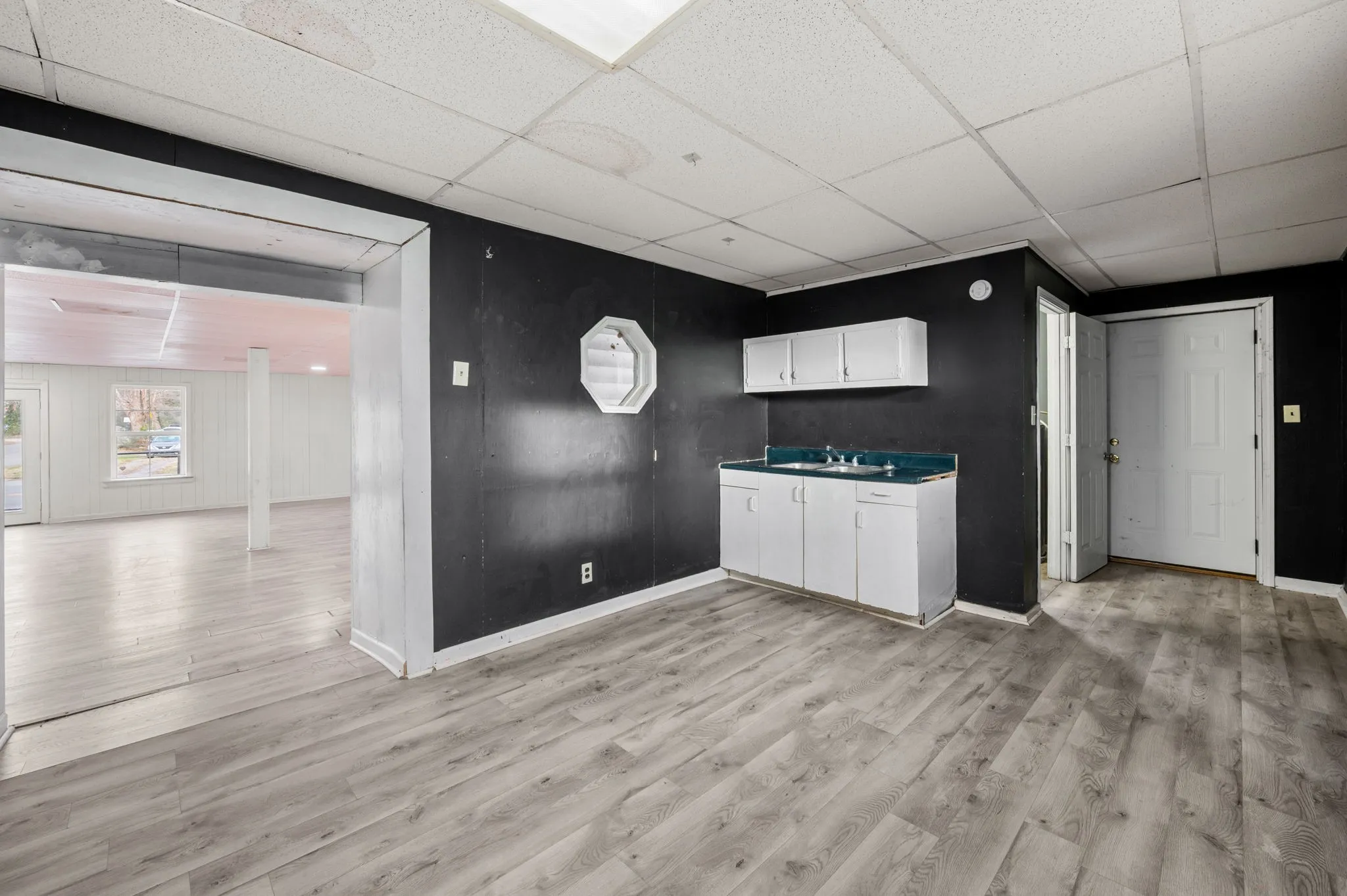 Toward the back of the space is a secondary room perfect for an employee kitchen, break area, or private workspace. This area includes a sink, storage cabinetry, and countertop space for added convenience. A rare bonus in commercial rentals, this section also features a full bathroom complete with a shower, toilet, and single-sink vanity, offering additional flexibility for businesses that benefit from onsite facilities.