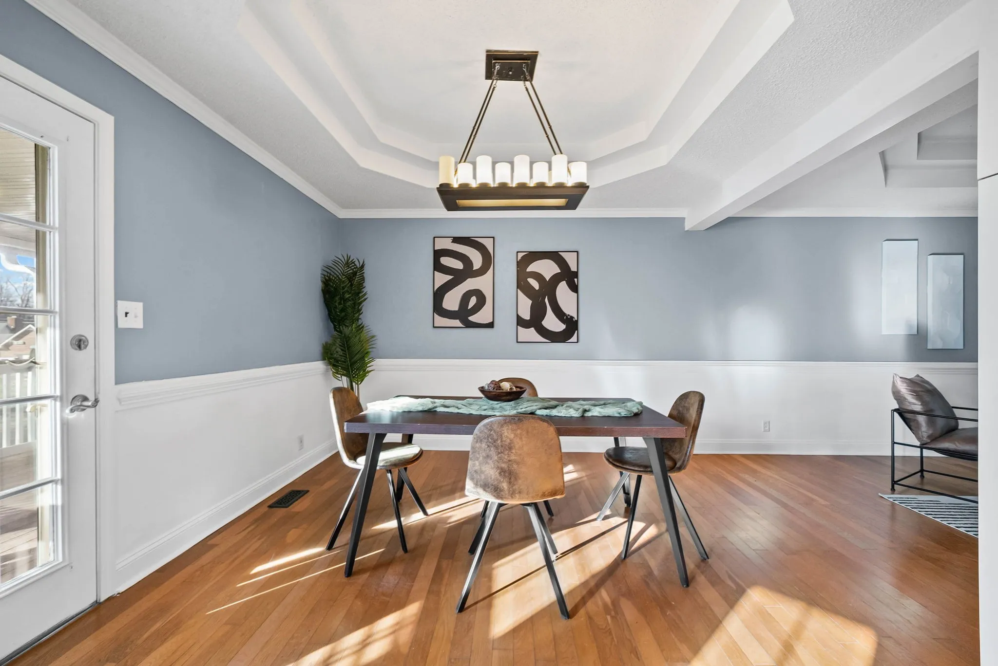 Welcome home to this charming three-bedroom, two-bath home with a full finished basement. Situated on a spacious lot, the inviting front porch is perfect for enjoying morning coffee, sunsets, or simply relaxing outdoors. Inside, you’ll find beautiful hardwood floors, tray ceilings, and a large eat-in kitchen with abundant cabinet and counter space. The primary suite includes a full bath, creating your own private retreat. The home also features a generous two-car garage/workshop, complete with built-in cabinets and even a functioning urinal. The fully finished basement offers versatile space and a built in wet bar—ideal for entertaining or working from home.Step out back to enjoy the expansive deck, complete with a brand-new built in hot tub for your own relaxing retreat.