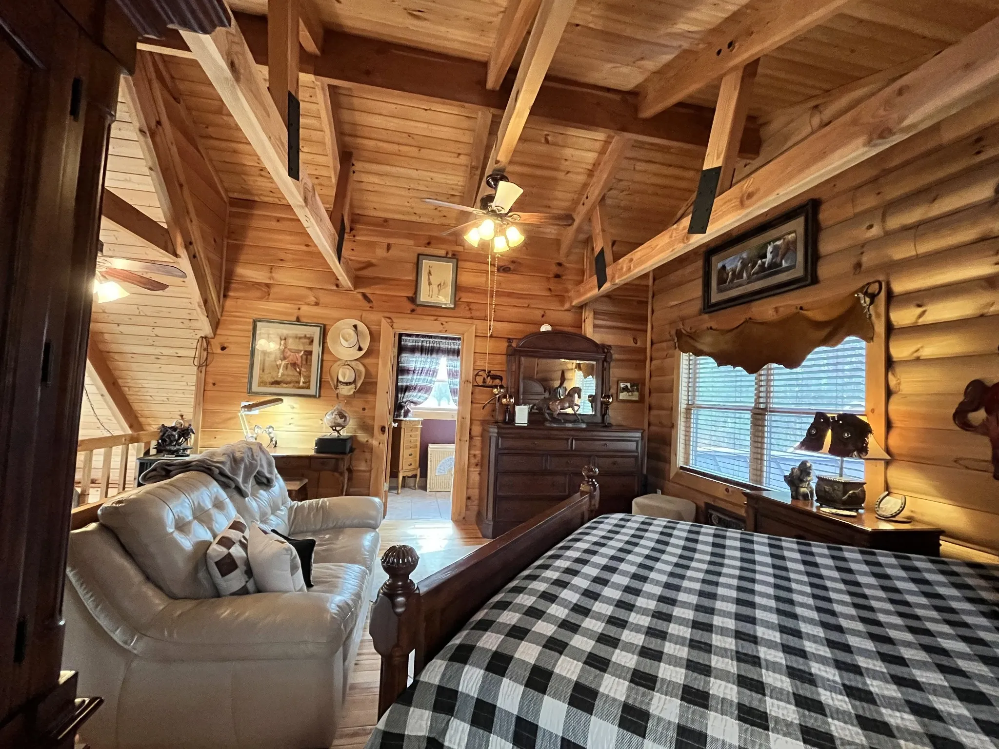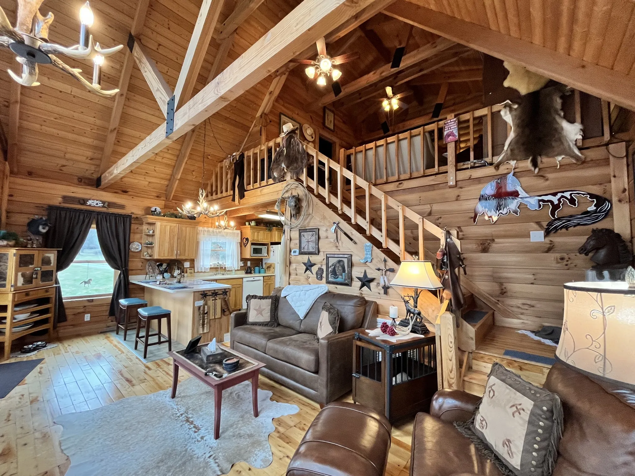 Remarkable Honest Abe Custom Log Home with a Gatlinburg cabin flair in Crossville TN. It is set way back off the road to provide for a peaceful and tranquil setting. It has true log cabin construction with ‘D’ styled wood siding. As you step inside you will encounter lots of natural light coming through the front windows spanning both stories along with the wooden exposed beams throughout. It provides for an open floor plan with a large stairway that leads up to the 2nd floor Main Bedroom Suite. Cabinets are all wood with pull out shelves in cabinet pantry with Corian kitchen counter tops. Plenty of decorative lighting to help set up the cabin and country feel. The crawl space is installed with a concrete floor for dry storage with support from a dehumidifier. The garage was converted into a dog grooming salon with 2 rooms, plumbing, and its own separate HVAC system in 2019. This established flex area could easily be converted into a guest suite, in-law or efficiency apartment. This area is connected to main home via a covered breezeway and deck. Great view of the mountains that can help stimulate needed relaxation. The land is fairly level throughout and open although surrounded by trees and could be lined with a fence for a home for your horses or to just plain enjoy the setting for your own private vacation retreat. The matching shed will remain and has its own electricity along with a frost free water spigot for your animals, irrigation, etc. This property is a great retreat that provides for wonderful sun rises over the mountains making it inviting to stay forever. It is a unique and well maintained property.