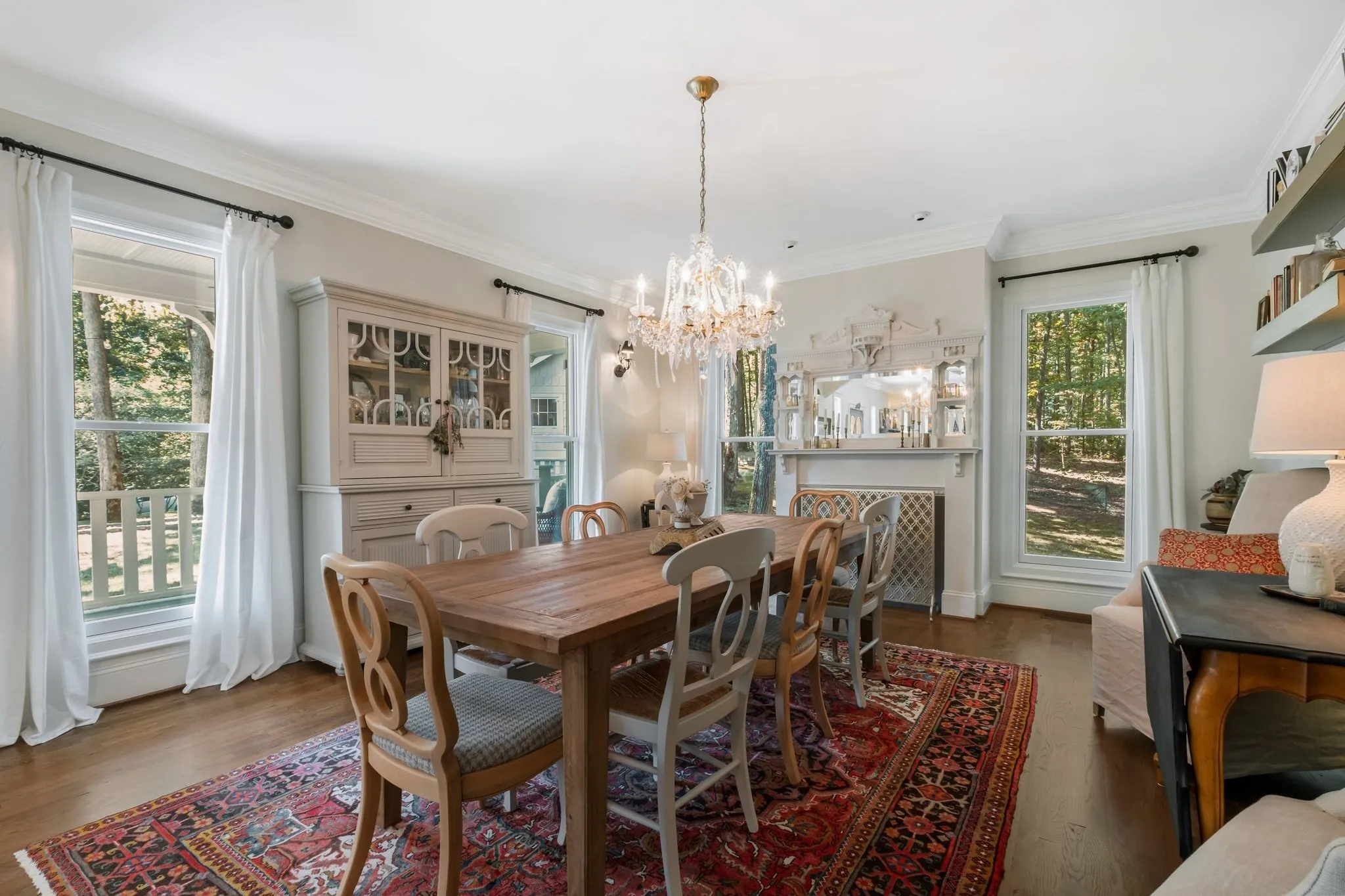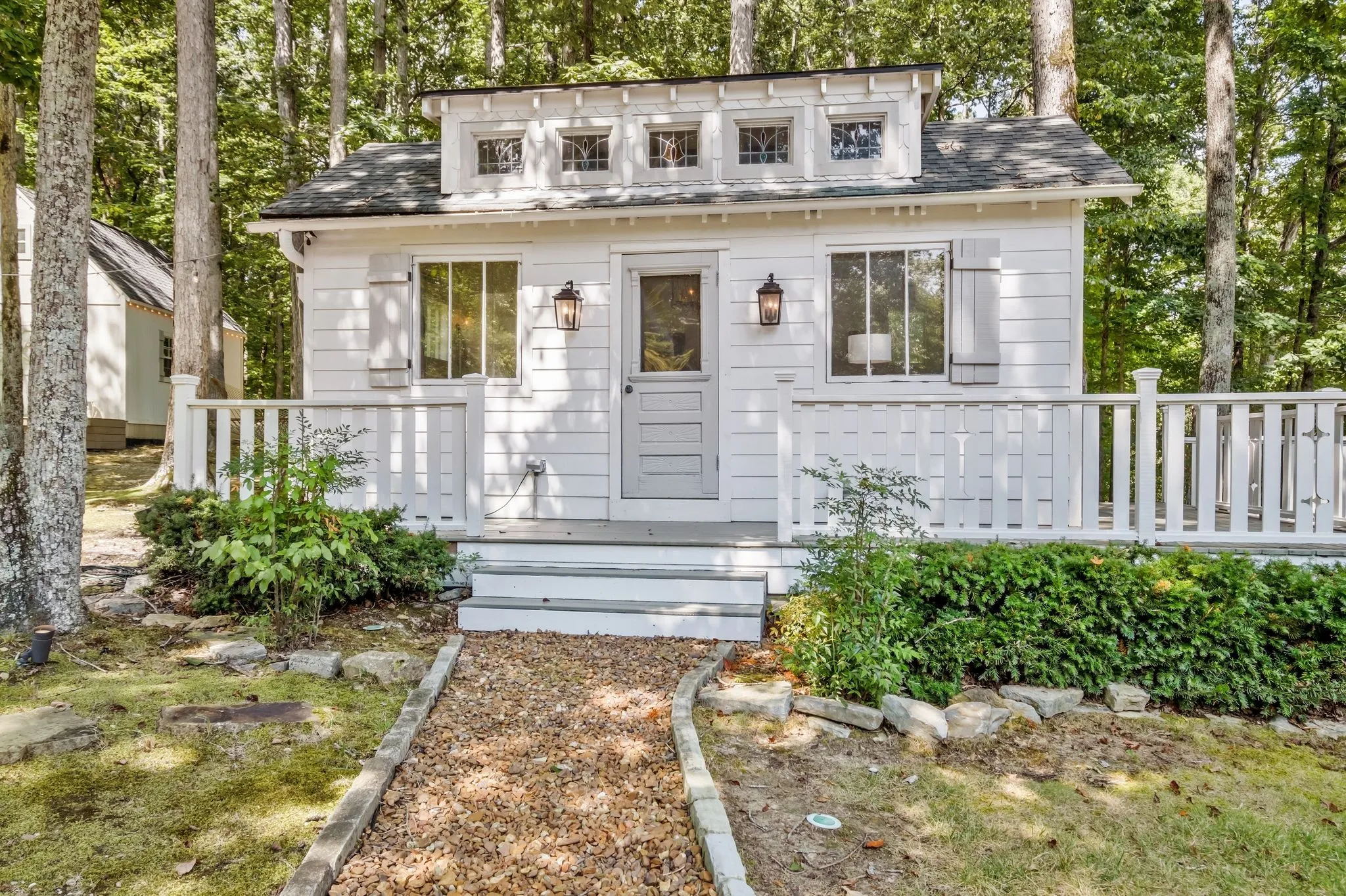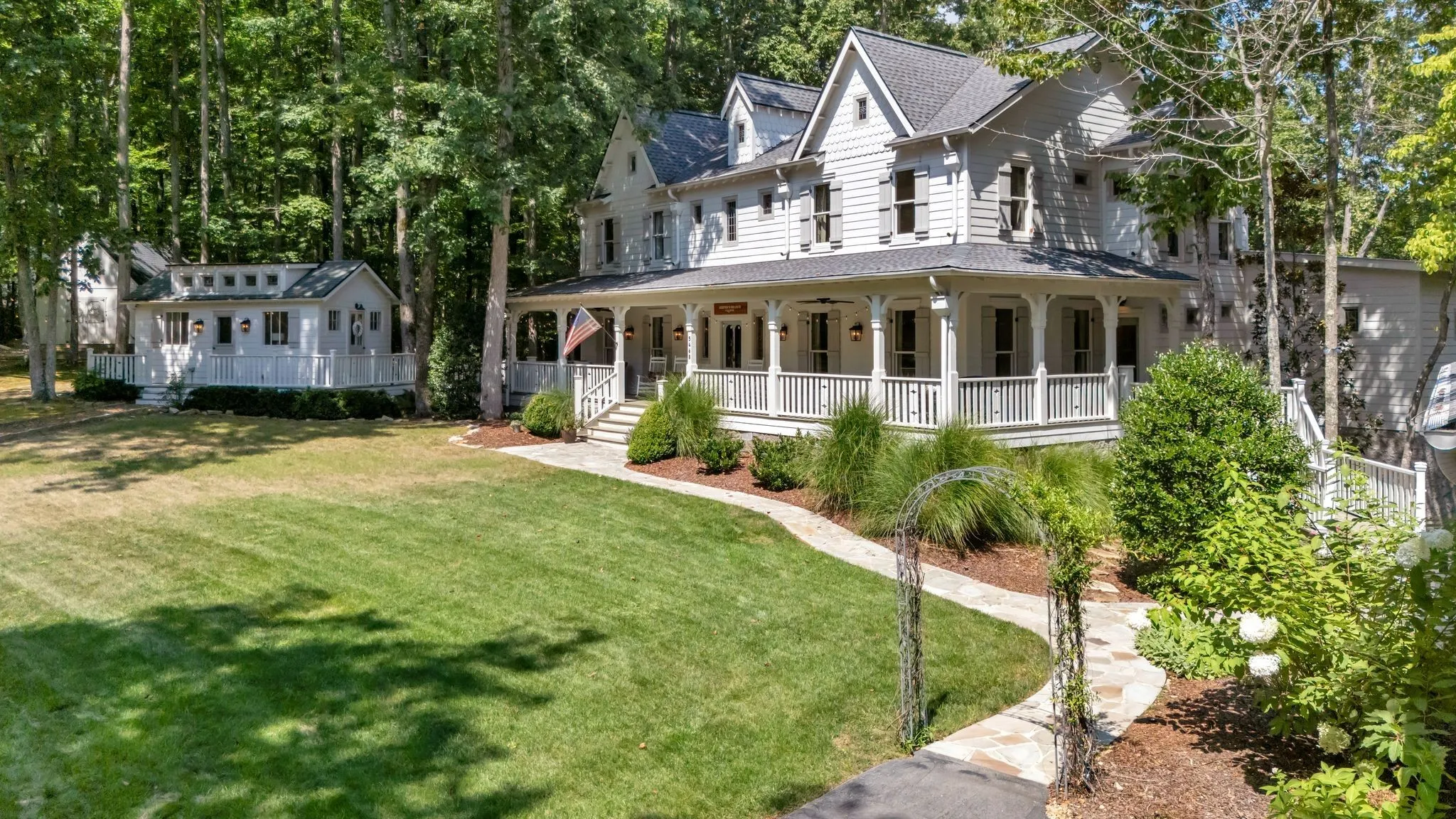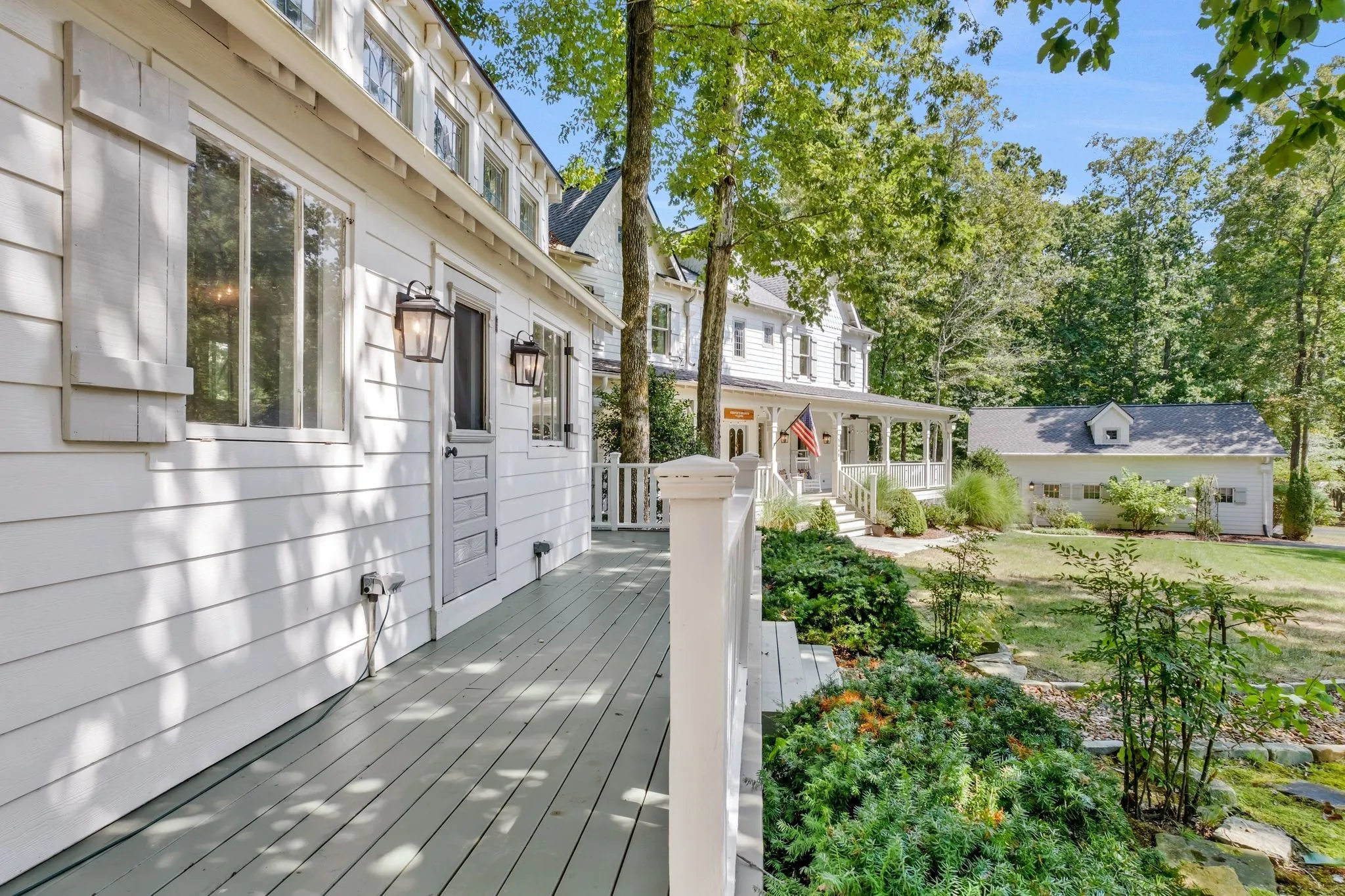 Tucked down a private winding road with trees lined on each side, sits a Victorian Farmhouse, the kind books are written about. The home features 3 floors with multiple living spaces and nooks for reading and dreaming. High ceilings and abundant natural light. Multi level decking, wrap around covered porches for early morning lovers. A swim spa. European Stain glass windows, an imported front door, and 4 fireplace mantles – each carefully curated and over 100 yrs old. The detailed molding, antique hardware, striking chandeliers, and solid hardwood floors draw you in.